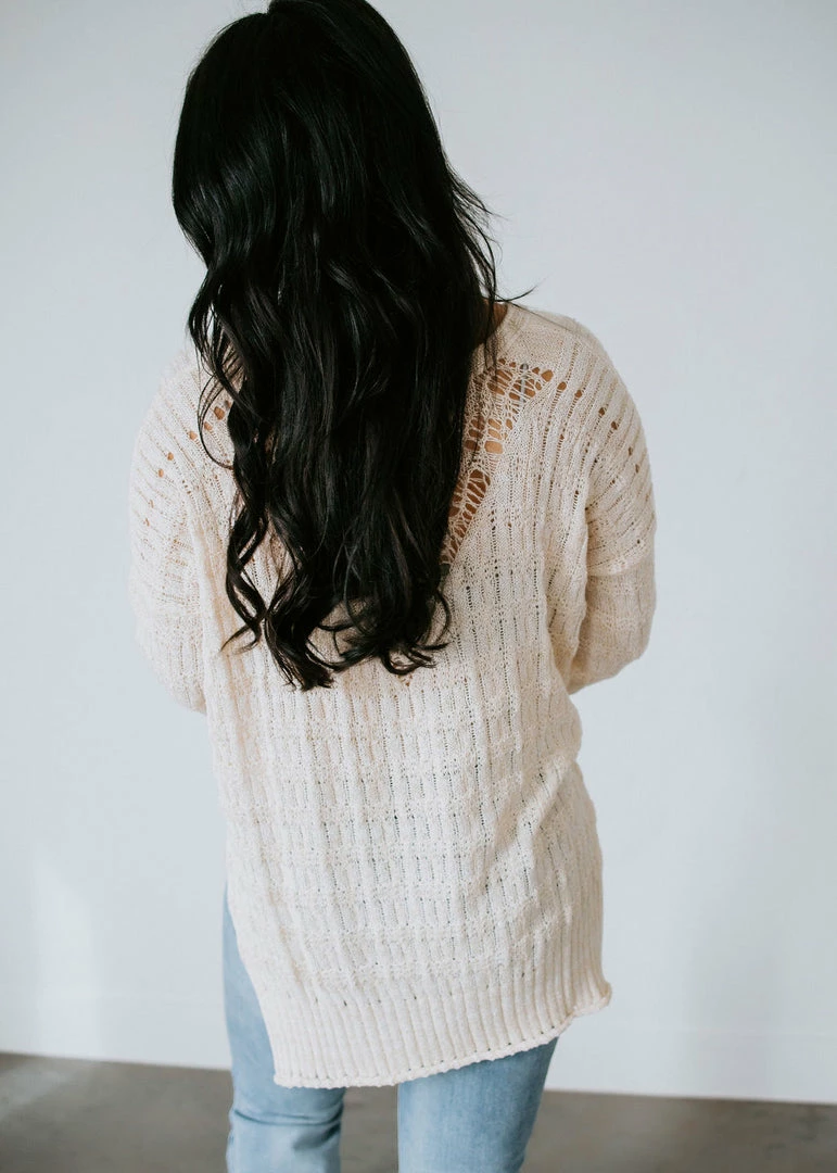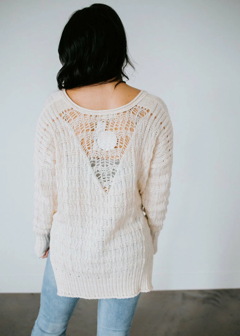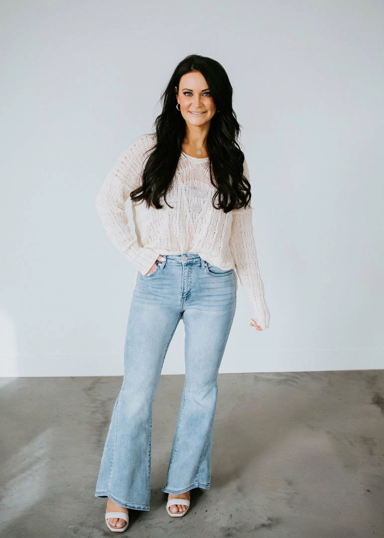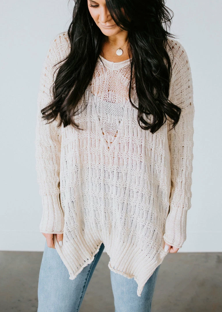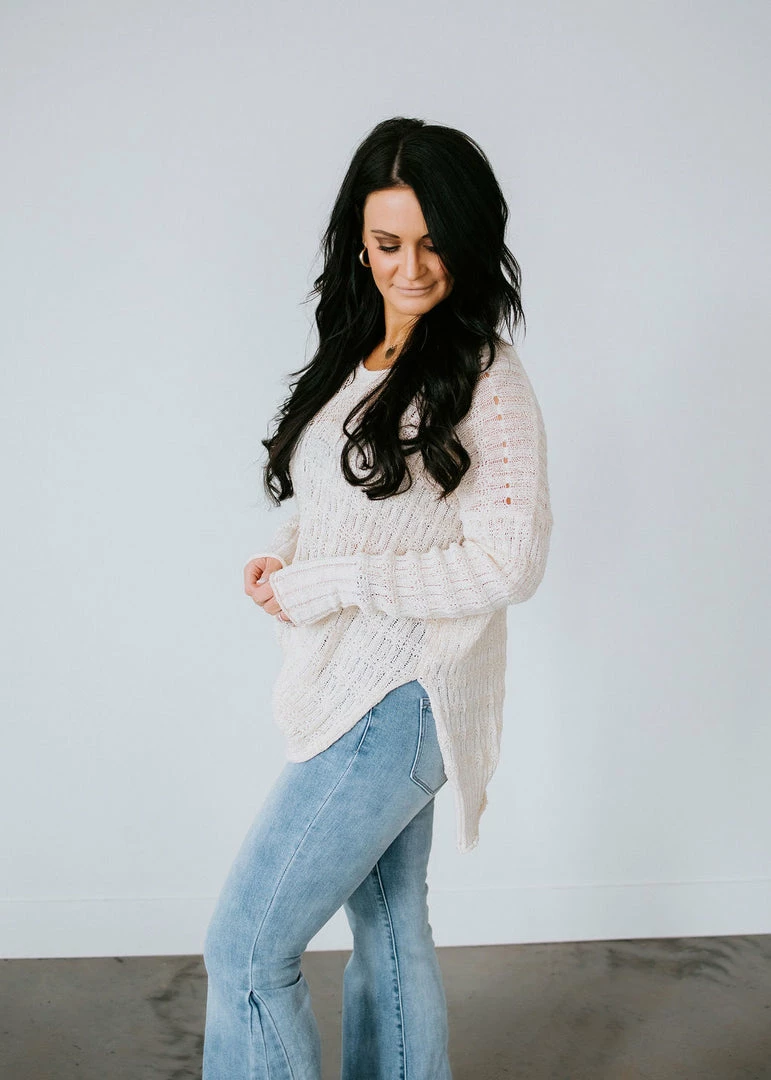 How fun is this new sweater?! Designed in a poly fabric, this semi sheer, knit sweater will be a fast favorite for the warmer weather ahead. Features cinched sleeves, an oversized bodice, complete with open stitching. Pair tucked into a wide leg denim jean with a fun boho-inspired belt to complete the look. Laurie is wearing a small.