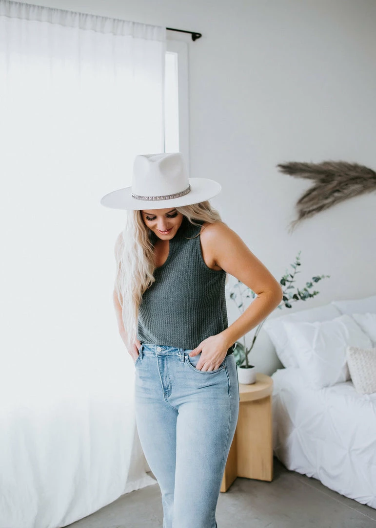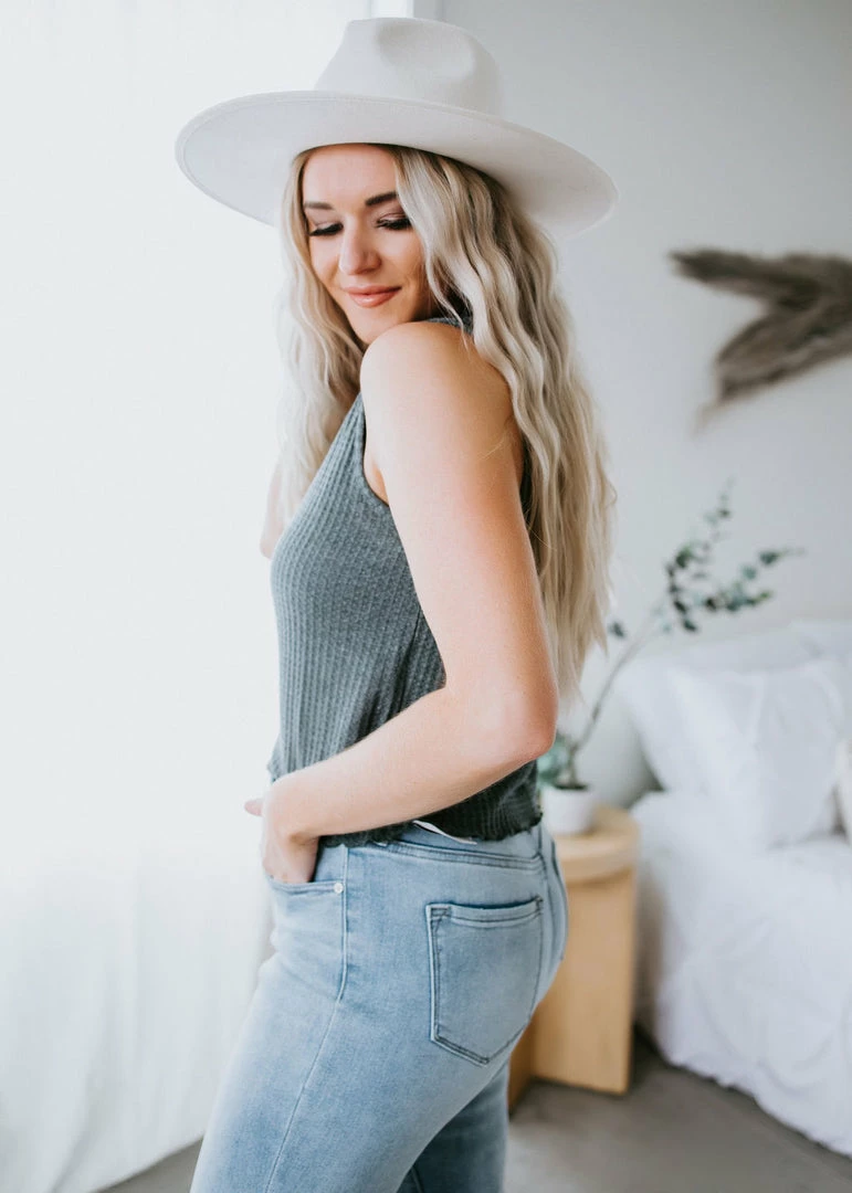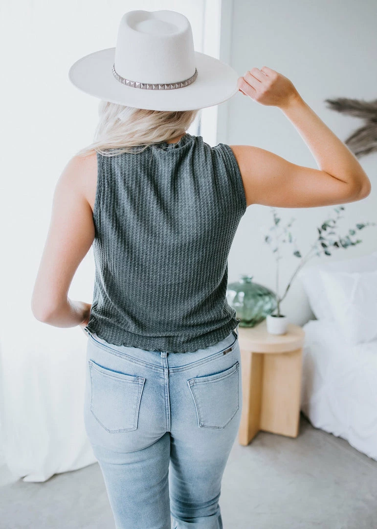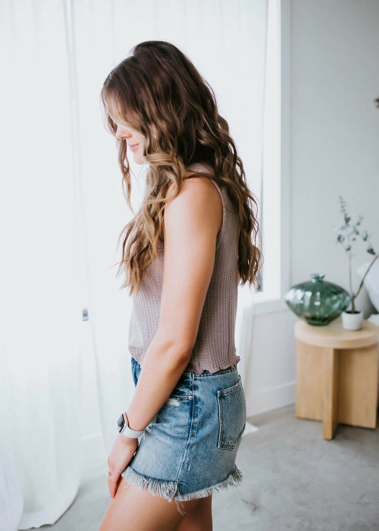 A spring and summer staple that we all need in our closet! This sleeveless top features a cut-out neckline detail in the front, a slightly cropped silhouette, with a frill hemline, and ribbed fabric. Pair with a paper bag short and a rancher hat for a summer look. Kaylor is wearing a medium and Kara is wearing a small.