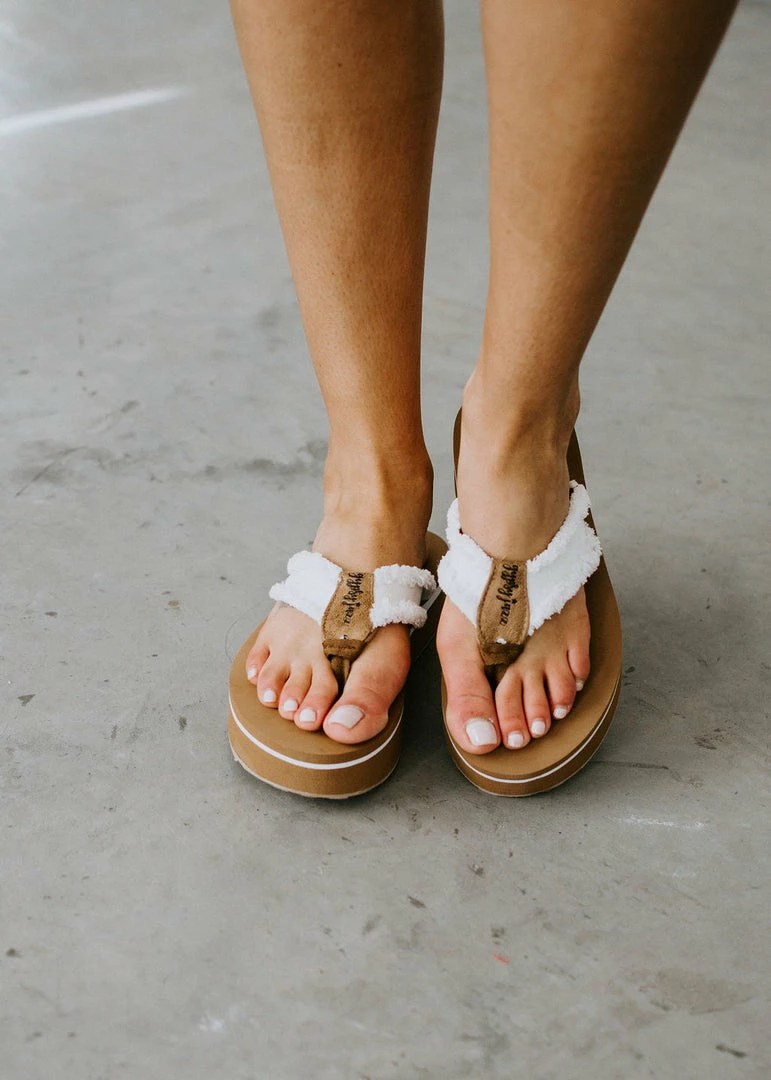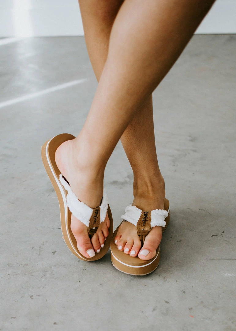 You’ll be walking on sunshine when you’re wearing these platform sandals! Features comfortable thong-style construction with a thick canvas strap, frayed edges, and a branded accent. Includes a flexible synthetic outsole.