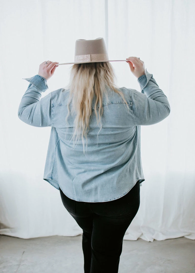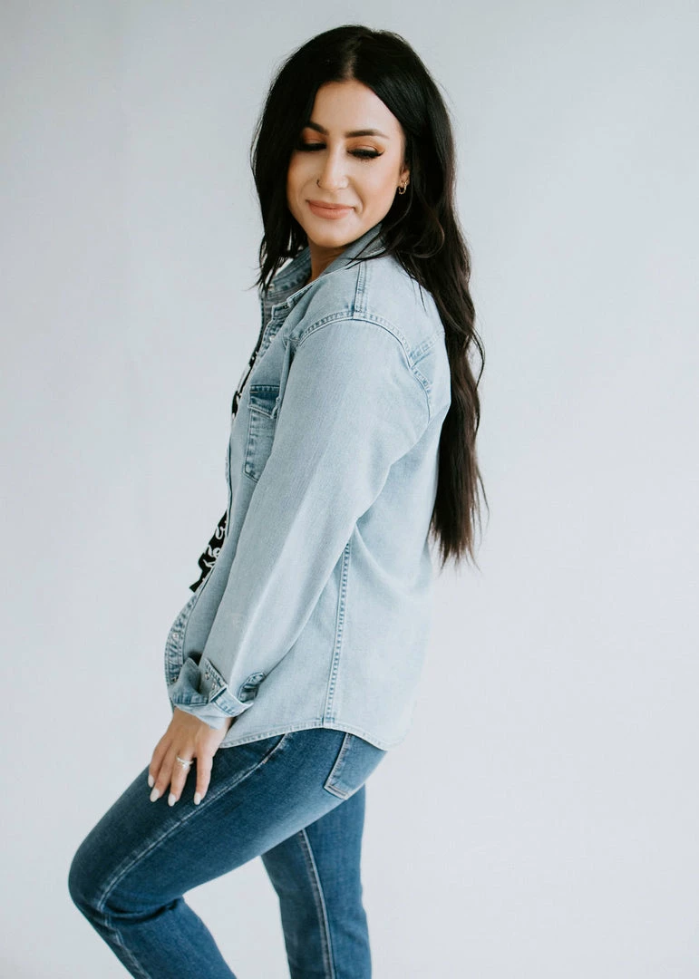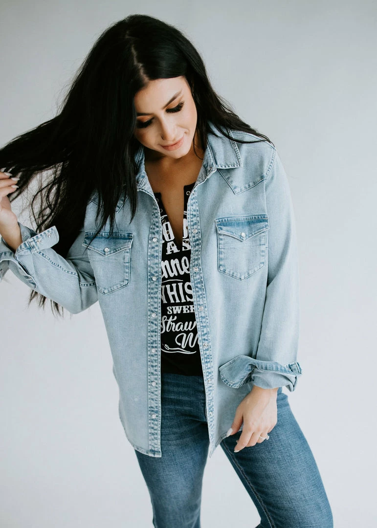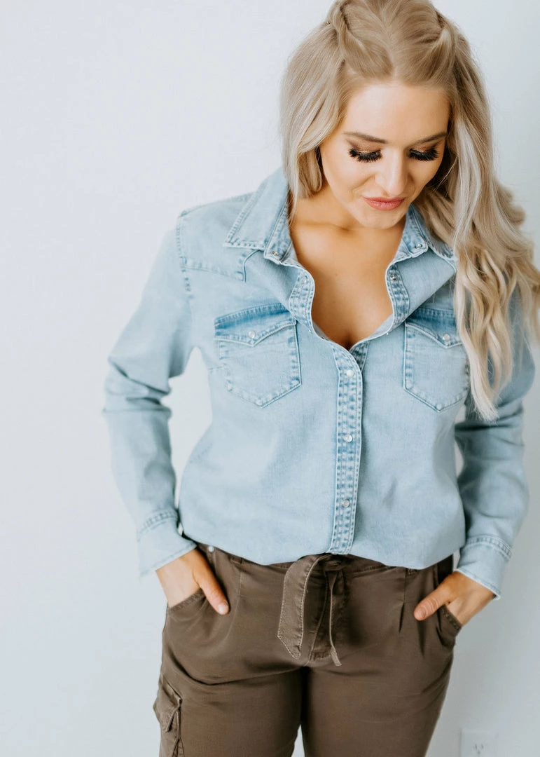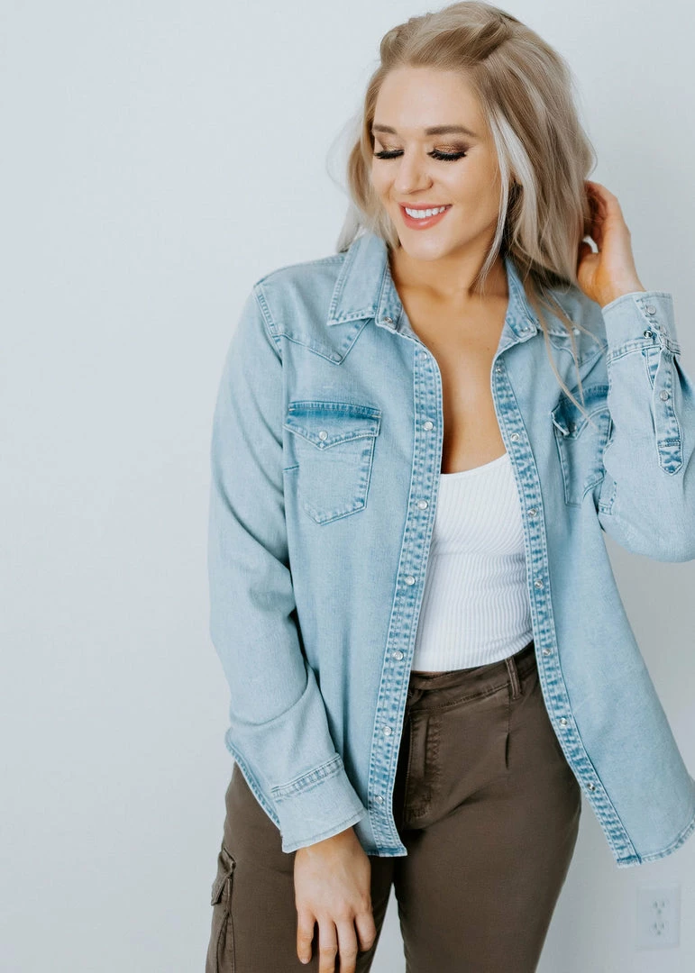 Finally, a denim shirt that has just the right fit (can you say STRETCH?!) and the perfect wash. This button-down denim shirt is so classic and chic. A light wash denim shapes this sturdy cotton shirt that boasts a jacket effect with a collared yoke neckline, chest pockets, long sleeves, and pearl snap button closures. Great option as a shirt or shacket!