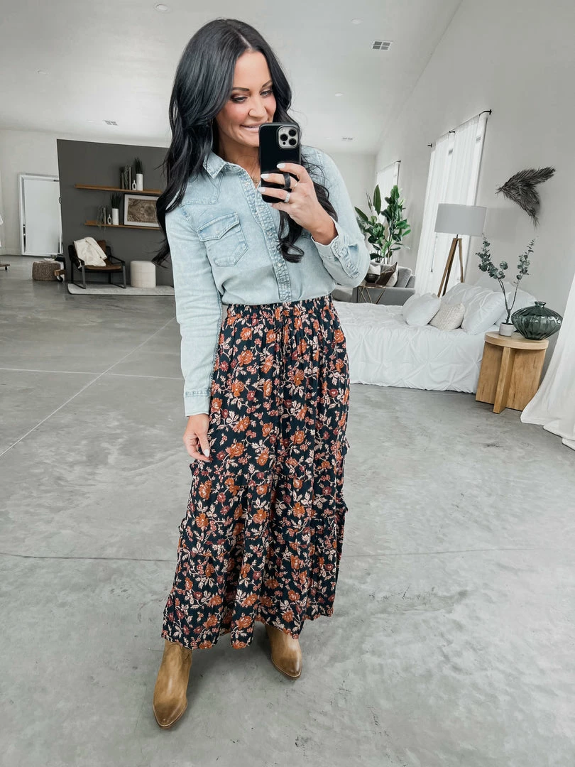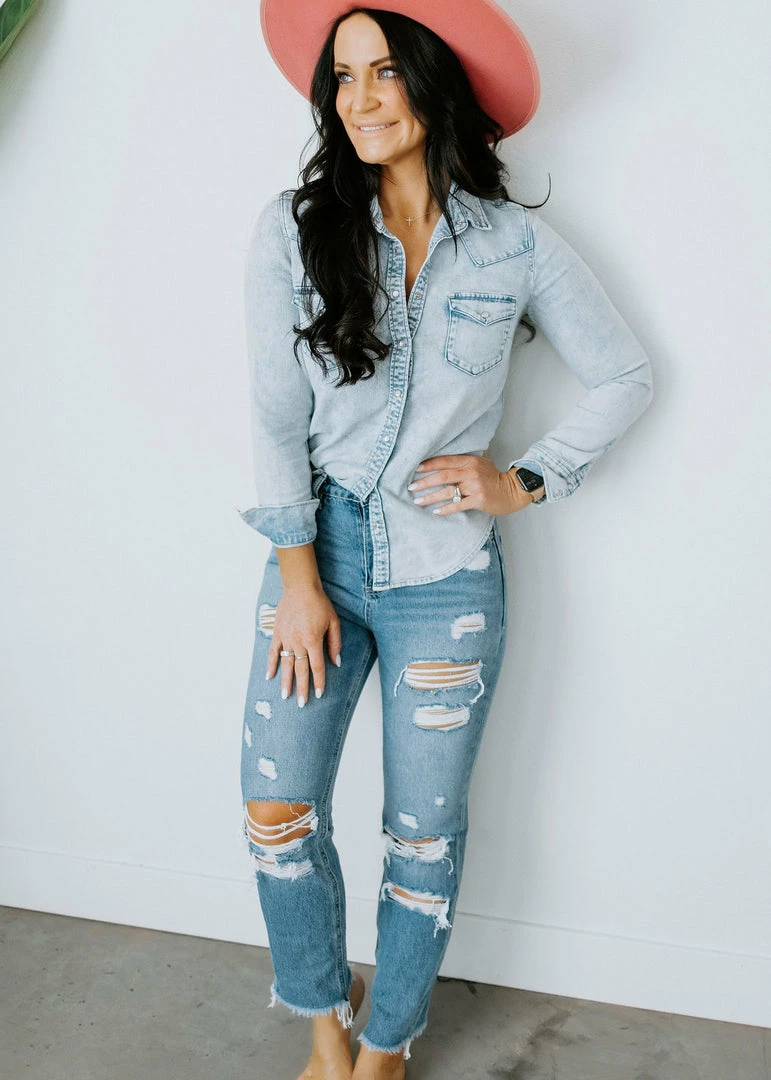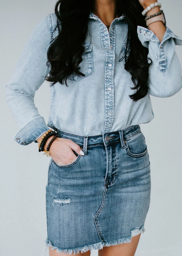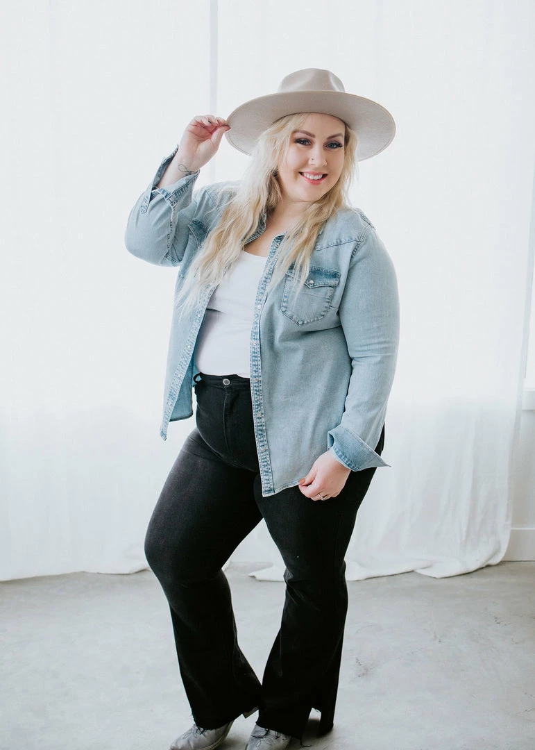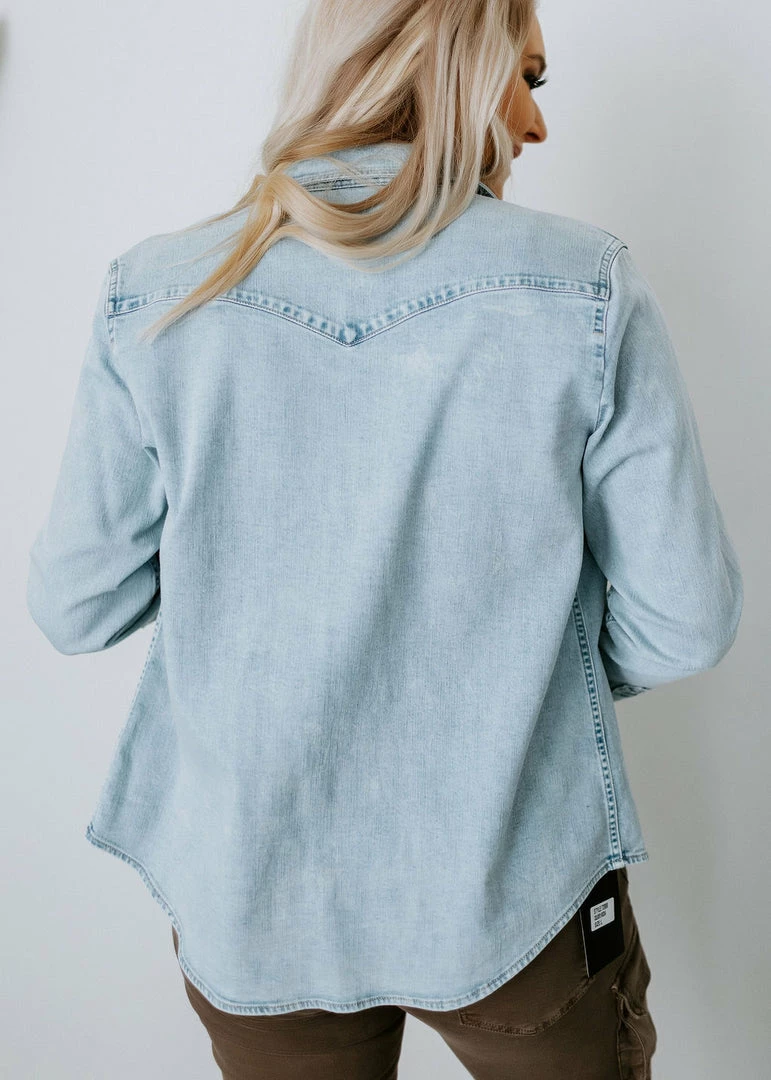 Finally, a denim shirt that has just the right fit (can you say STRETCH?!) and the perfect wash. This button-down denim shirt is so classic and chic. A light wash denim shapes this sturdy cotton shirt that boasts a jacket effect with a collared yoke neckline, chest pockets, long sleeves, and pearl snap button closures. Great option as a shirt or shacket!