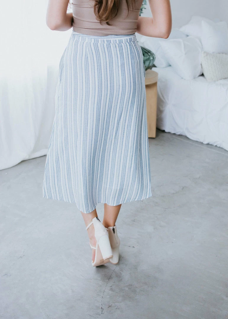 Create moments to remember in this beautiful, breezy skirt. Lightweight and gauzy fabric, with a blue striped pattern, shapes the relaxed, flowy silhouette. Features a button placket in the front, a tassel tie detail at the waist, and two side seam pockets. Pair this midi-length skirt with heels and a summery tote for a lovely look. Kara is wearing a small.