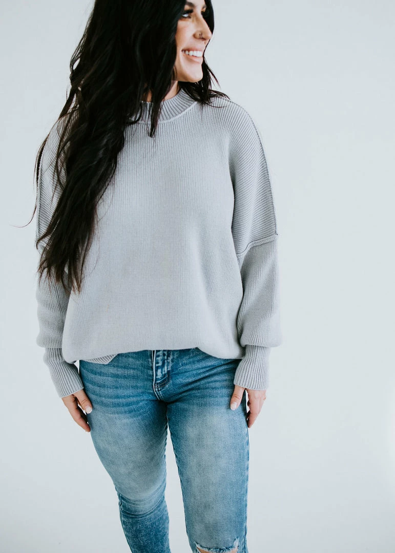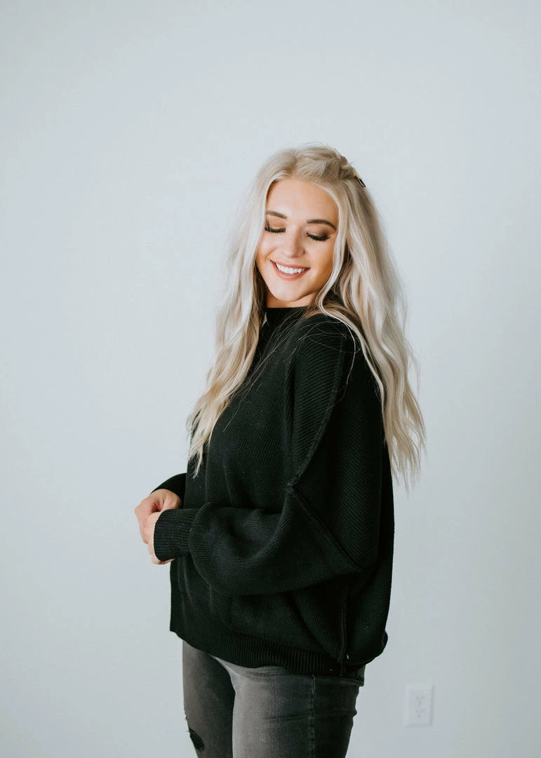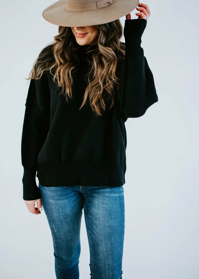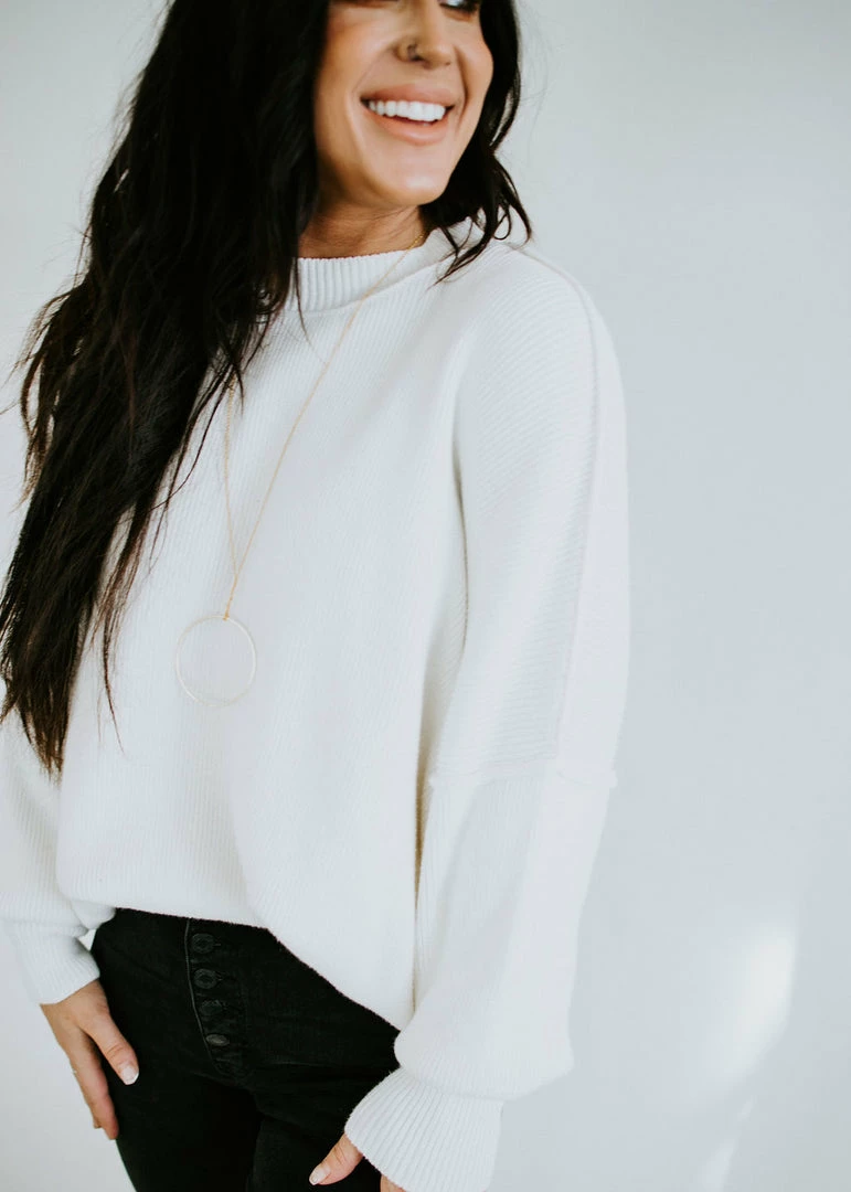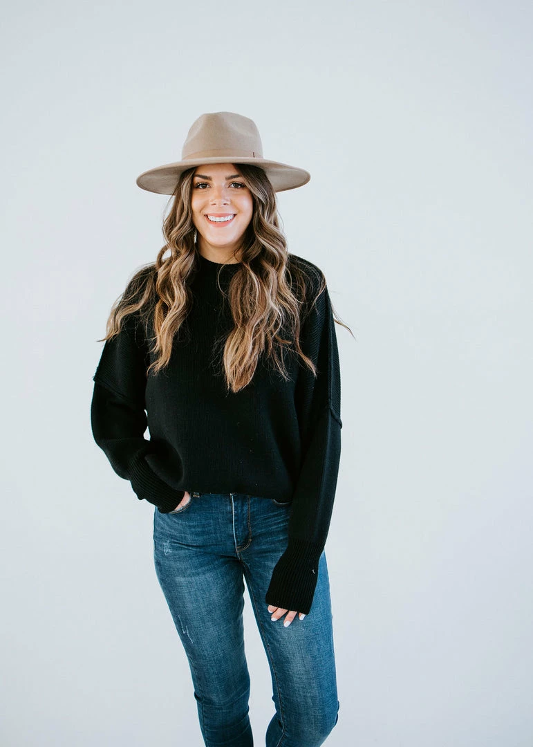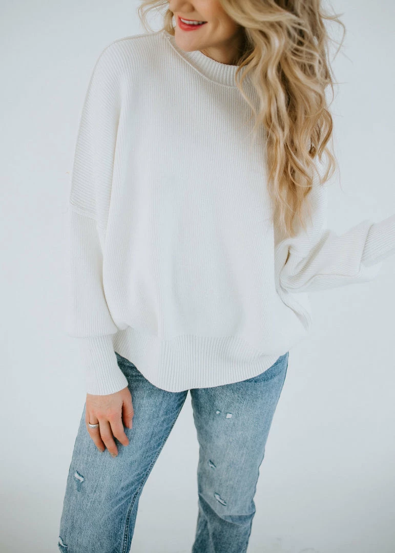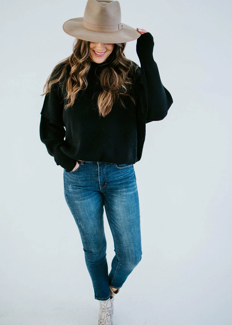 Every closet needs a versatile throw-on-and-go sweater! This Lauriebelles exclusive is the perfect get-cozy style that has been designed by Chelsea DeBoer and Laurie to be your next wardrobe hero. Snuggly ribbed knit shapes the relaxed silhouette that serves up effortless style with luxe comfort. Beautifully constructed with a mock neck, seaming details throughout, and a wide-cut bodice that gently tapers at the waist. Long sleeves are styled with dropped shoulders and end with long fitted cuffs. Pair it with your favorite jeans, ankle booties, and a wide-brimmed hat. Or wear it over a maxi-length dress and boots for a flawless look.