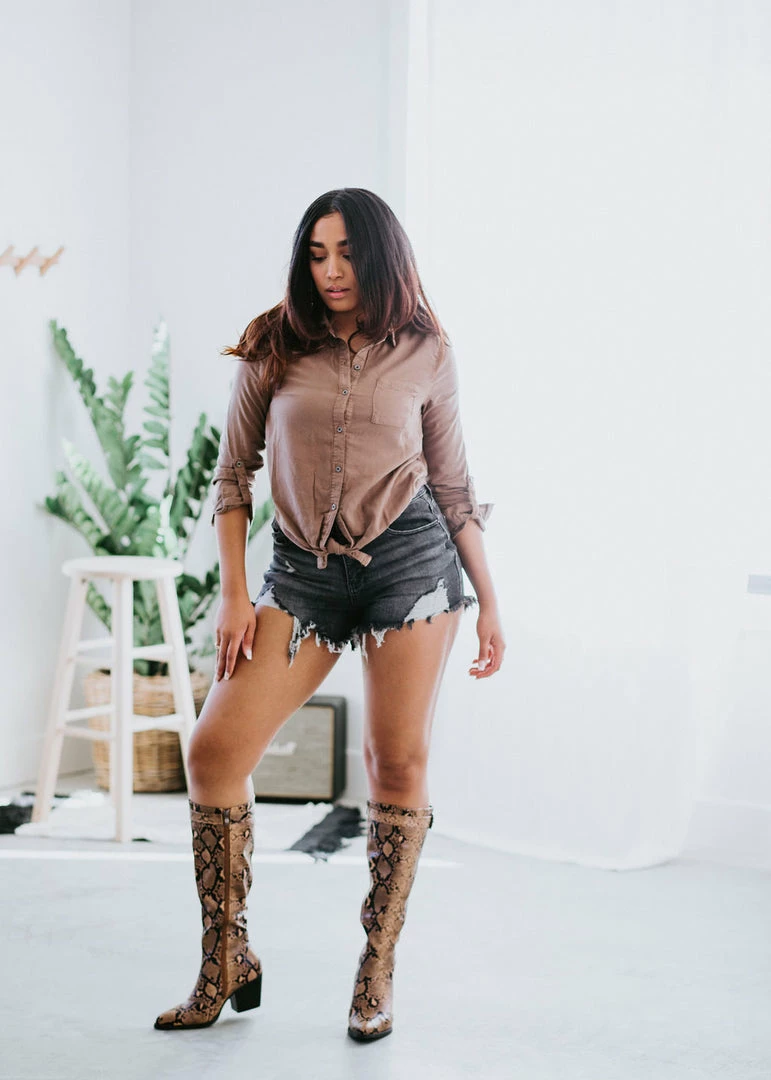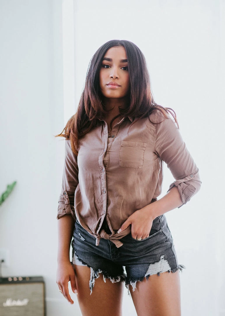 Add this extremely cute and soft chambray top to your rotation immediately! It features a collared neckline, patch pocket, and a full button-down front that leads to an adorable front-tie hem. Fits true to size. Cathyliana is wearing a small.