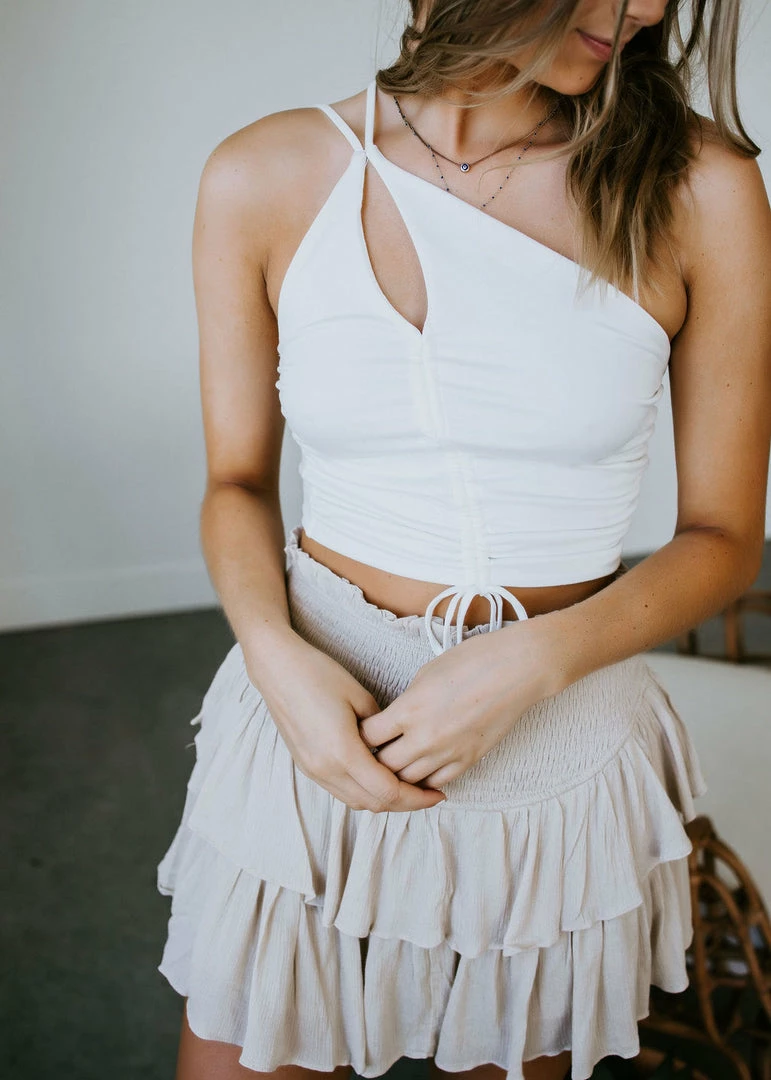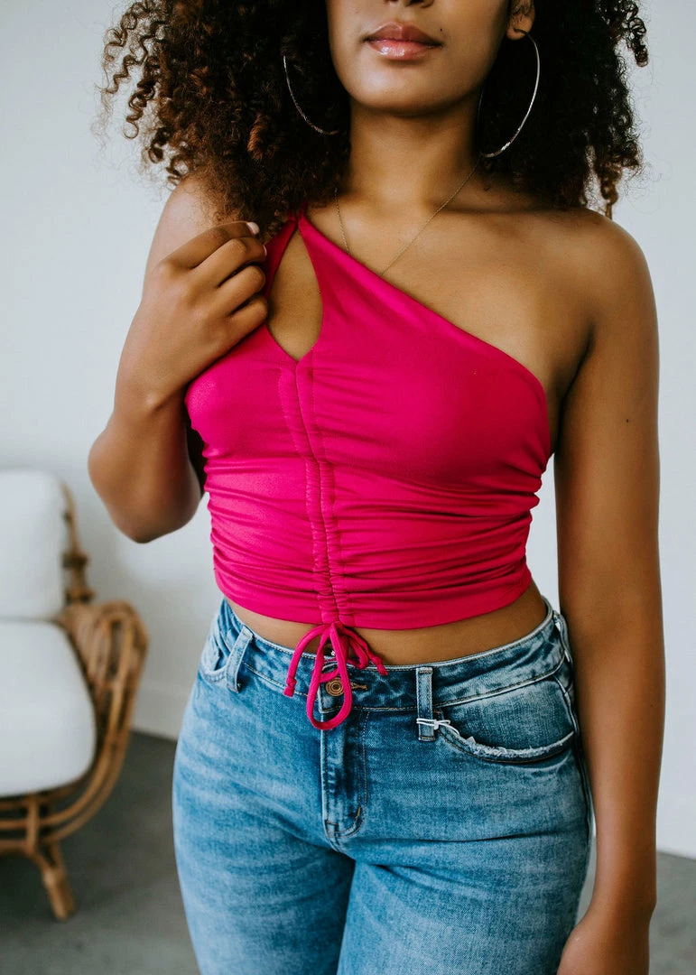 It’s gonna be a hot one, ladies! Dress for the season with this sultry little top shaped by buttery soft knit. Featured in a cropped silhouette with a flirty cutout, adjustable straps, and a one-shoulder design. A drawstring tie in the front creates ruching for added dimension. Dress up or down for a variety of looks! Baylee and Cathyliana are wearing a size small.