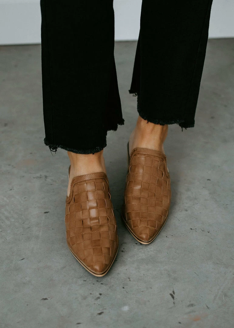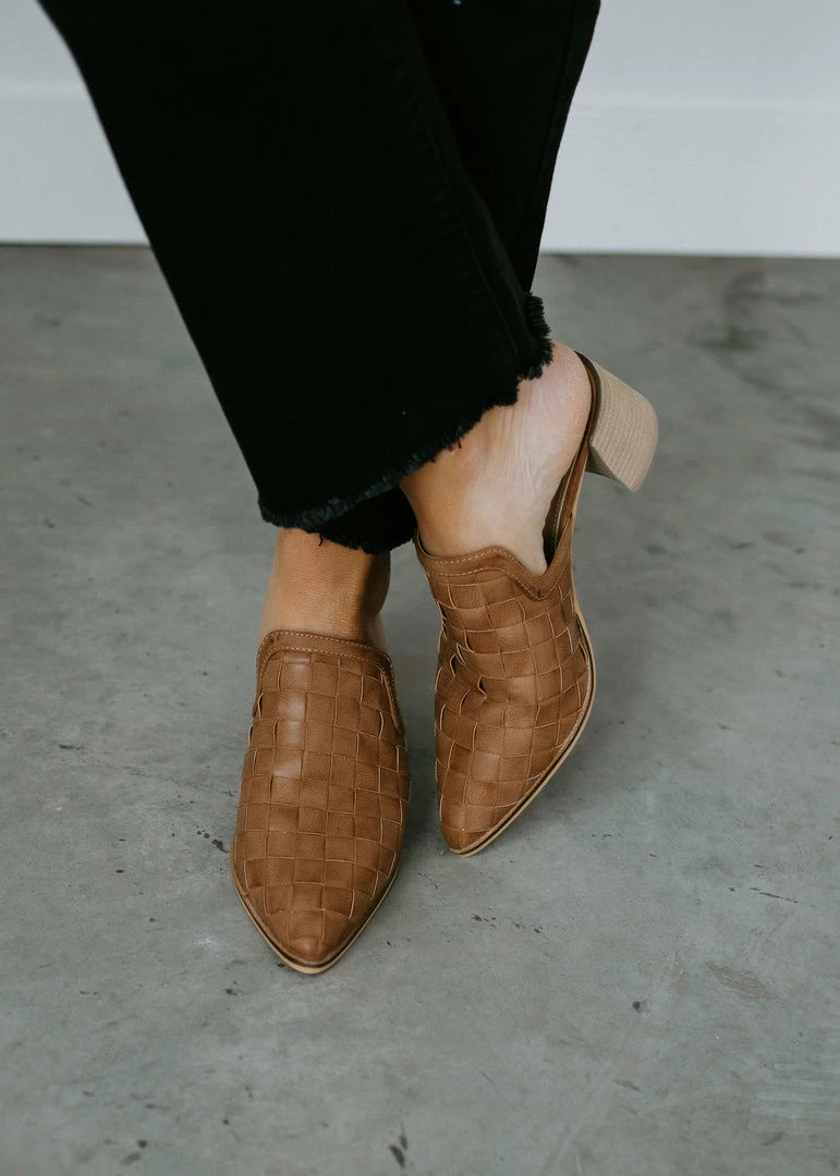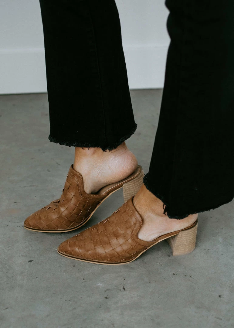 These chic mules will elicit so many admiring glances! Faux leather shapes the rustic woven design with a slip-on silhouette. Features a pointed toe that is balanced by a stacked block heel. Includes a lightly padded footbed.