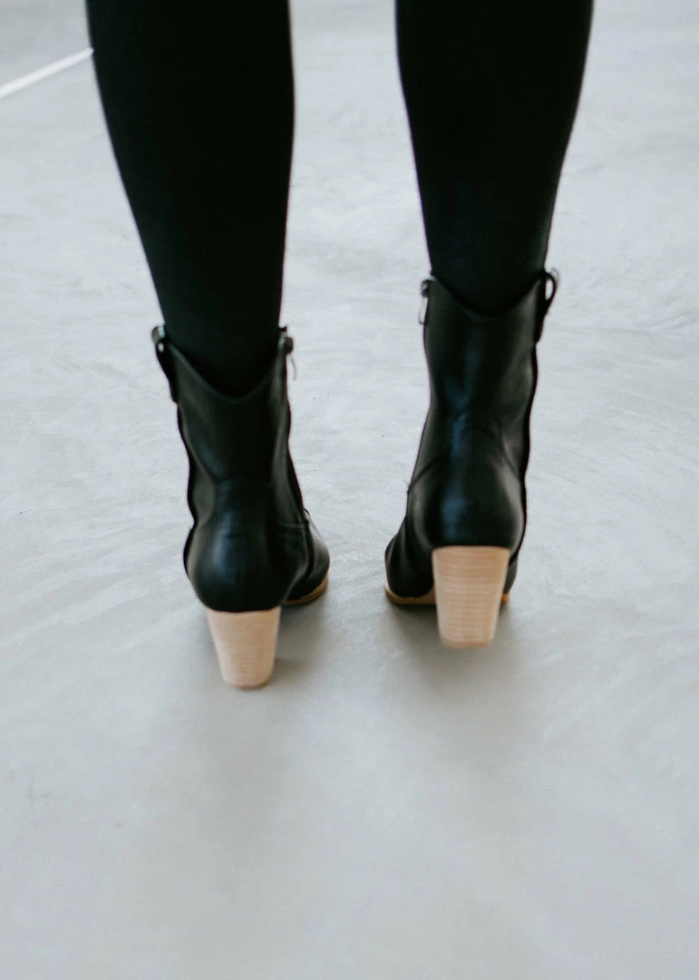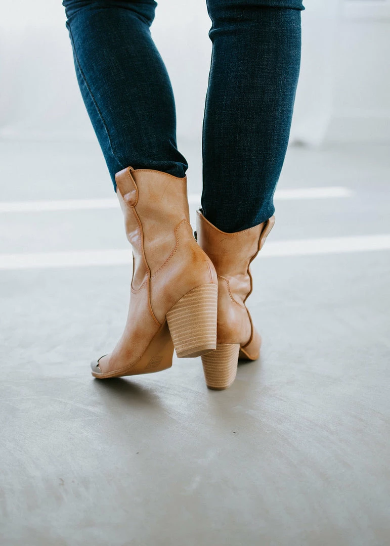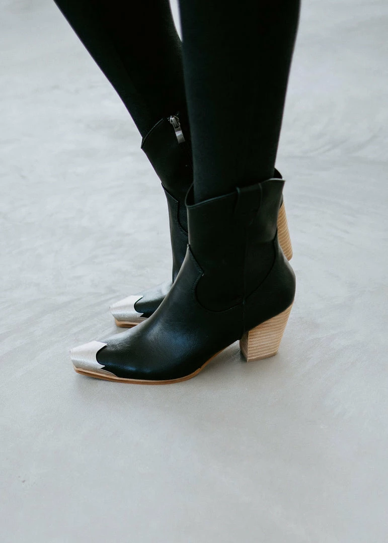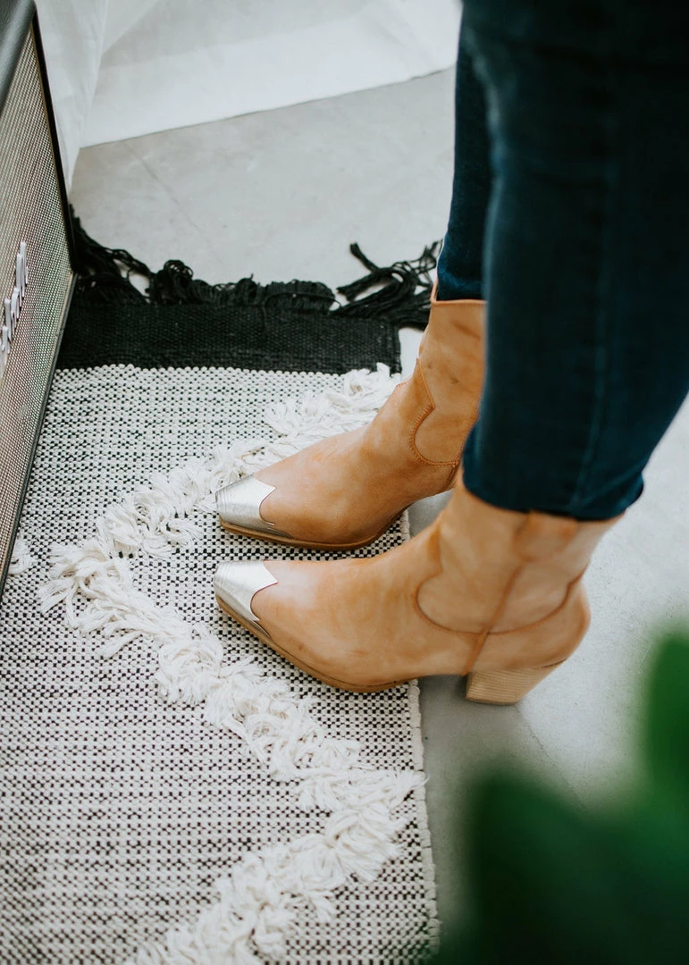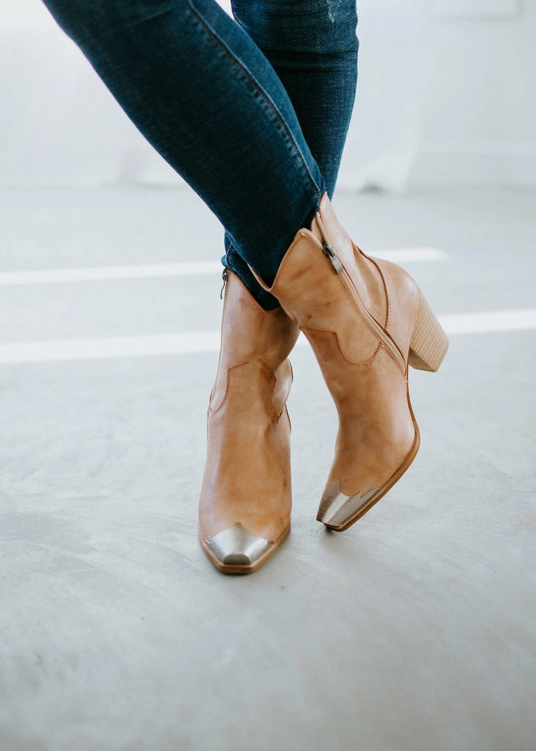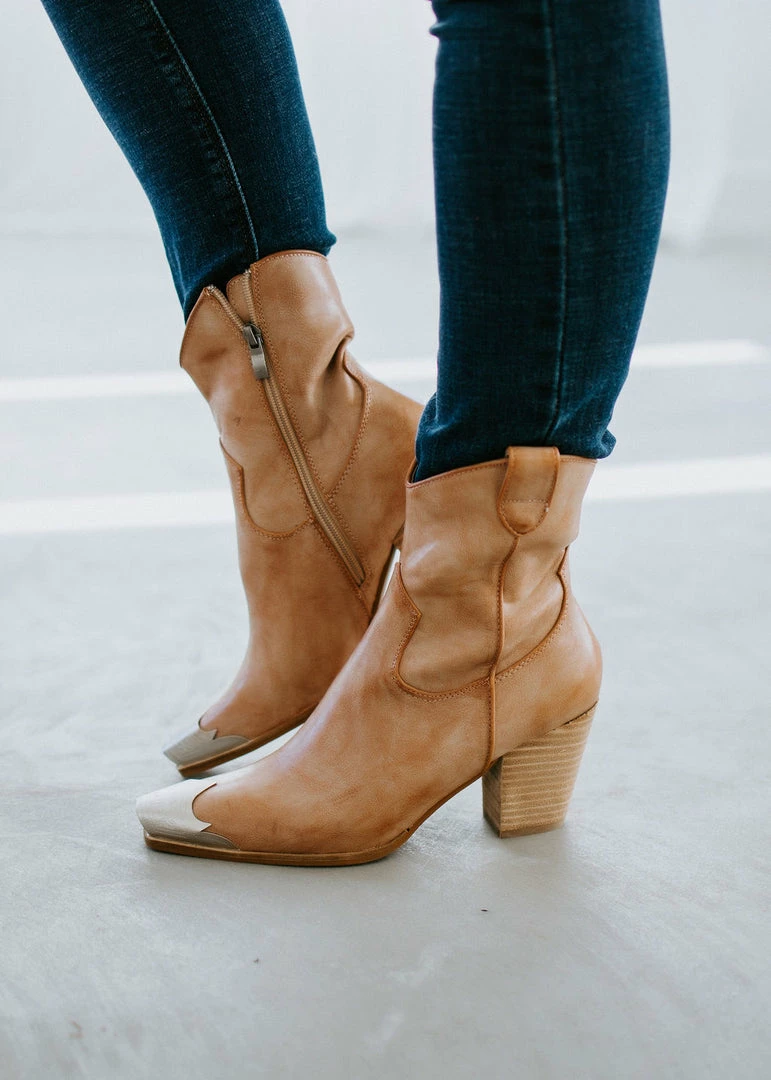 This gorgeous, Nashville-ready boot features a western-inspired style with an etched metallic toe, slim sit, and a stacked heel.