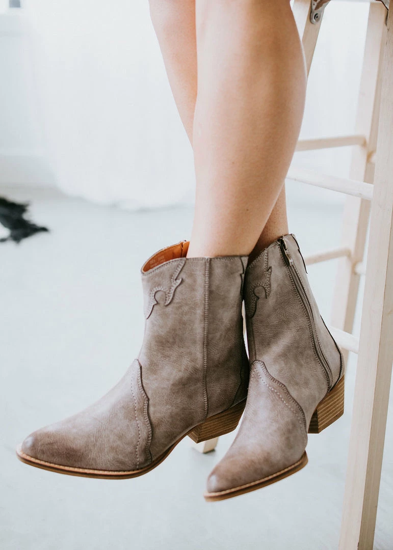 Add some western flair to your wardrobe with the Leeza Western Bootie. This versatile design features a pointed toe, angled block heel, and seamed detailing. Synthetic upper and outsole. Side zipper closure.