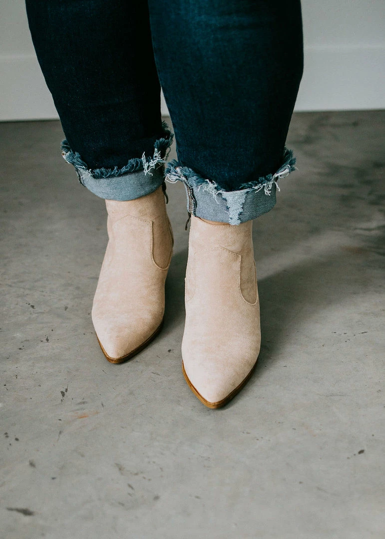 Step up your shoe game with this stylish ankle bootie! Buttery soft suede shapes this bootie with a pointed toe and side zip closure. Designed with a stacked block heel. Pair with your favorite sweater and jeans for a look you’ll love to wear again and again!