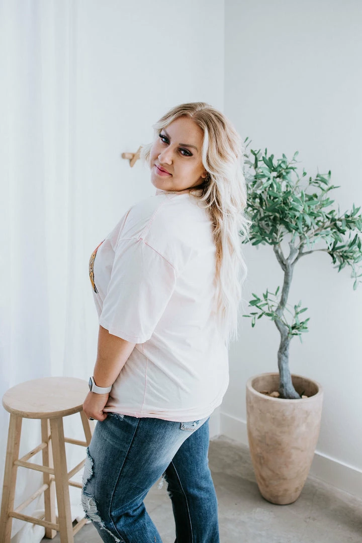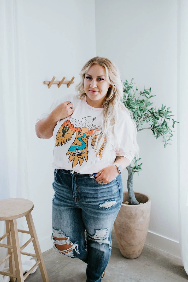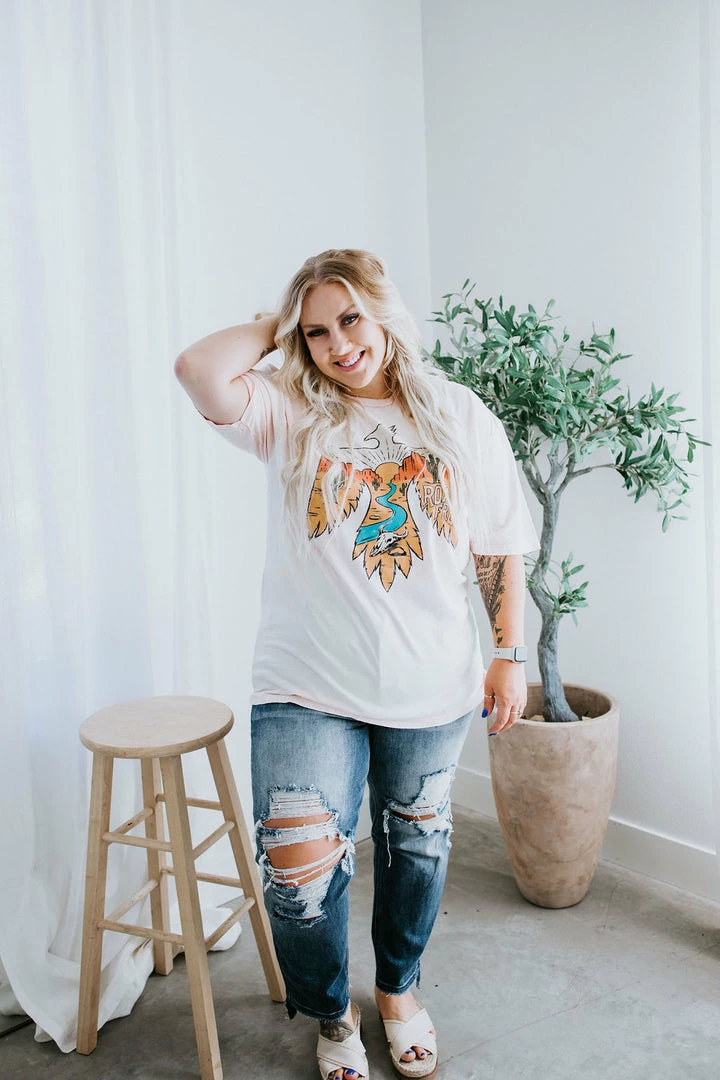 Western vibes are all the rage right now, grab your graphic tee to join in the fun! Features an open neckline and slightly dropped sleeves with a gorgeous, western-style graphic. Pair with flare jeans and boots. Loghin is wearing an XL.