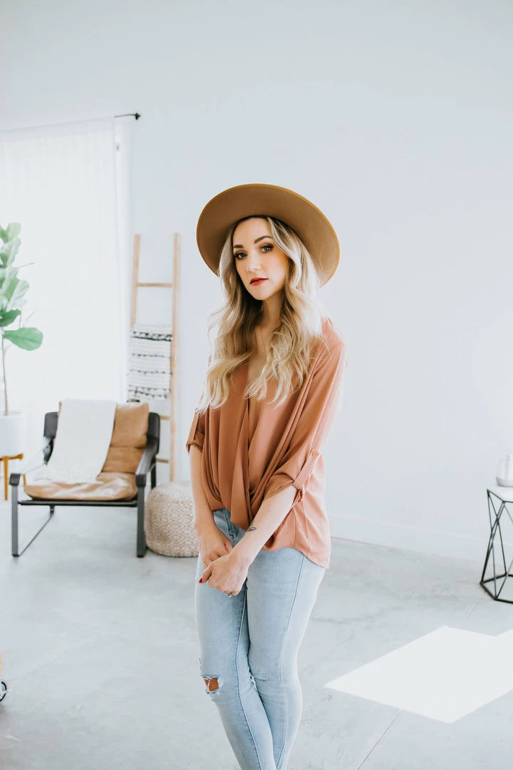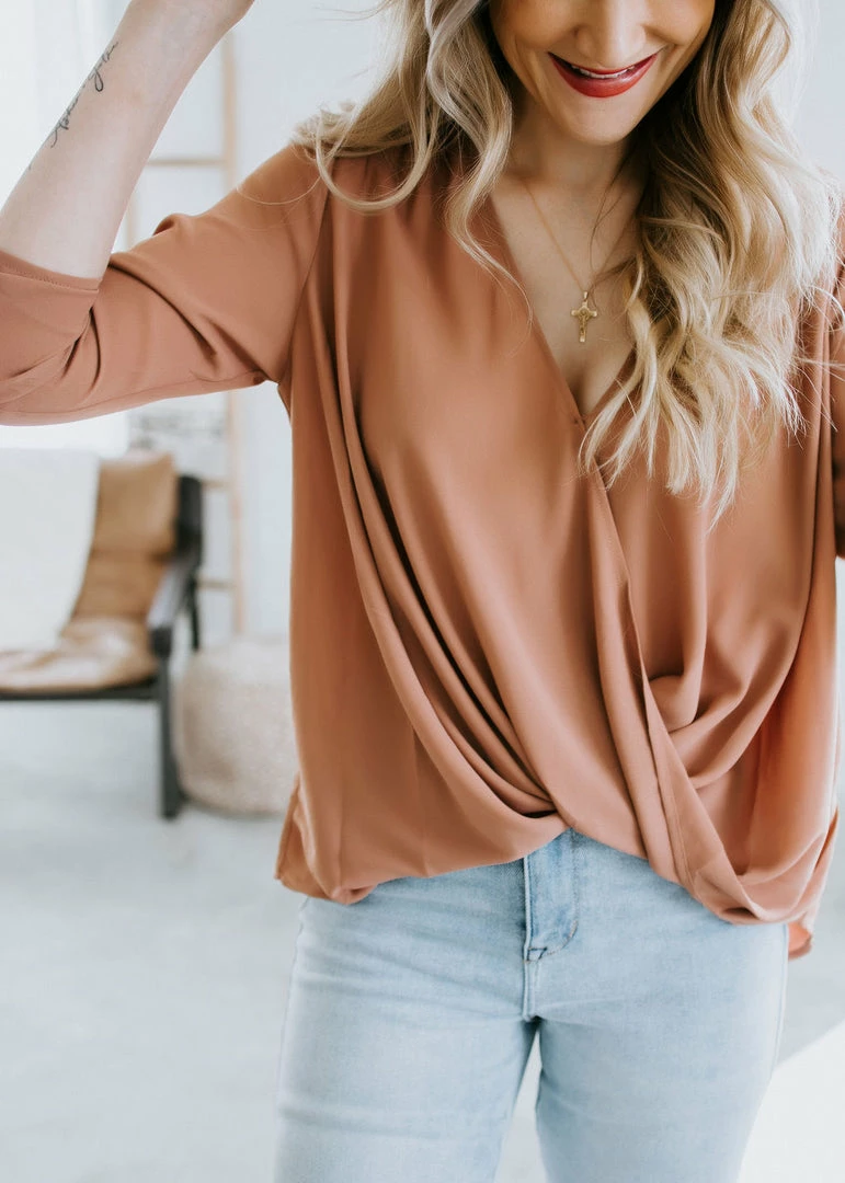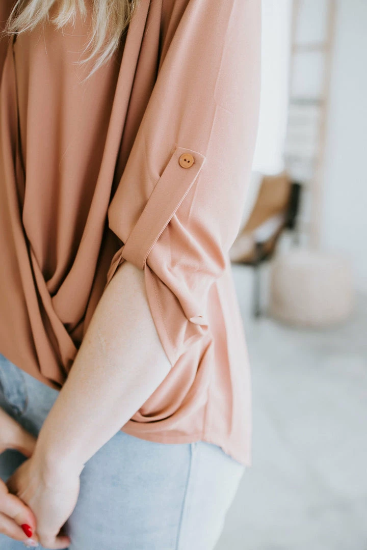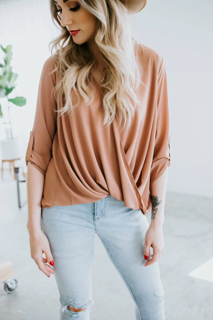 Let ’em talk about your amazing style! This surplice top features a V-neckline, soft gathers, and a flowy silhouette. 3/4 sleeves are styled with roll tabs. Composed of a breezy woven fabric for an always-sophisticated look. Leslie and Laurie are wearing smalls.