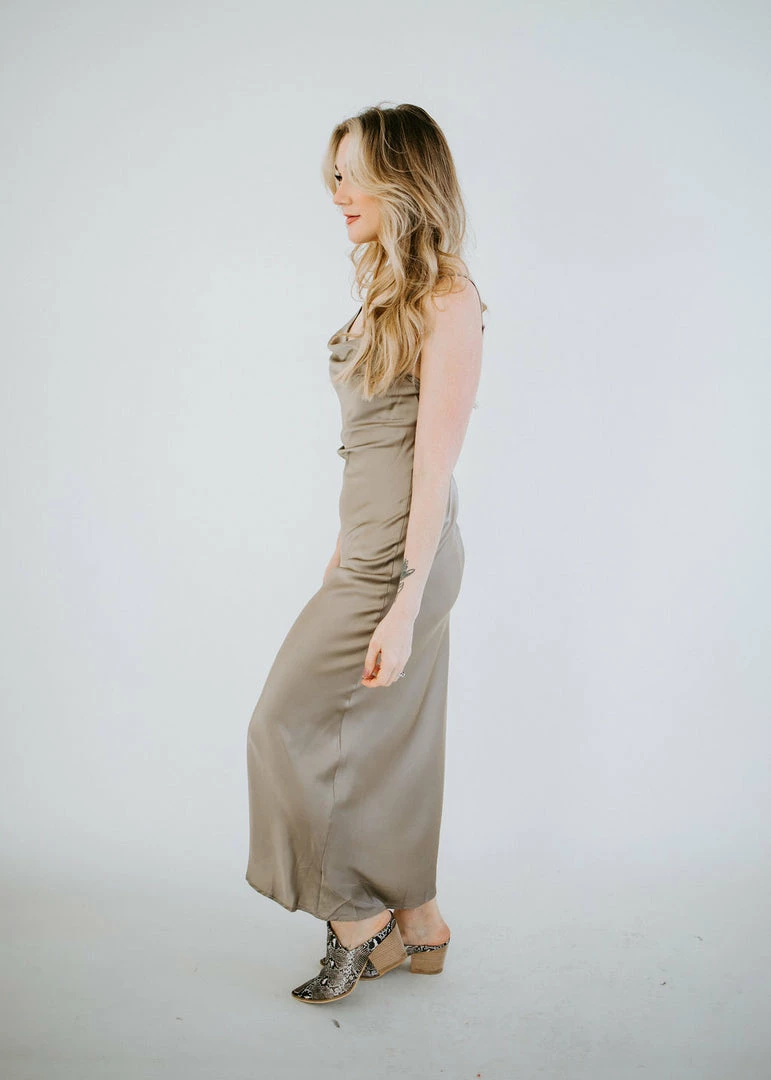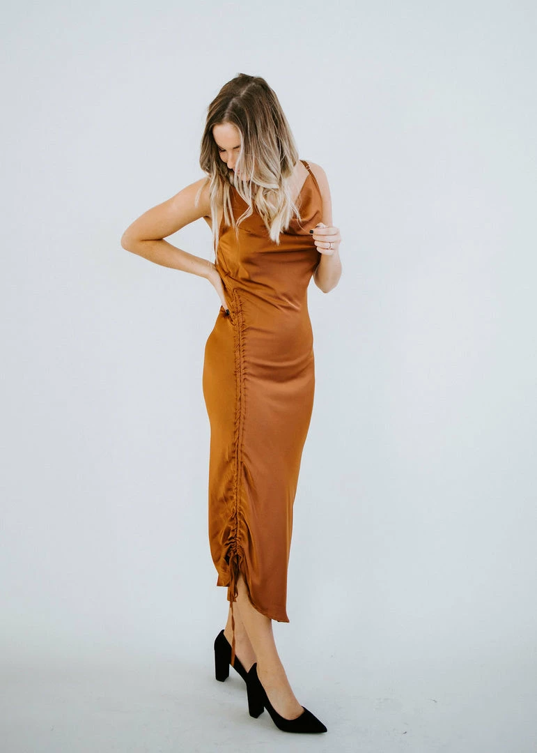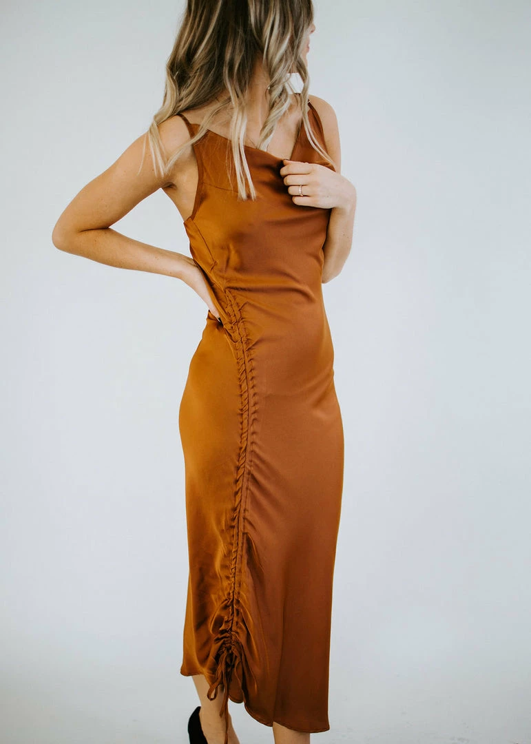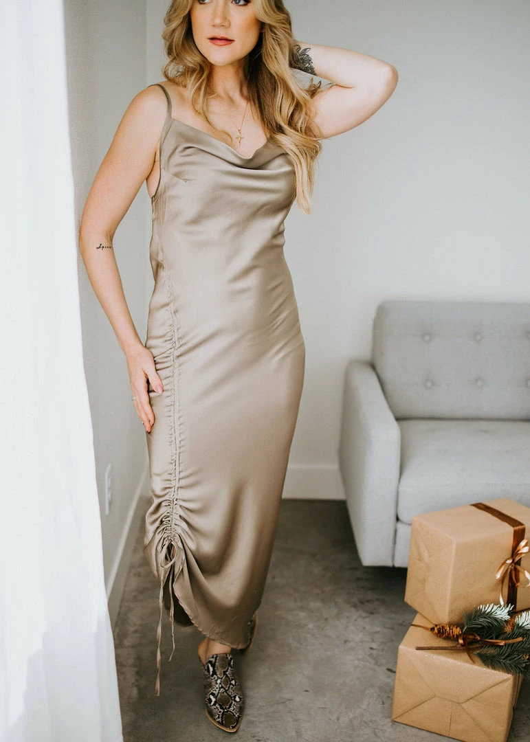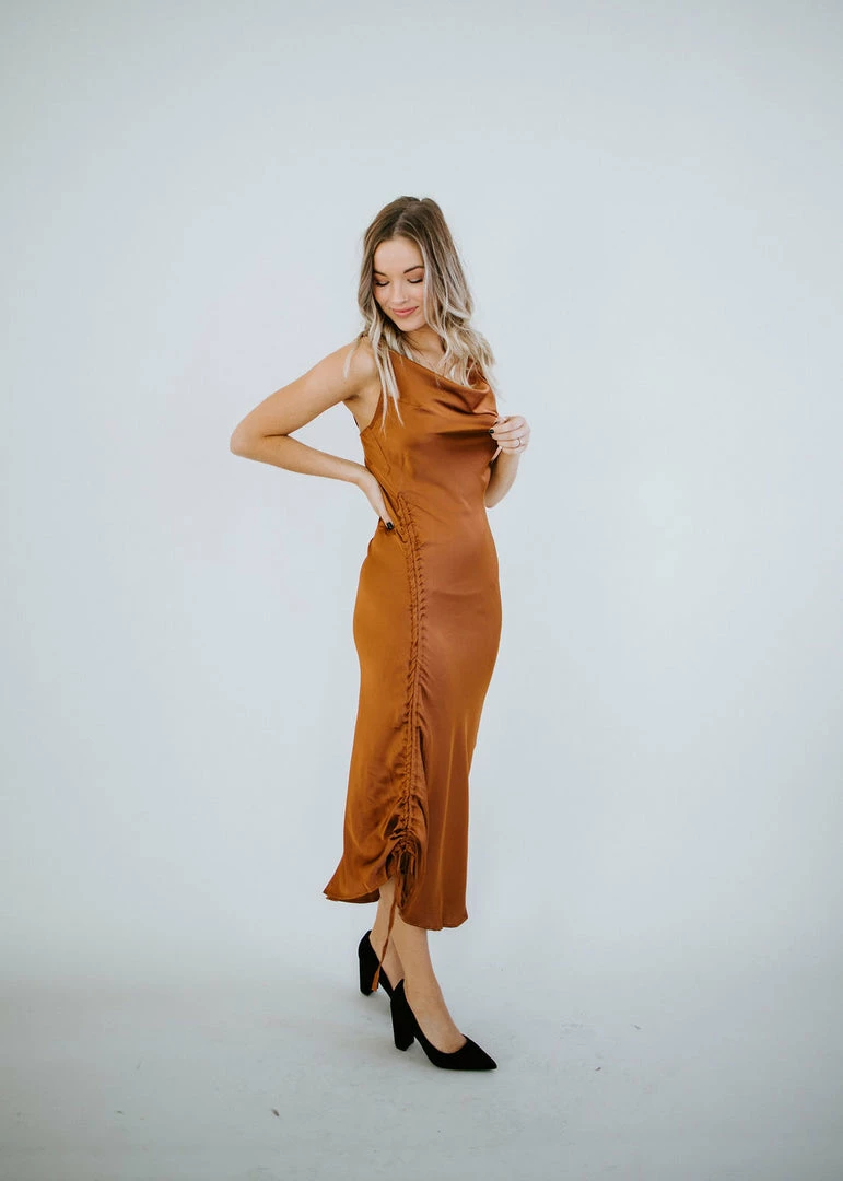 Flaunt your curves and strut your stuff in the Maurie Midi Dress. Features a side, ruching to compliment all the right spots and hide all the insecure areas, a flattering cowl neckline, and dainty spaghetti straps. A great option for a wedding attendee or a holiday party. Leslie, Baylee and Laurie are wearing smalls.