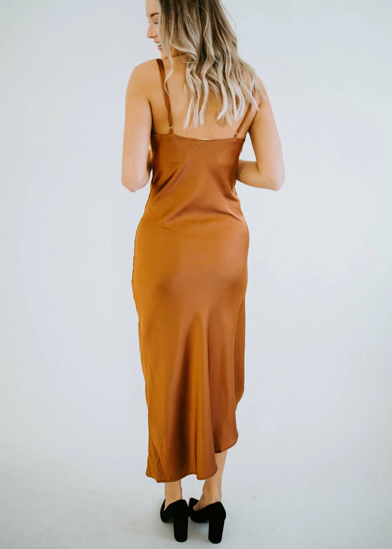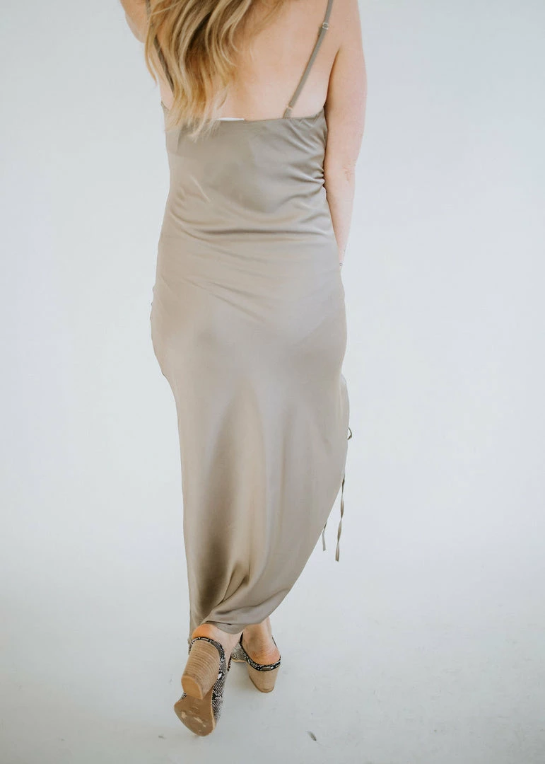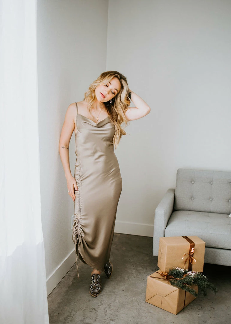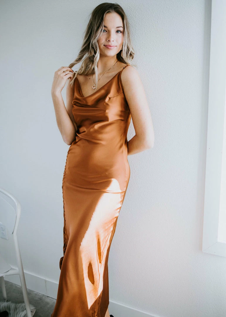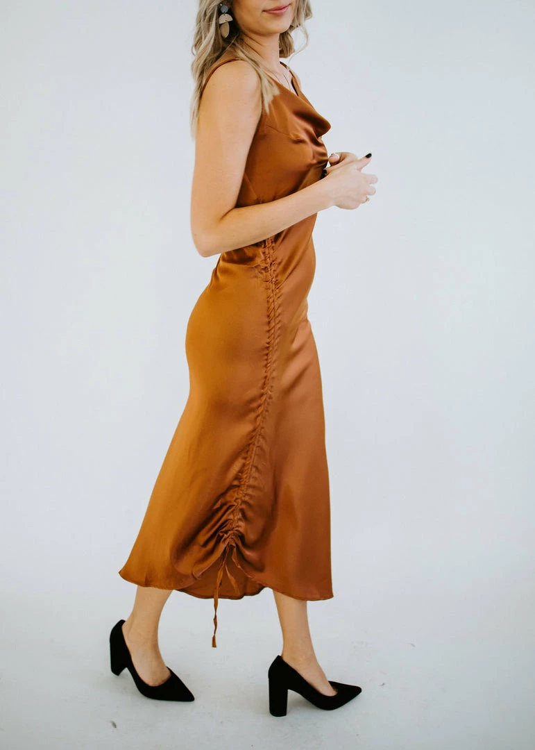 Flaunt your curves and strut your stuff in the Maurie Midi Dress. Features a side, ruching to compliment all the right spots and hide all the insecure areas, a flattering cowl neckline, and dainty spaghetti straps. A great option for a wedding attendee or a holiday party. Leslie, Baylee and Laurie are wearing smalls.