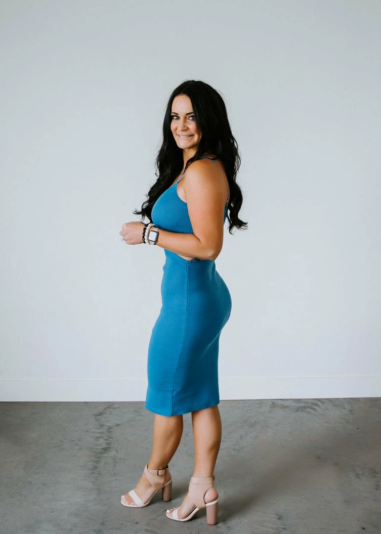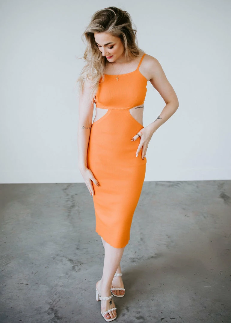 Show off your curves in the Hot Shot Dress. Featured in a stunning and trendy tangerine orange and cobalt blue. Complete with vented side cutouts, straight neckline, and spaghetti straps. Stay classy while emphasizing your favorite curves. Laurie and Leslie are wearing smalls.