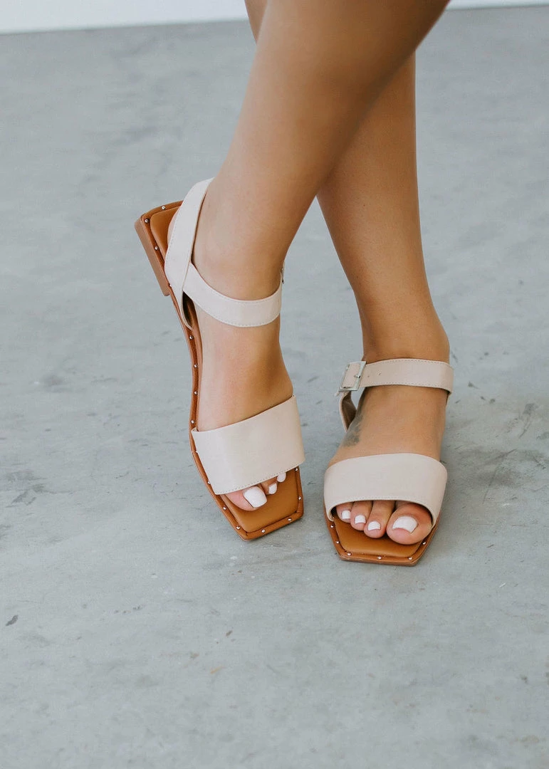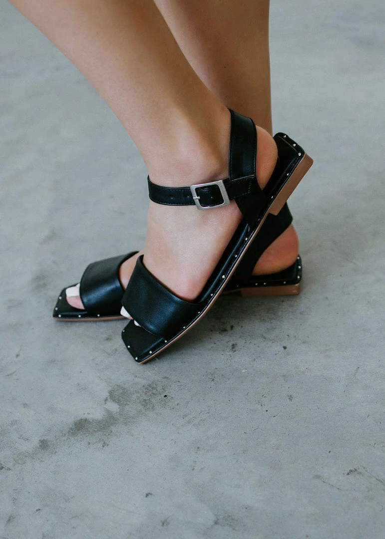 It’ll feel like you are away on vacay every time you slip into these sandals adorned with silver studs at the insole. Features faux leather construction with a square toe and heel. Adjustable buckle strap closure.