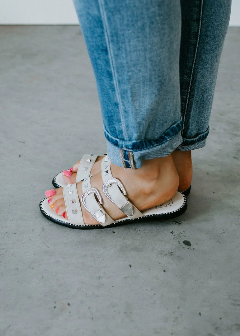 These sandals are ready for warm, sunny days. Pyramid studs punctuate the straps of these modern sandals that feature double buckle straps. Pair with distressed denim shorts and a graphic tee for a breezy, carefree look.