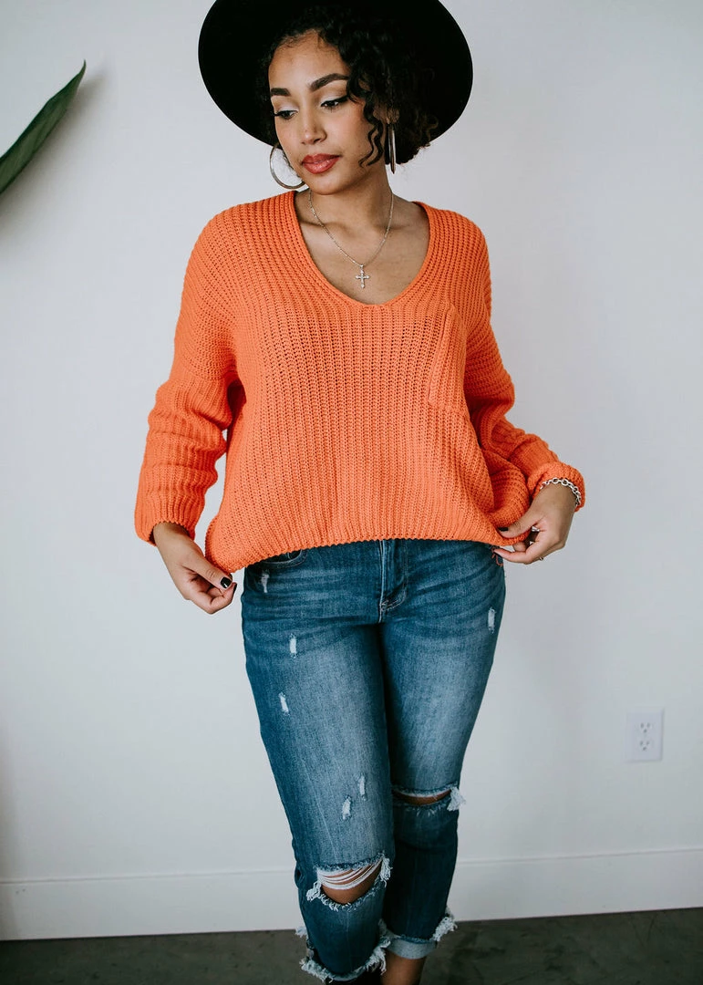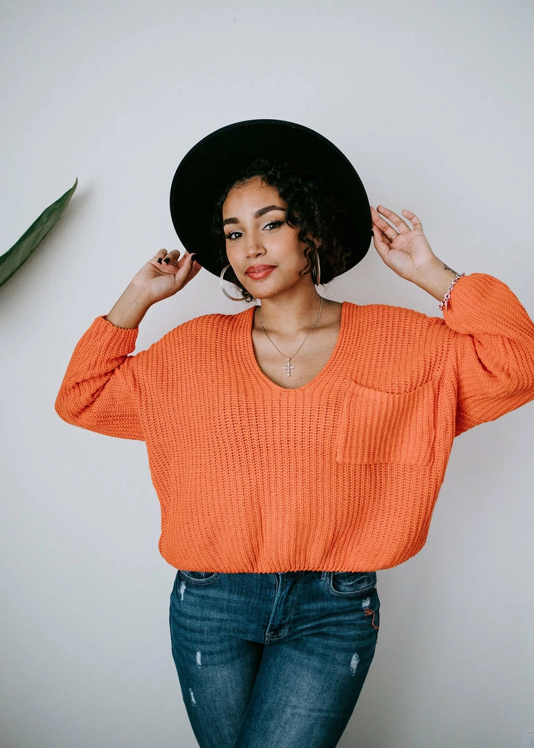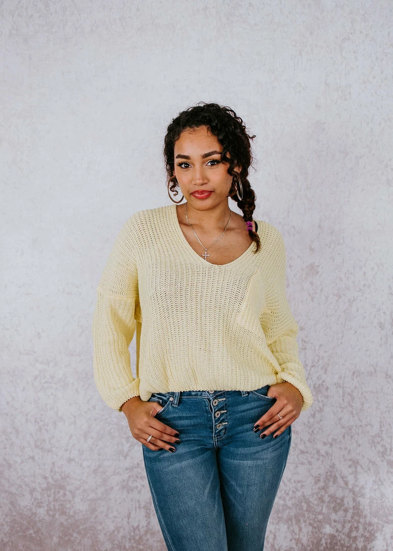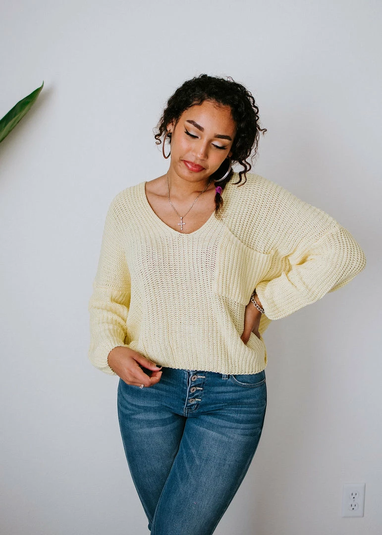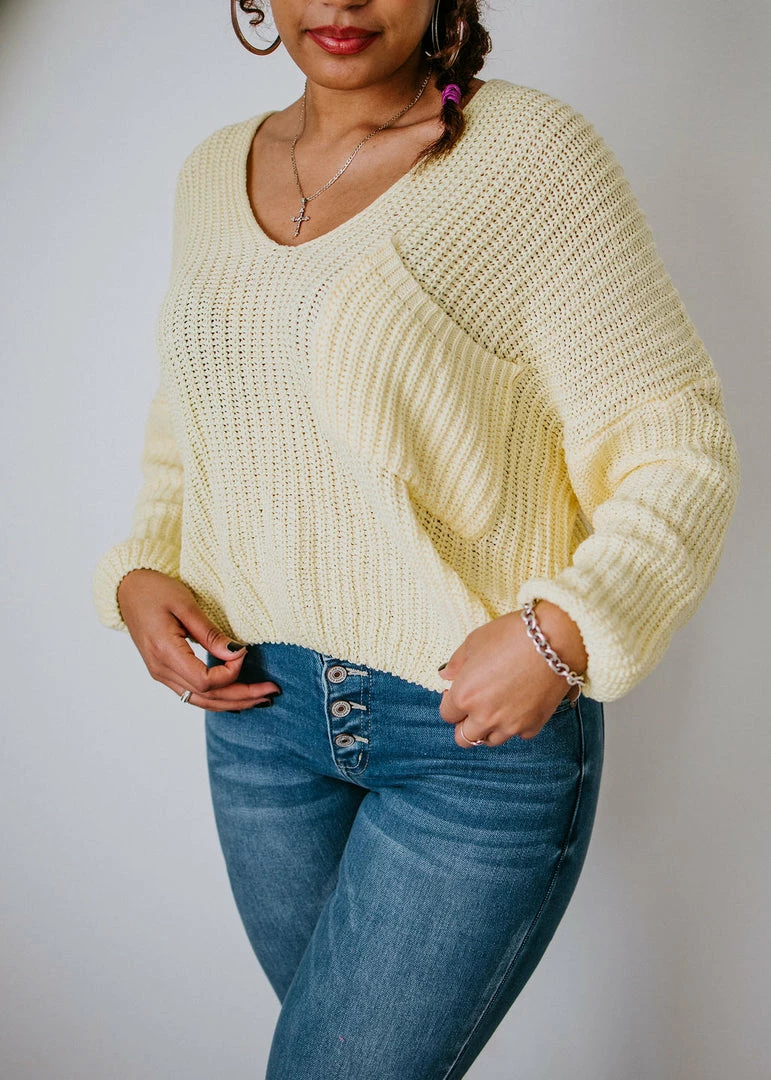 Brighten up your wardrobe with this must-have sweater that comes in a variety of dazzling colors! This ribbed knit sweater can be worn year-round and is designed with a deep V-neck, dropped shoulders, and long sleeves. With a slightly cropped hem and a front patch pocket. Take casual to a whole new level by throwing this on over a cami or brami. Pair with distressed shorts in the summer and jeans in the cooler months. Baylee and Cathyliana are wearing an S-M.
