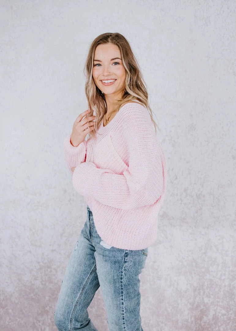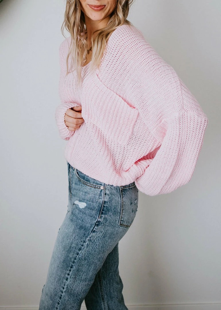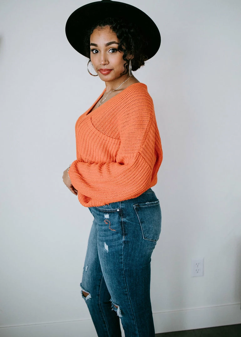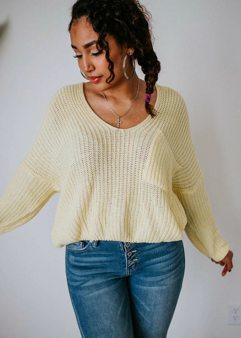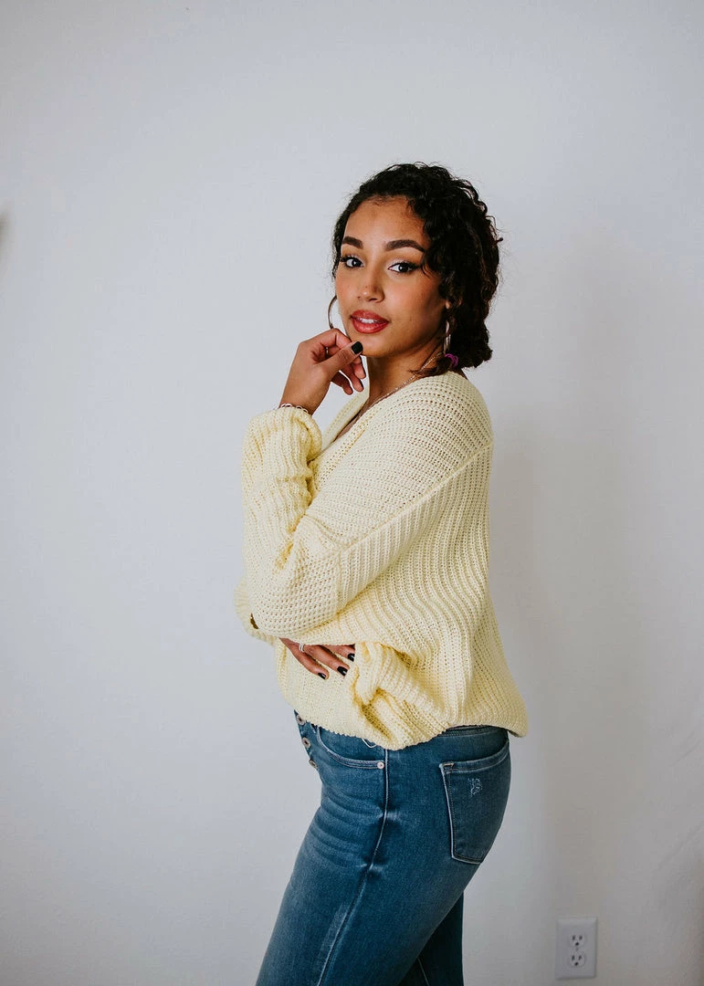 Brighten up your wardrobe with this must-have sweater that comes in a variety of dazzling colors! This ribbed knit sweater can be worn year-round and is designed with a deep V-neck, dropped shoulders, and long sleeves. With a slightly cropped hem and a front patch pocket. Take casual to a whole new level by throwing this on over a cami or brami. Pair with distressed shorts in the summer and jeans in the cooler months. Baylee and Cathyliana are wearing an S-M.
