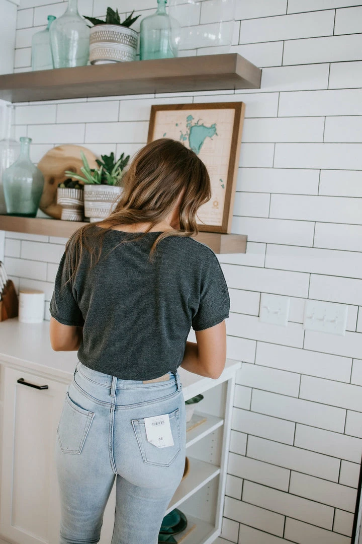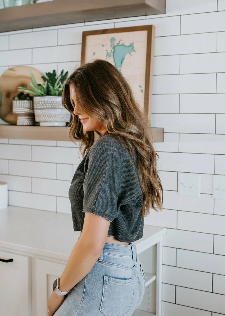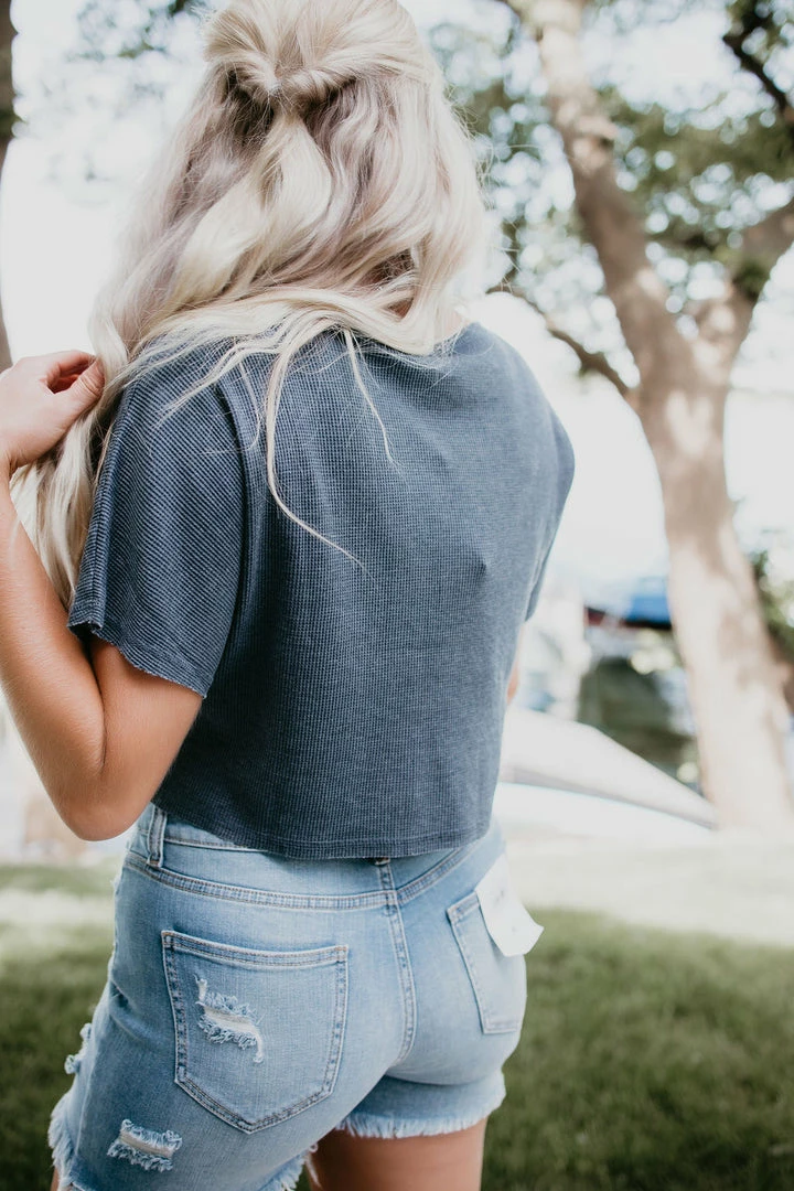 Constructed from a breathable, cotton-polyester waffle-knit fabric, this top features a boxy silhouette, short sleeves, raw edges, and a pointed flat collar. Kaylor is wearing a medium. Kara and Laurie are wearing smalls.