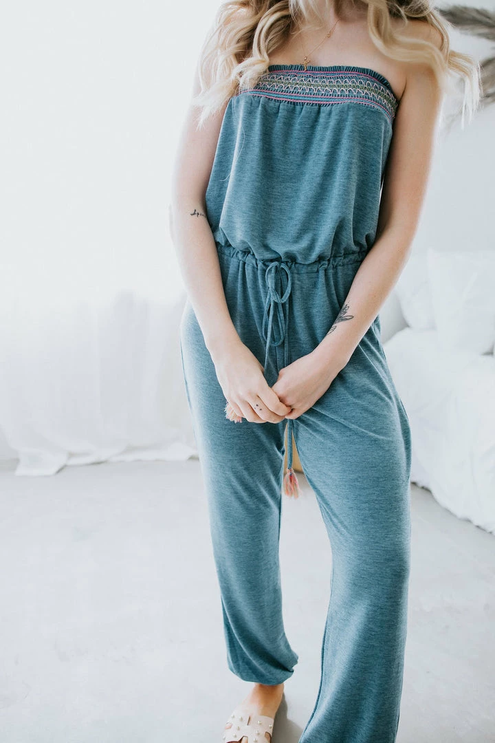 This summer-ready jumpsuit strikes just the right vibe! This comfortable style starts with a sleeveless bodice that features embroidered smocking at the top that leads to a drawstring waist with tassel accents. Completed with jogger pant legs and elastic hems. Pair with sandals for a lovely look. Leslie is wearing a small.