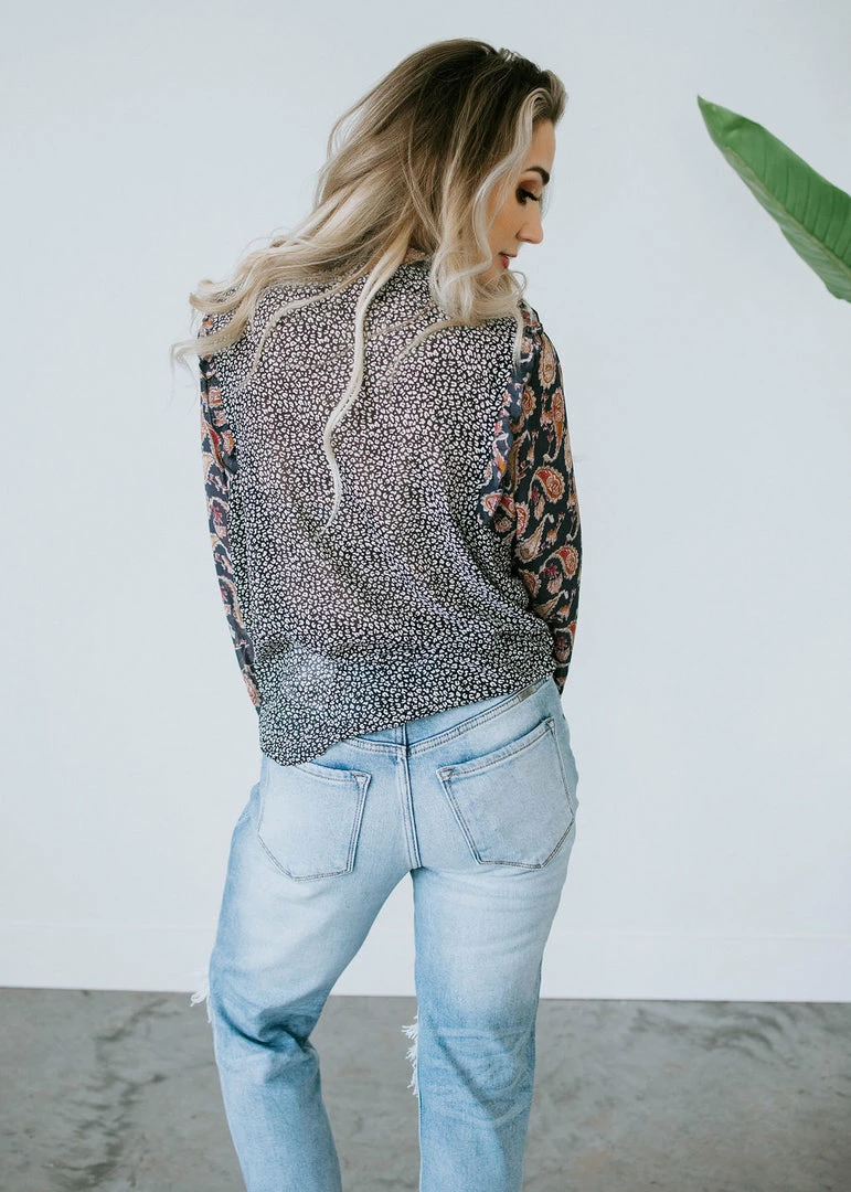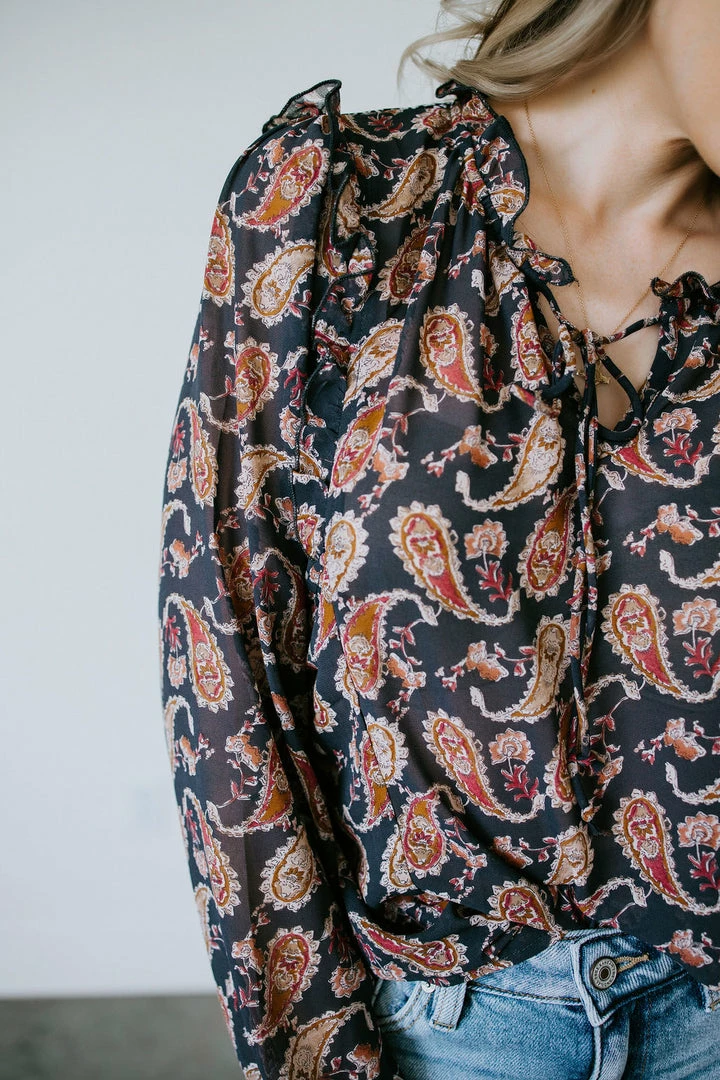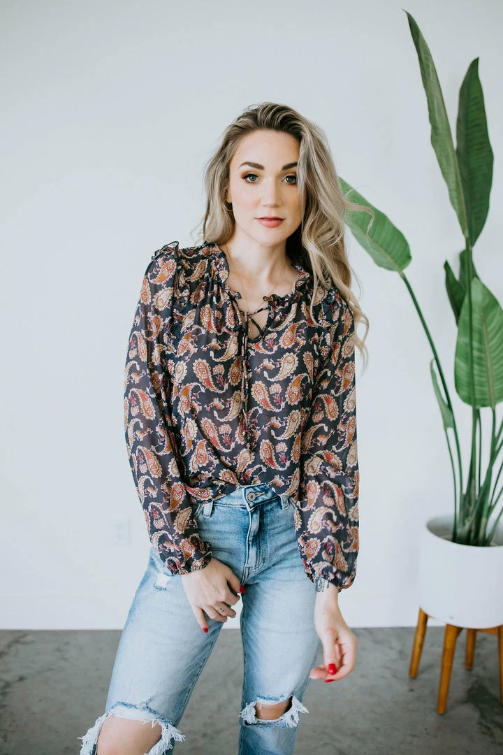 This peasant blouse is featured in a mix of pretty prints for a true work-to-weekend look. Shaped by semi-sheer fabric in two delightful prints – a multi-hued paisley print and a black and white leopard print. Styled with a split neck, tie detail, blouson sleeves, and ruffle accents throughout for an airy, romantic attitude. Leslie is wearing a small.