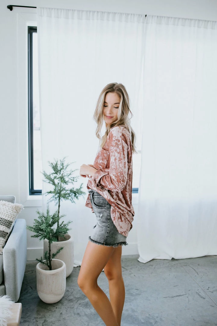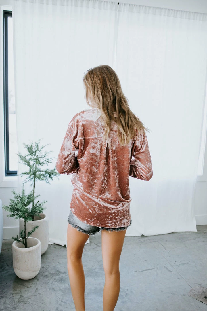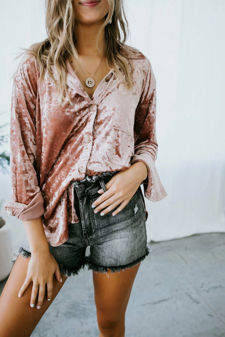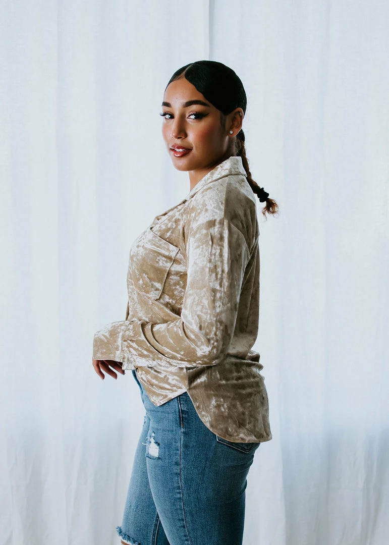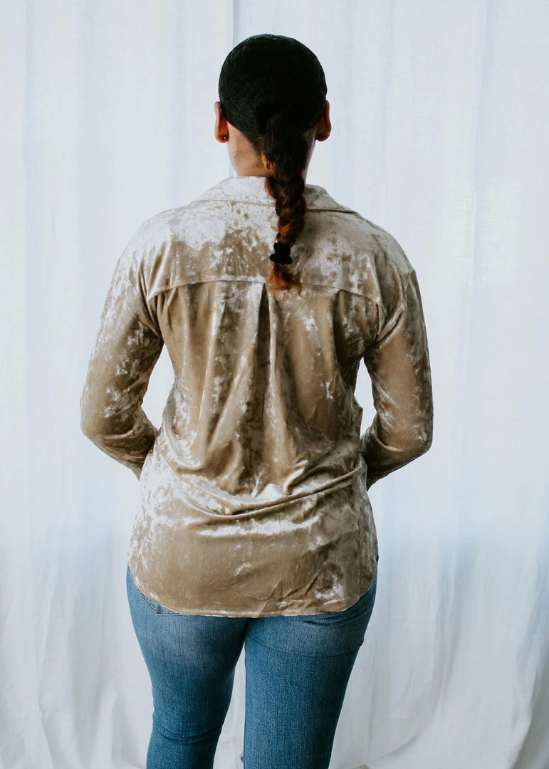 Meet our newest crush! We can’t get enough of this long sleeve top made from soft velvet. Features a classic shirt silhouette with a collared neckline, single chest pocket, button cuffs, and a rounded hem. The full button placket makes it easy to wear open and layered over a cami for a lovely look. Cathyliana and Baylee are wearing smalls.