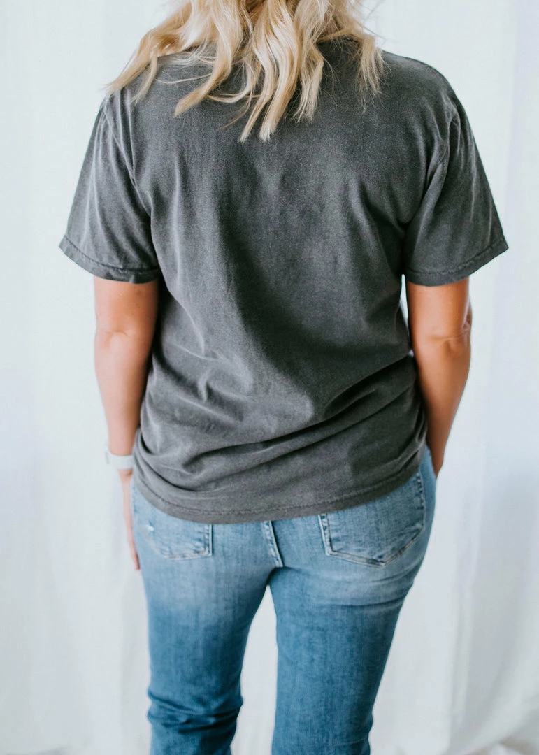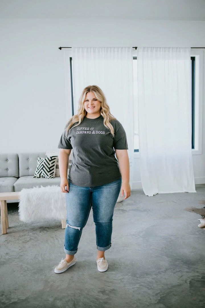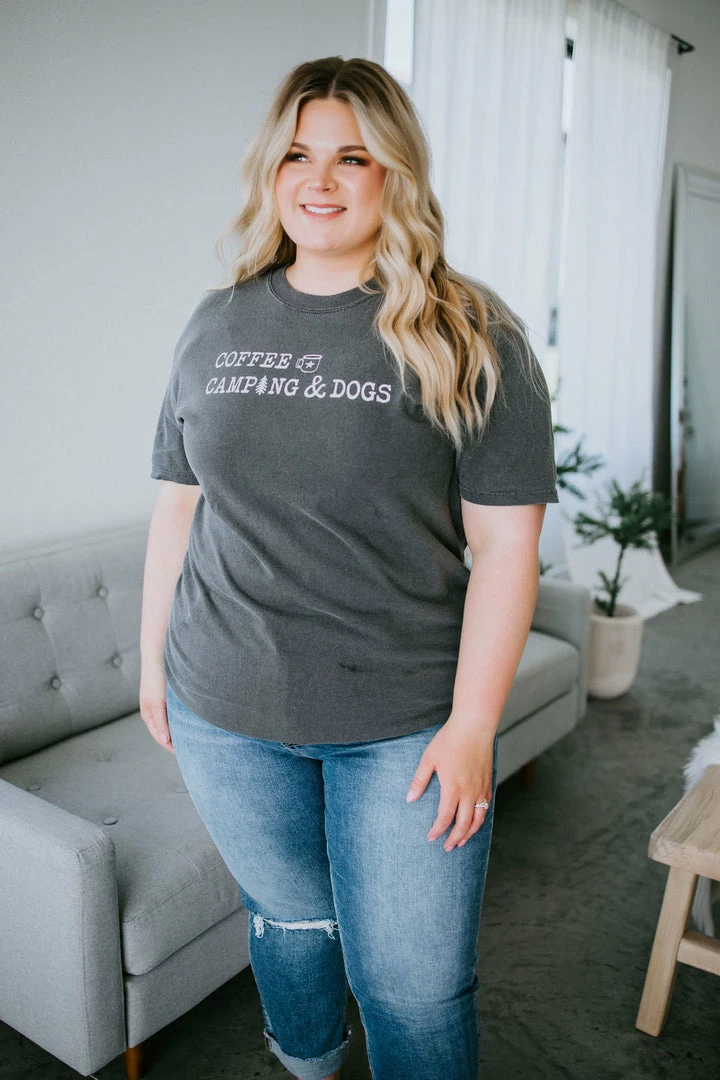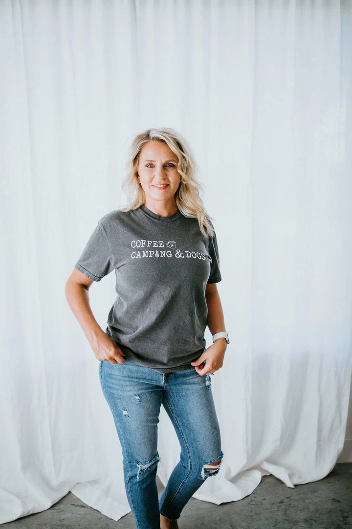 If it involves coffee, camping, and dogs, count us in! This need-now tee features white graphic text atop a charcoal-colored base. Designed with a crew neck, short sleeves, and a relaxed-fit silhouette. Pair with jeans for a casual-cute look. Unisex sizing. Jen is wearing a medium. Hannah is wearing an XL.