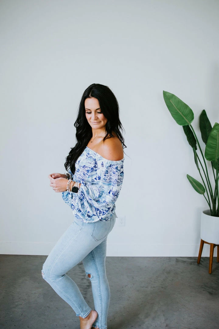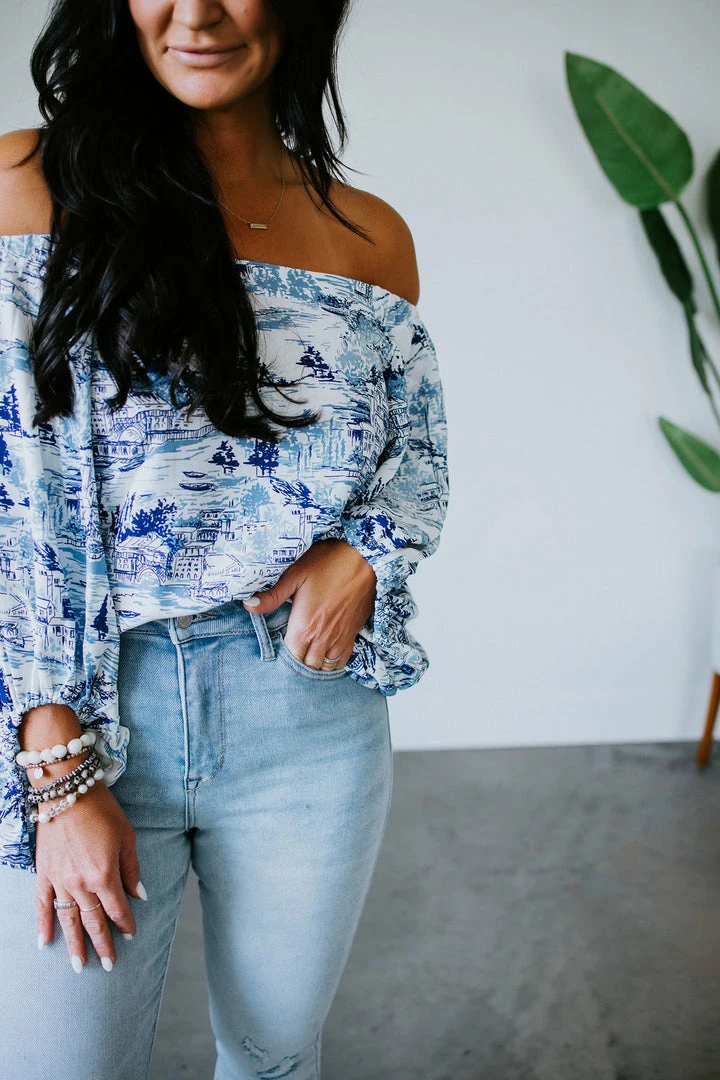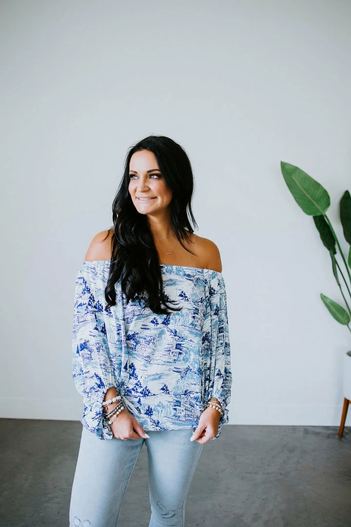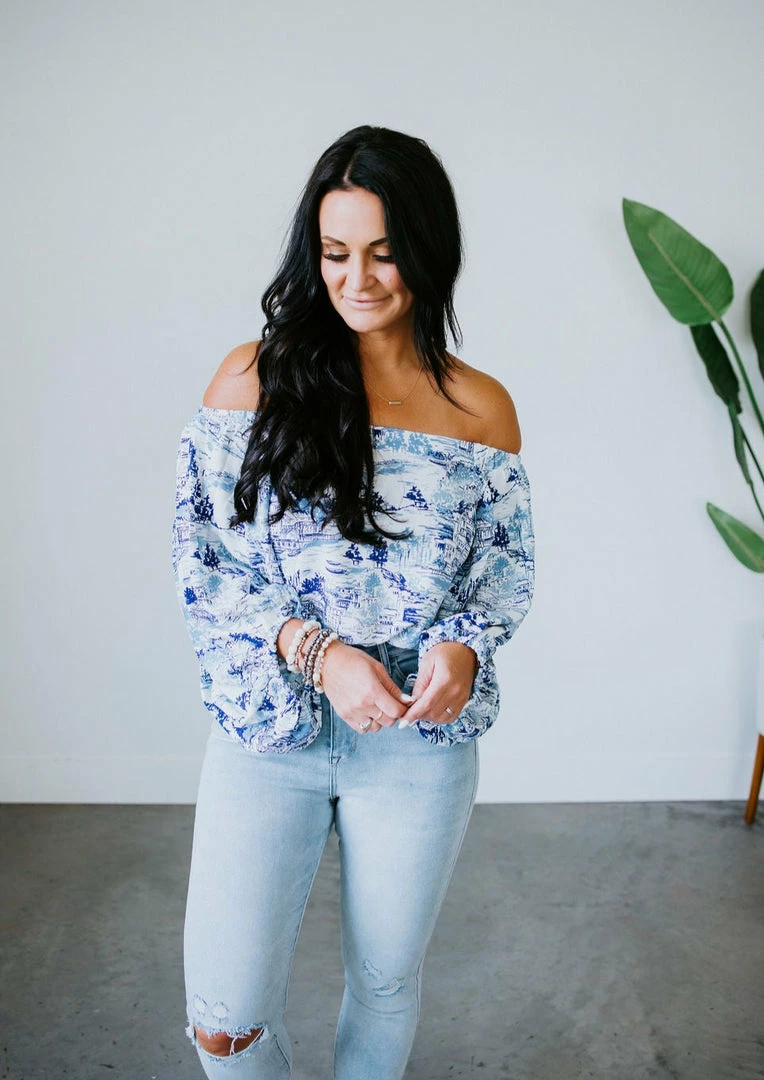Relish in the true-blue romance of this gorgeous top. Defined by an off-the-shoulder neckline that continues to flowy blouson sleeves and a relaxed-fit bodice. With a blue and white toile print, this woven top feels airy and feminine. Designed with elastic at the neck and cuffs. Laurie is wearing a small.
