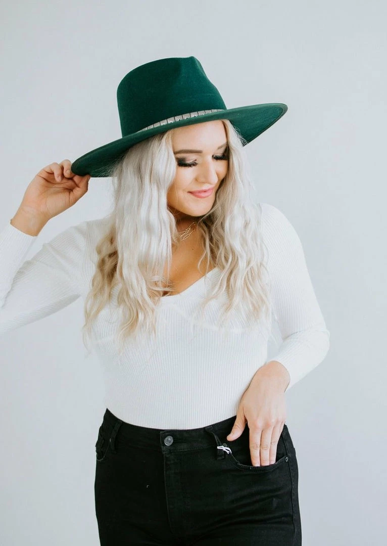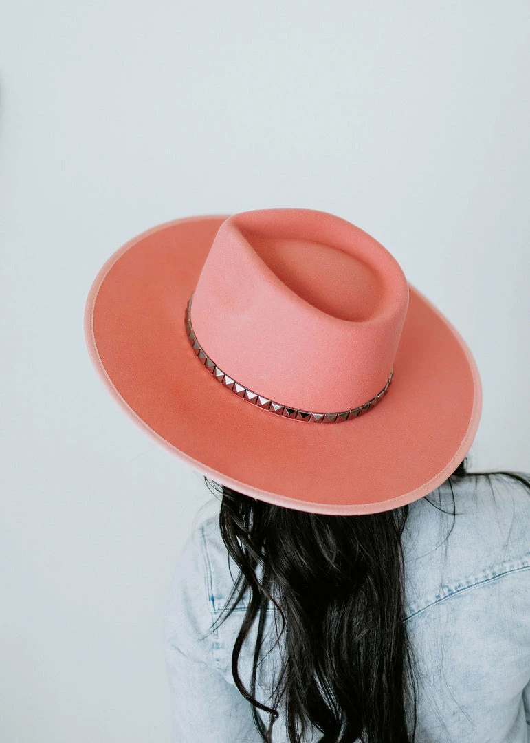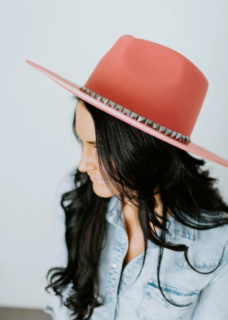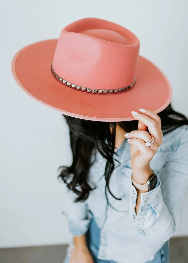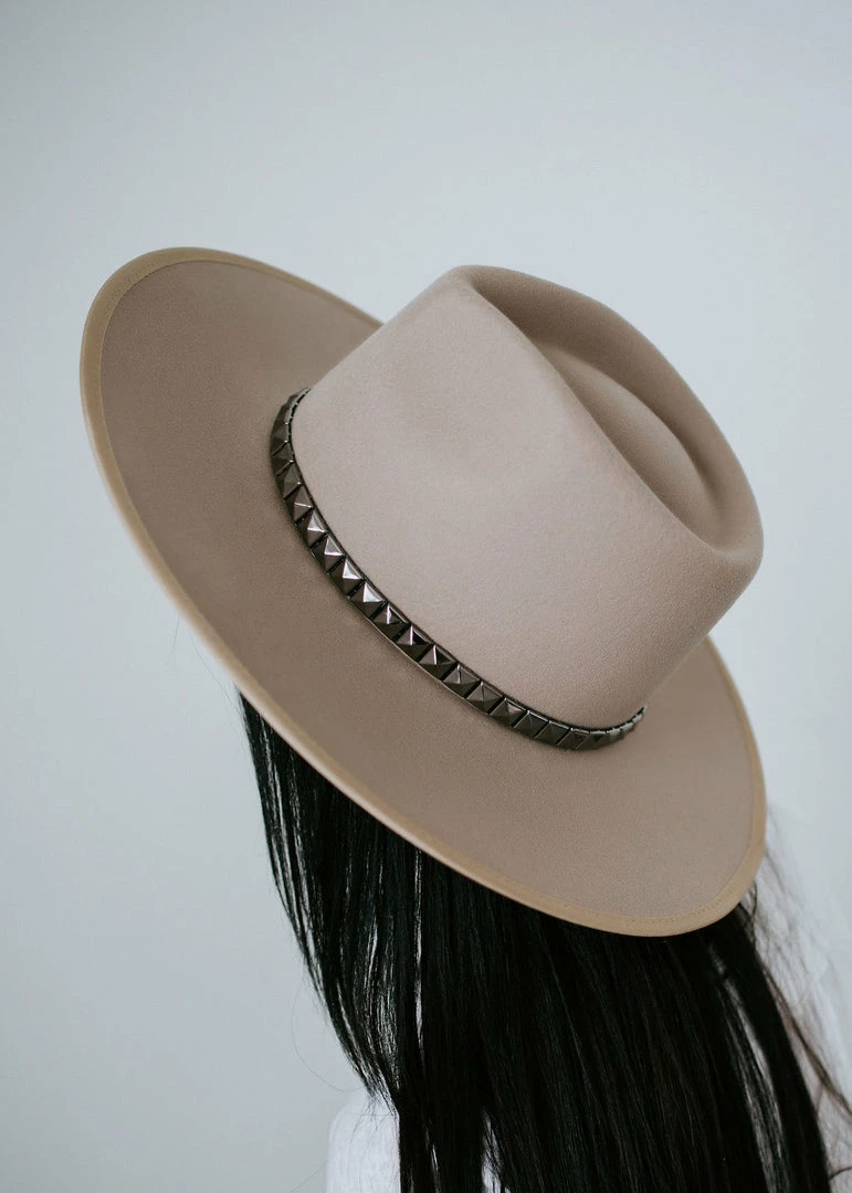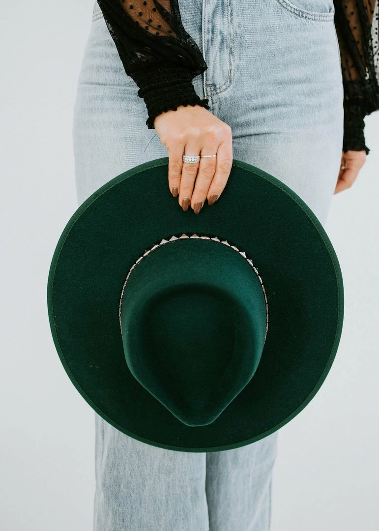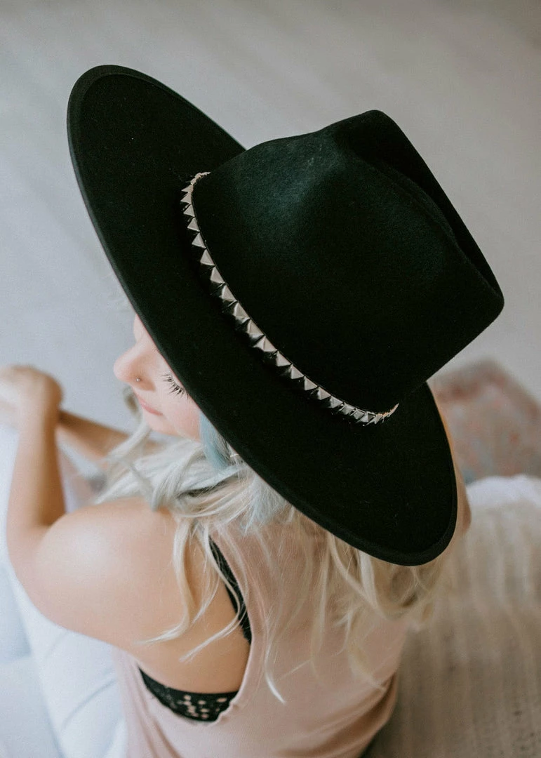 Top off your look with this timeless accessory! This sturdy and structured felted wool hat has a classic teardrop top and a wide brim. Detailed with a studded band. Adjustable inner strap. One size fits most.