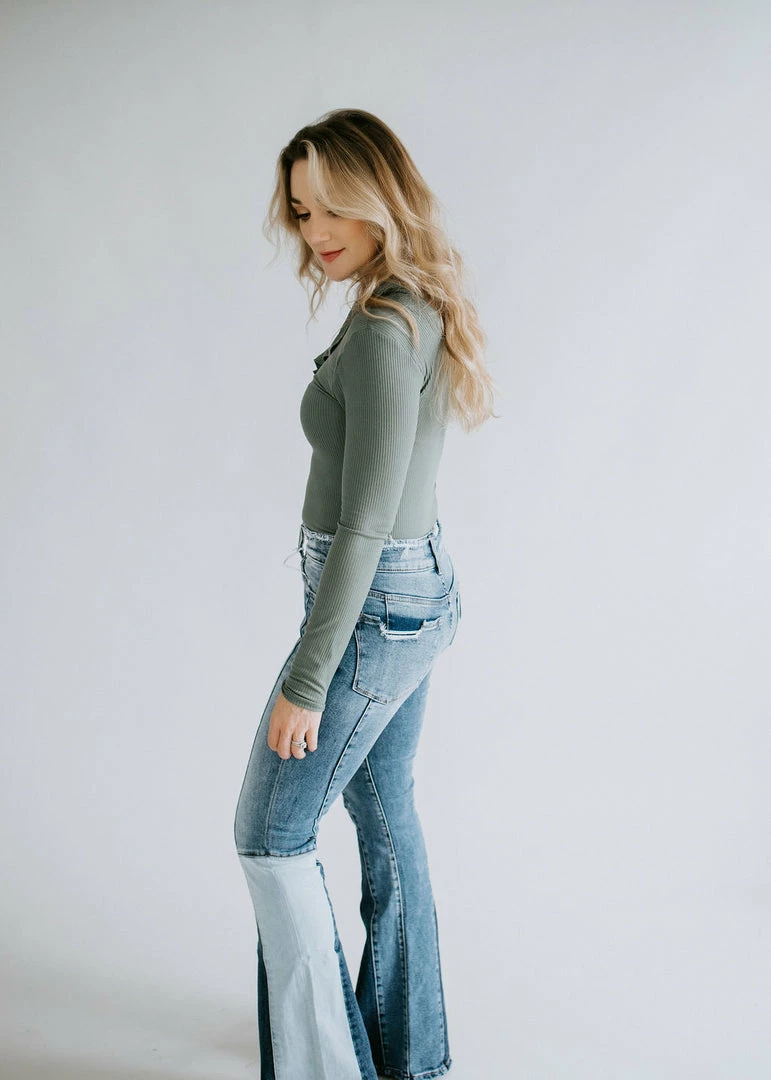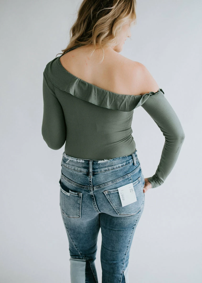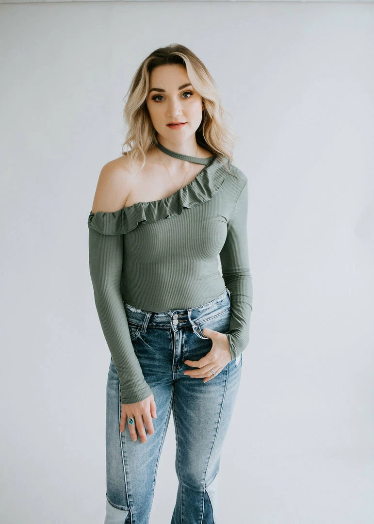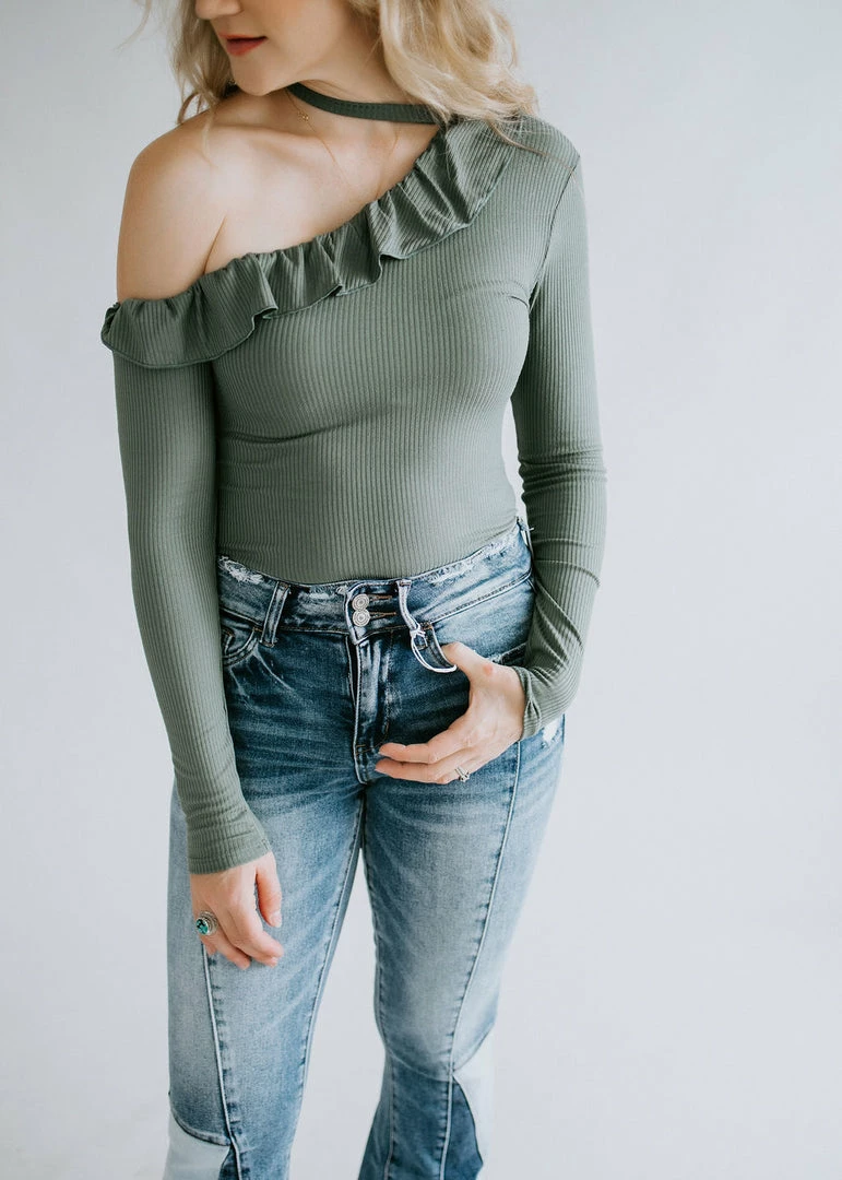 This long sleeve bodysuit is going to be an instant fave! Medium-weight ribbed knit shapes this essential bodysuit that has a rounded neckline, long sleeves, and a fitted bodice. Set yourself apart in this ribbed bodysuit with the unique, attached choker detail and a ruffle design. Attached cheeky bottoms have two snap closures. Leslie is wearing a small.