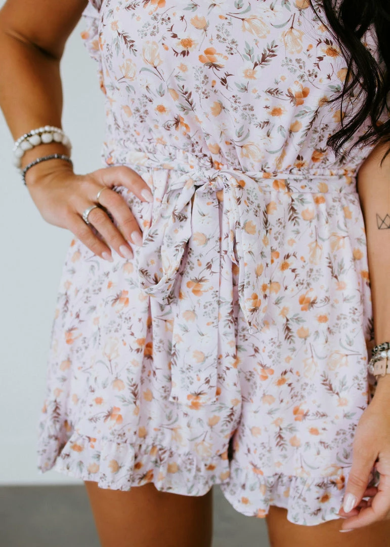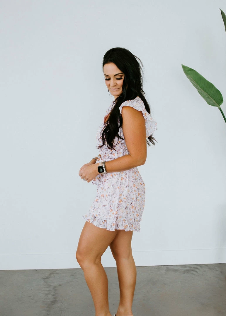 We have all the floral fever for summer time and what better way to cure than with this adorable romper! Features a floral print, tie at the waistband, and flutter sleeves. Complete with a ruffle shorts. Pair with a rancher hat to complete the look. Laurie is wearing a small.