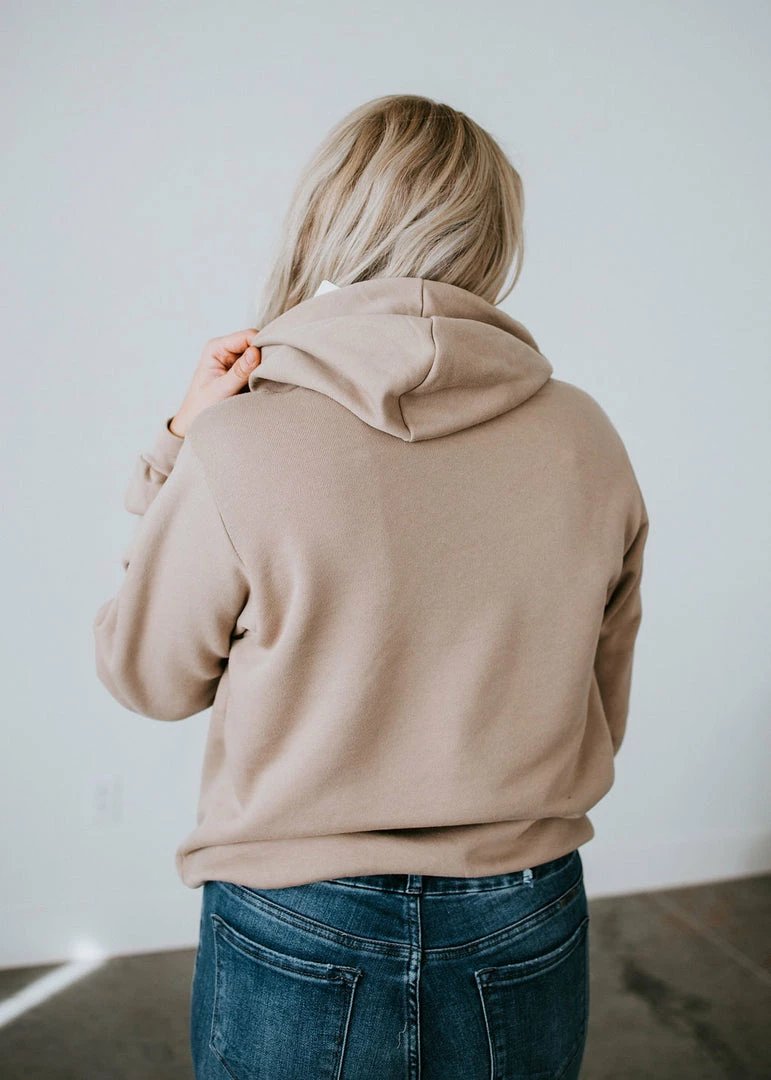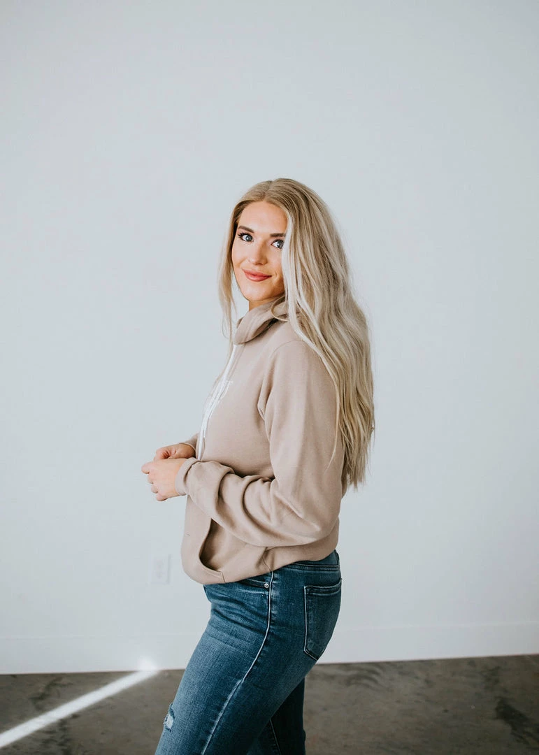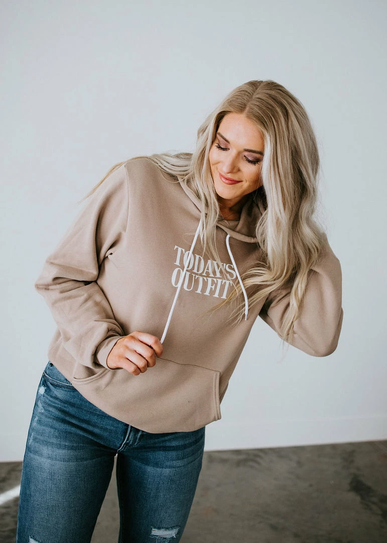 Grab for this iconic hoodie again and again! For all your casualwear needs this sweatshirt has you covered. Featuring a “Todays Outfit” quote across the chest, drawstring hooded neckline, and complete with a kangaroo pocket! Kaylor is wearing a medium.