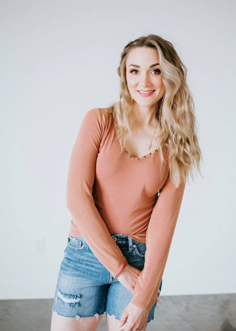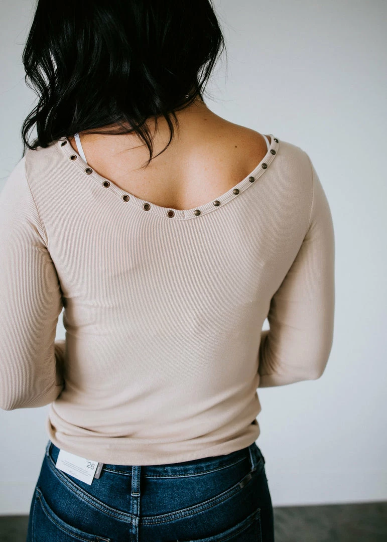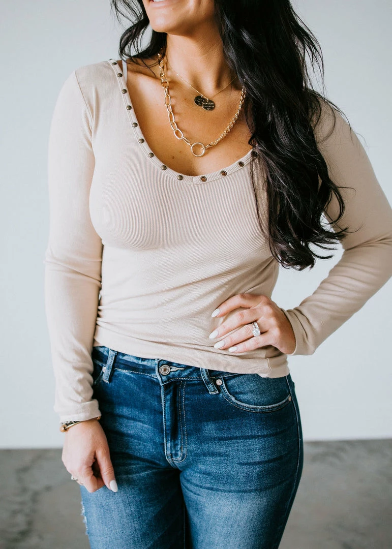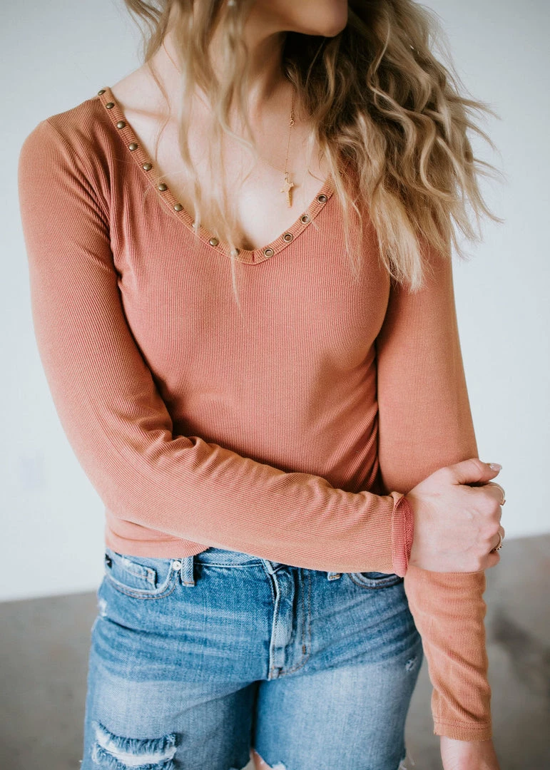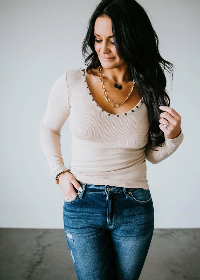 Update your closet with this essential top that serves up best-dressed vibes. Comfortable ribbed knit fabric shapes the long sleeves and body-skimming bodice for a casually chic look. Features studded details along the V-neckline in the front and the back. Laurie and Leslie are wearing a size small.