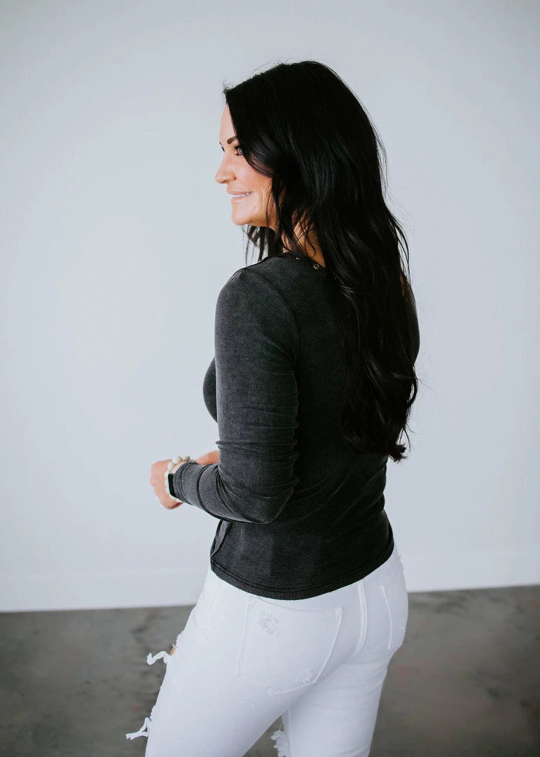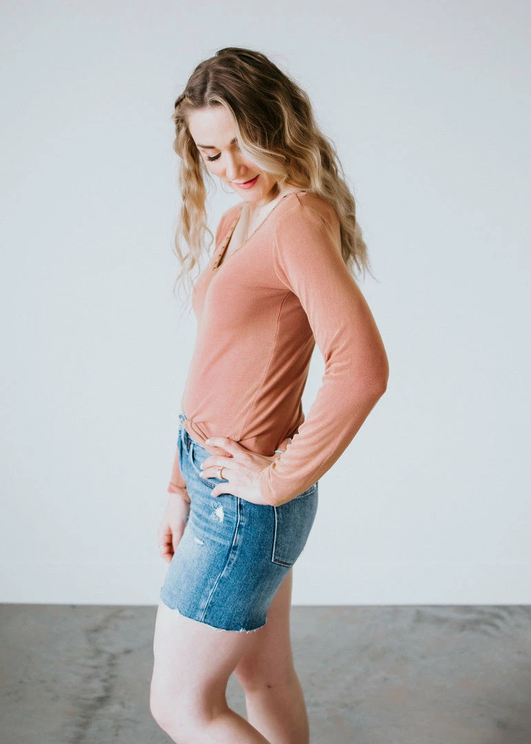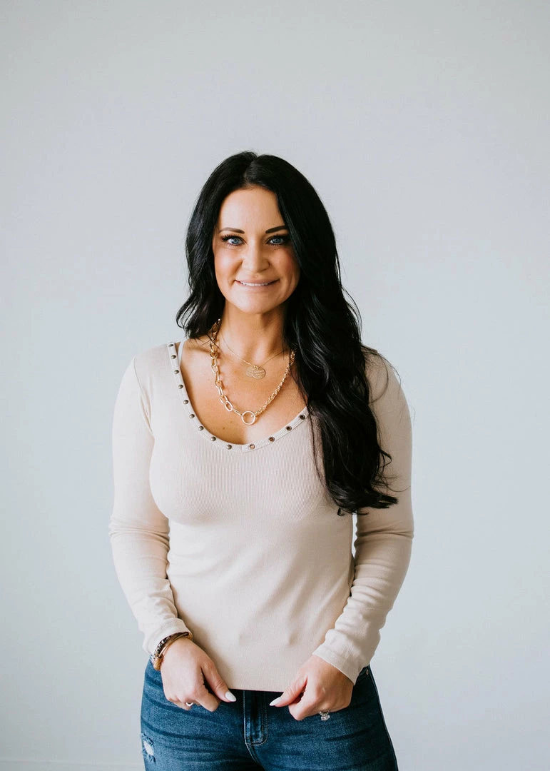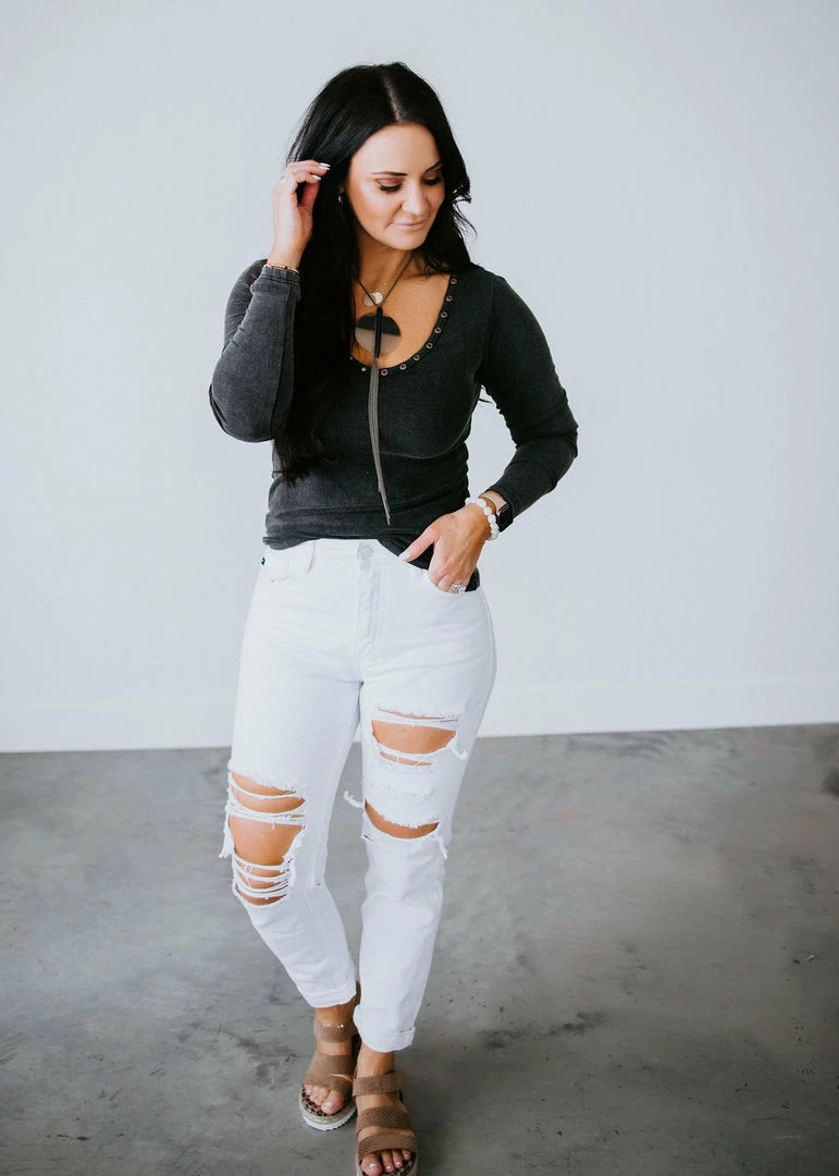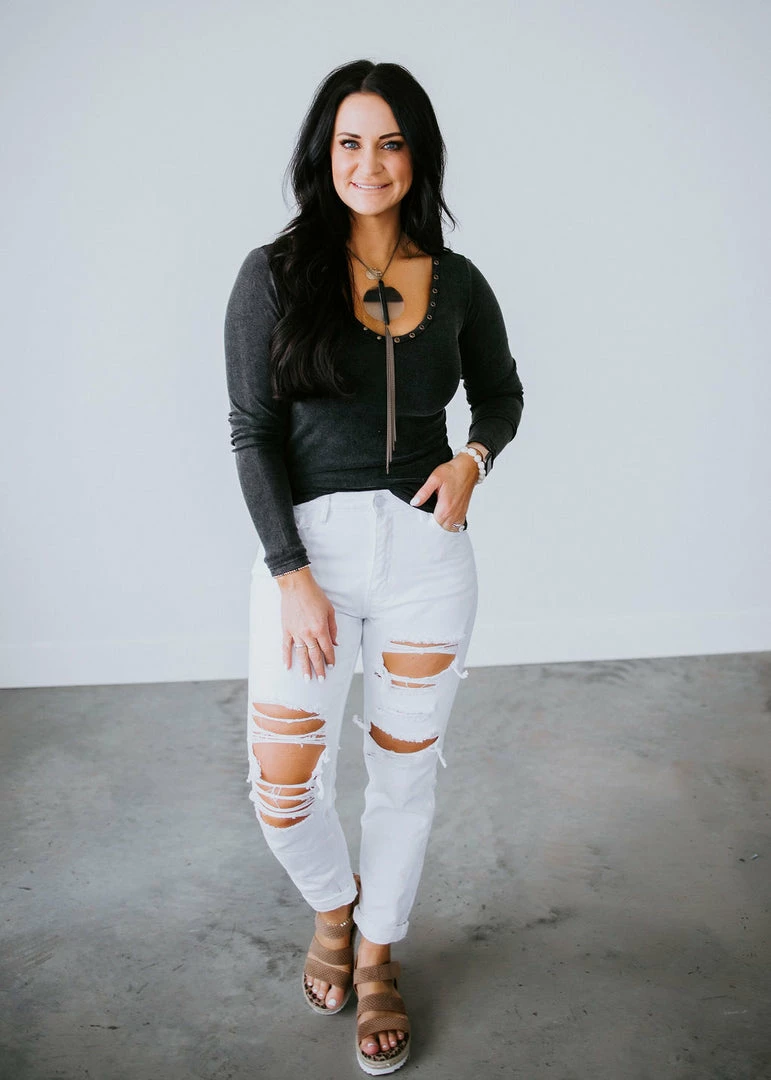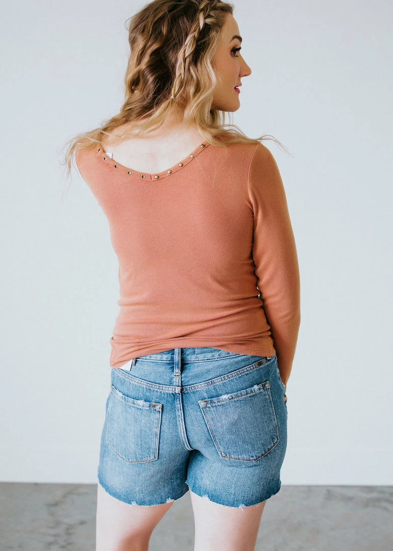 Update your closet with this essential top that serves up best-dressed vibes. Comfortable ribbed knit fabric shapes the long sleeves and body-skimming bodice for a casually chic look. Features studded details along the V-neckline in the front and the back. Laurie and Leslie are wearing a size small.