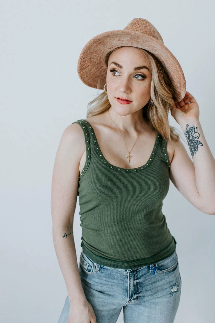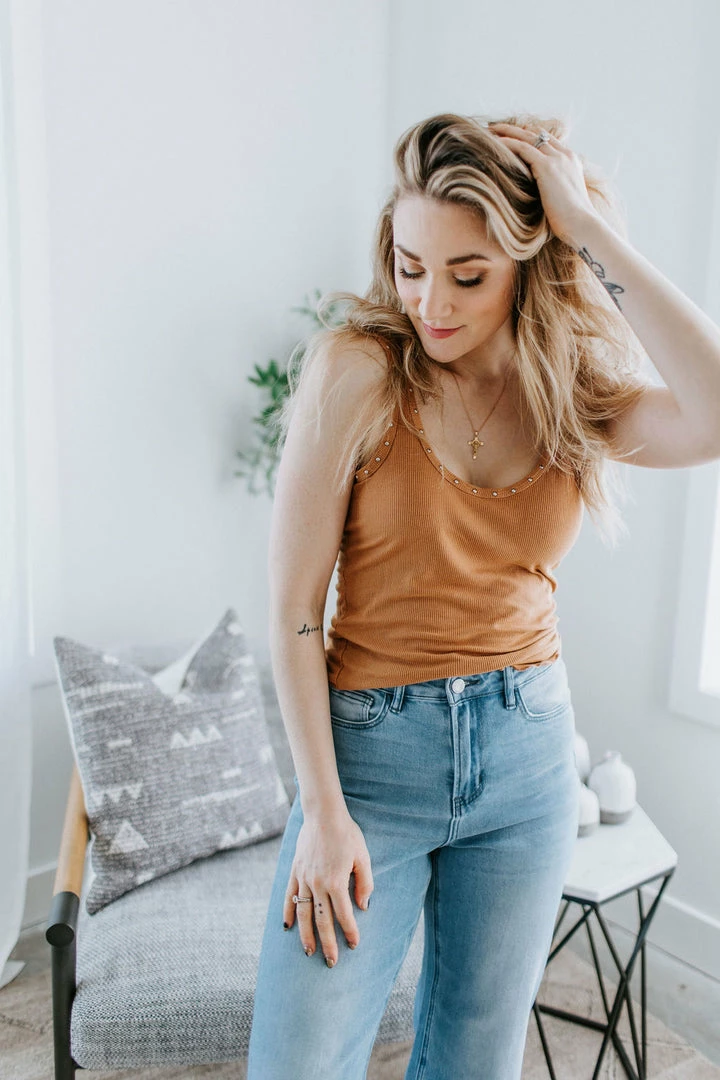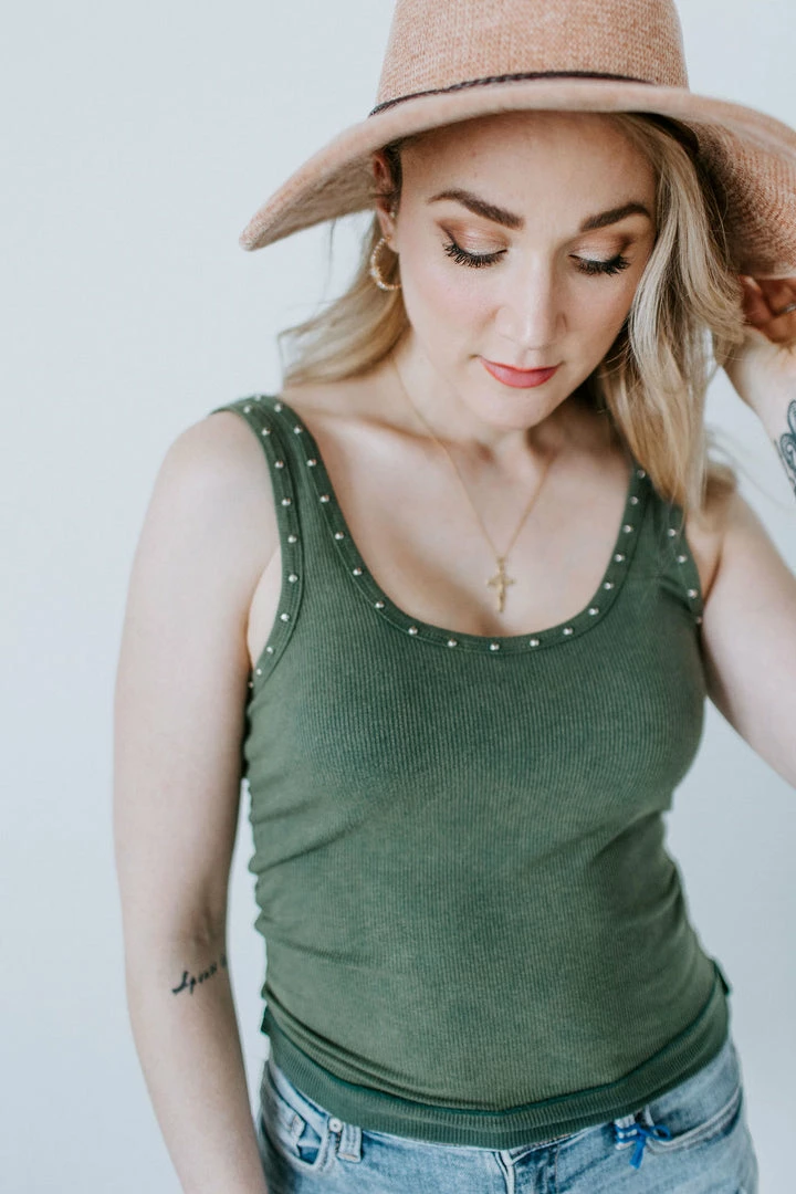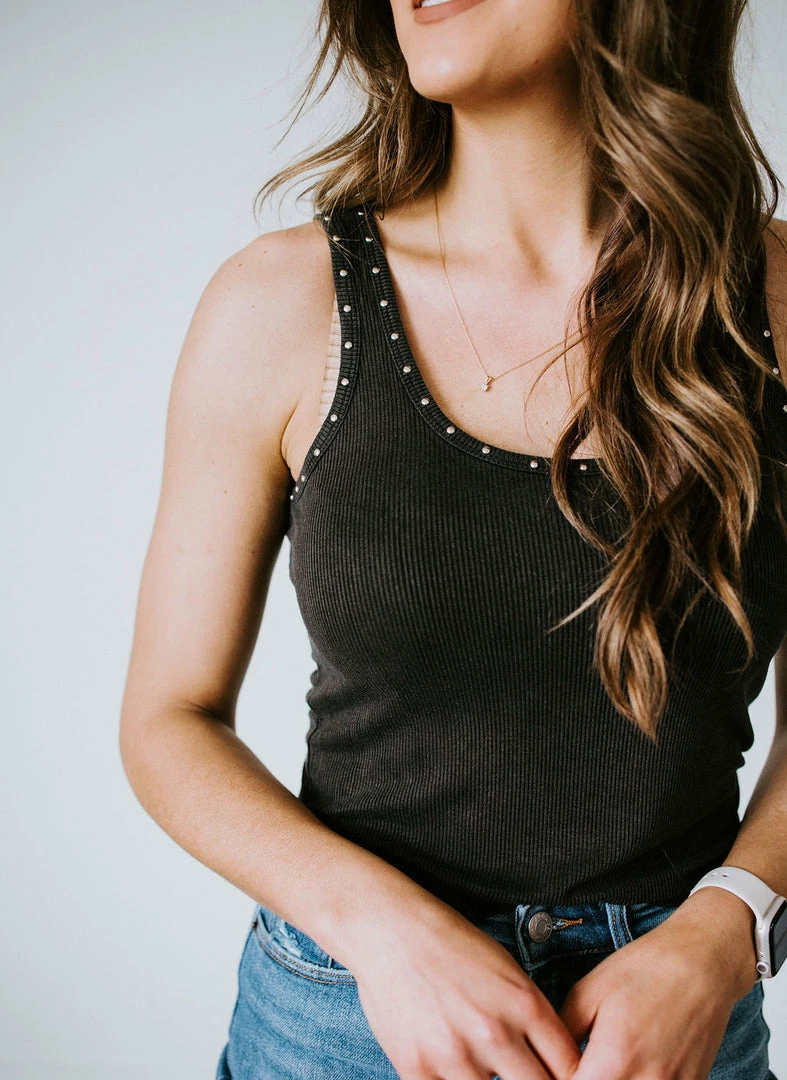 We only have room for studs and no duds! This basic tank is elevated to a whole new level with the studded detailing along the neckline and arm openings. A soft and stretchy knit fabric shapes this adorable and subtle stud tank. A perfect pair tucked into denim for an easy going out outfit. Leslie and Kara are wearing smalls.