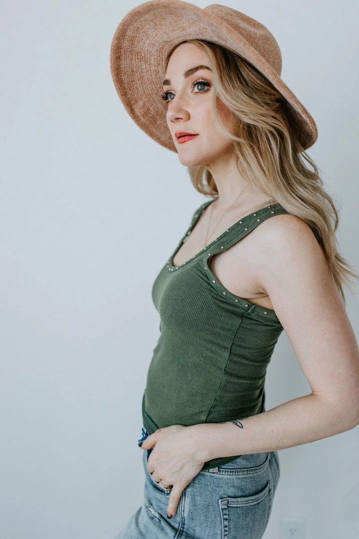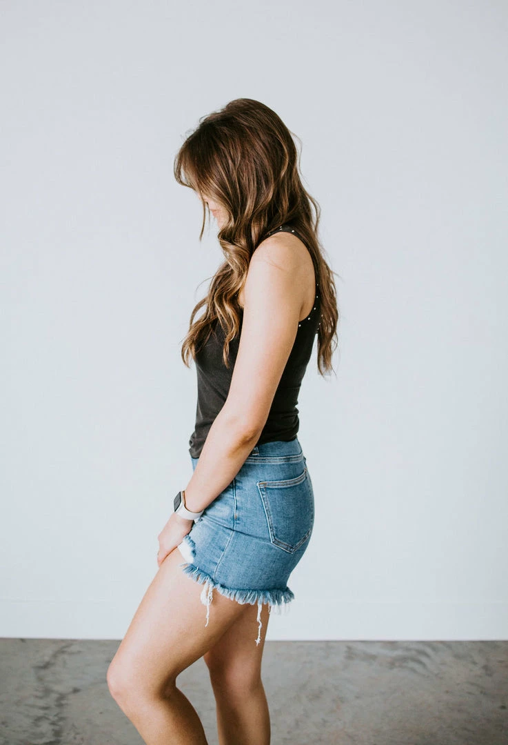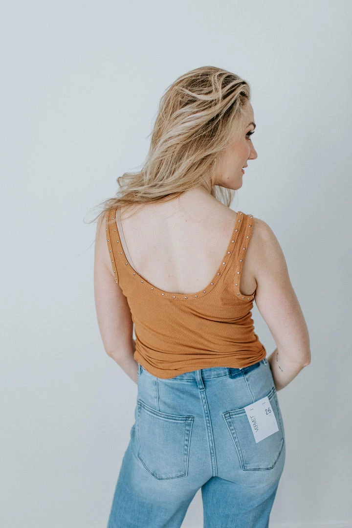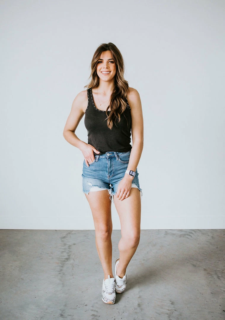 We only have room for studs and no duds! This basic tank is elevated to a whole new level with the studded detailing along the neckline and arm openings. A soft and stretchy knit fabric shapes this adorable and subtle stud tank. A perfect pair tucked into denim for an easy going out outfit. Leslie and Kara are wearing smalls.