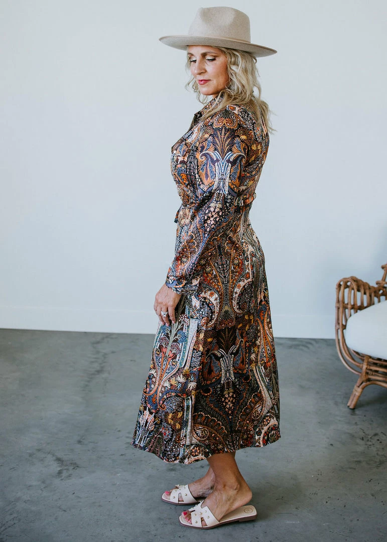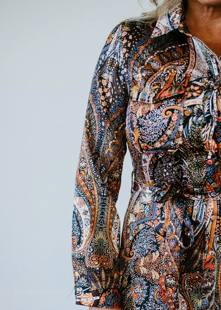 Keep ’em mesmerized with your stunning fashion sense! With an expressive paisley print throughout, this gorgeous shirtdress features a collared neckline, front button closure, and long sleeves with button cuffs. Styled with a tying sash at the waist and flap pockets at the chest. Wear with a rancher hat for an eye-catching look. Jen is wearing a size medium.