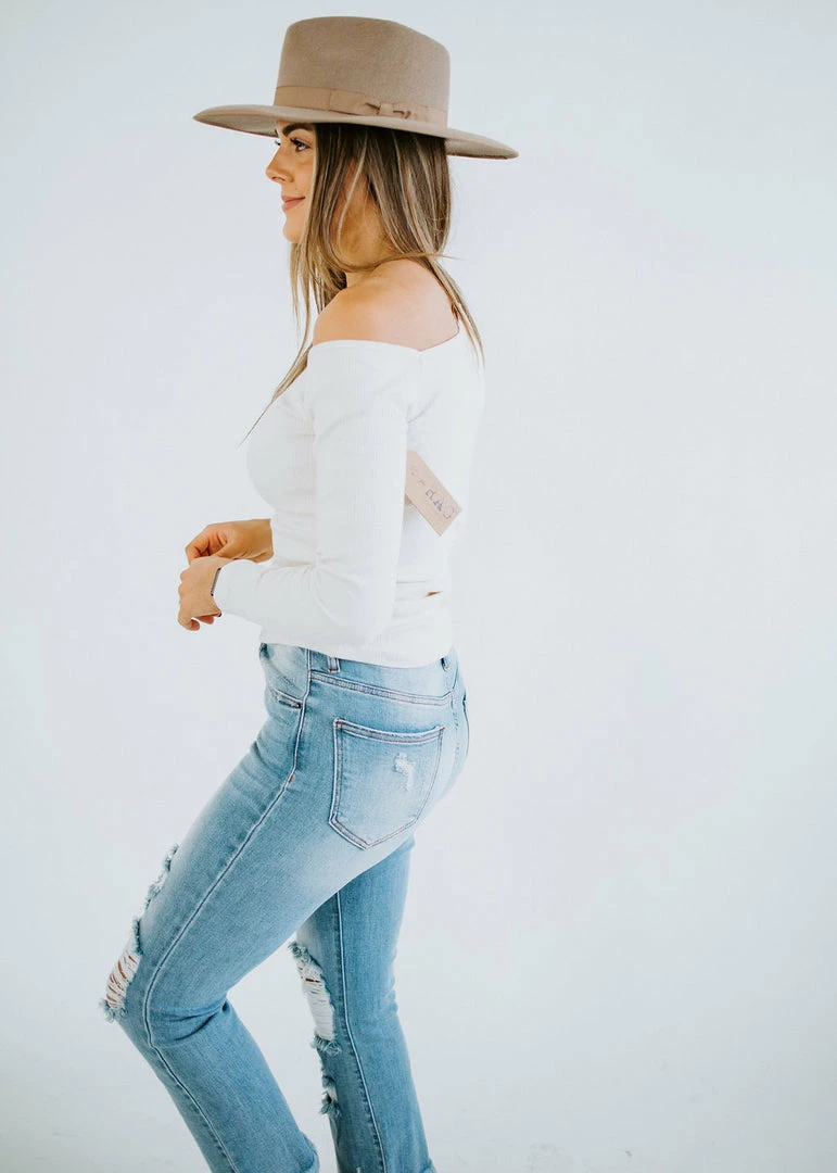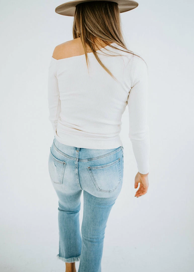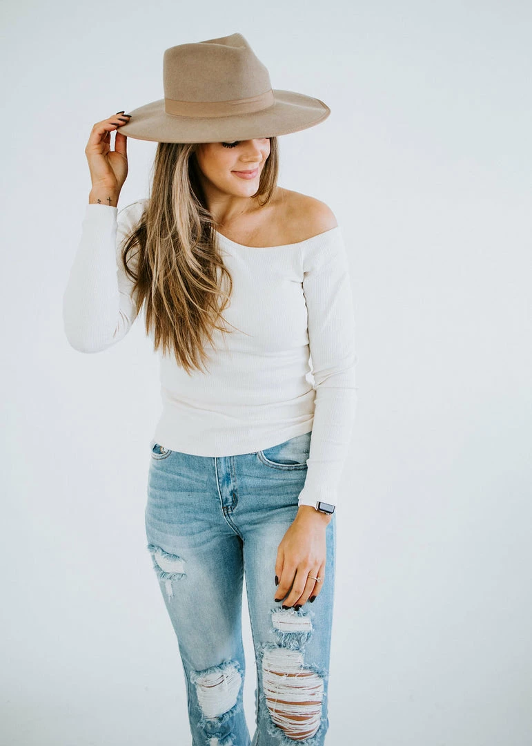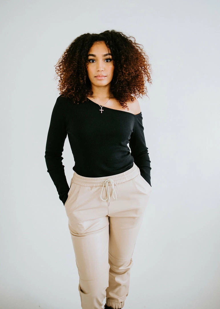 Flaunt your show-stopping good looks with this alluring top. Features a chic angled neckline design with long sleeves. Mid-weight ribbed knit shapes the fitted silhouette that pairs well with everything from trousers to jeans. Nice stretch. Cathyliana, Kara, and Baylee are wearing size small.