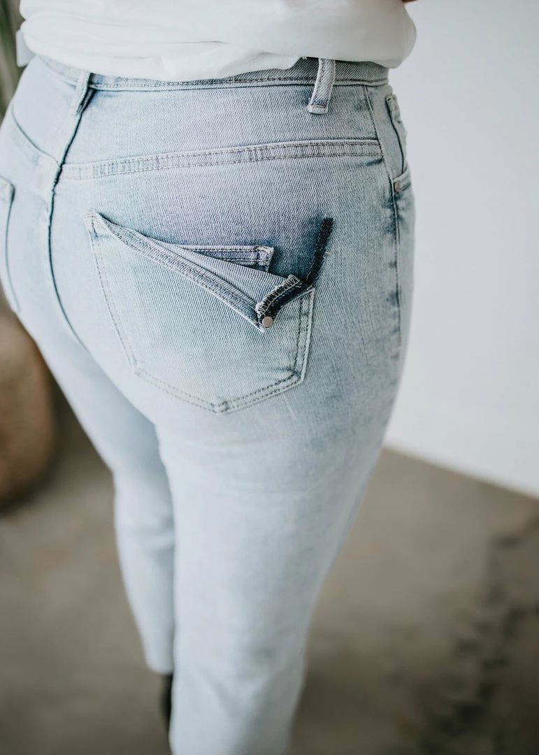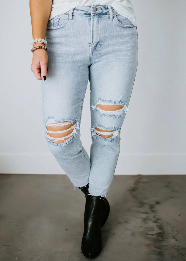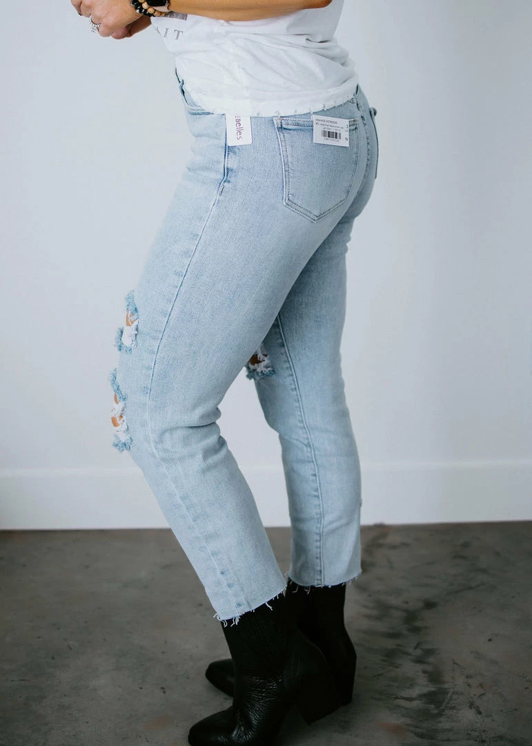 These lightly distressed boyfriend jeans are going to instantly become your go-to pair! We love them for the relaxed fit and the intentionally distressed hemline with fading and whiskering details throughout. Complete with a partially undone back pocket. Amazing stretch. Risen brand. Laurie is wearing a 3. If between sizes, you could size down.