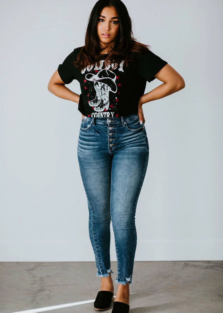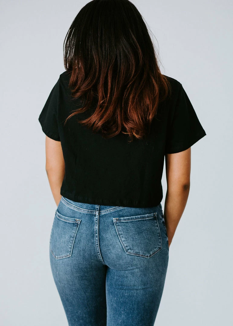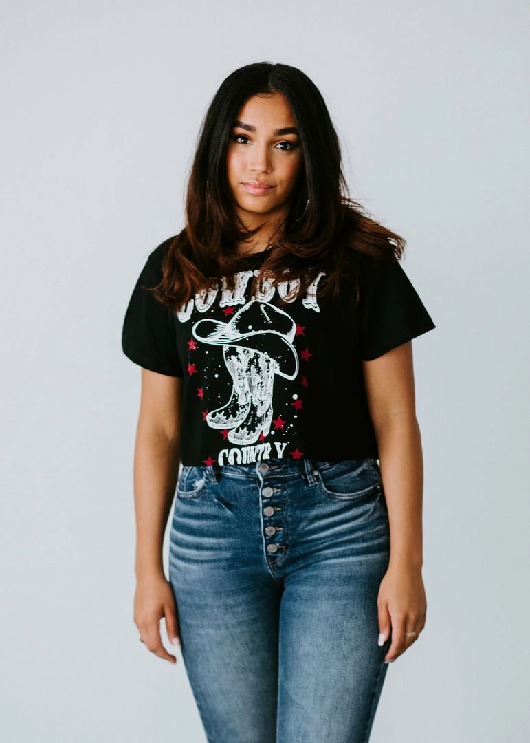 Yeehaw, ya’ll! This ‘lil crop top features a crew neckline, short sleeves, and a relaxed fit. Styled with a cowboy country graphic and finished with a cropped hem. Cathyliana is wearing a small.