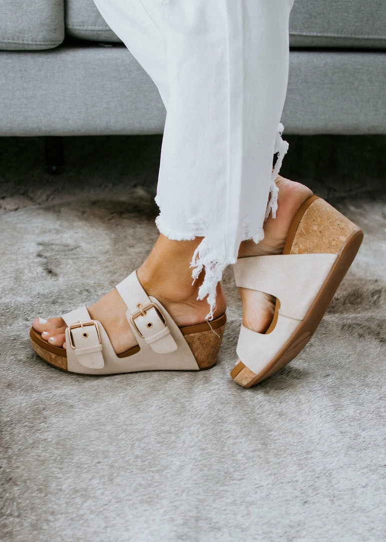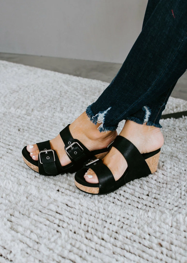 Give your looks a boost with the Laurie Wedge Sandal by Very G. Features slip-on styling with two straps, adjustable buckle closures, and a cork wedge. Pairs perfectly with all your summer-ready outfits.Â