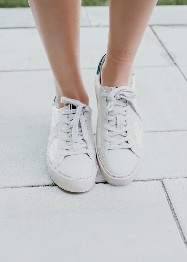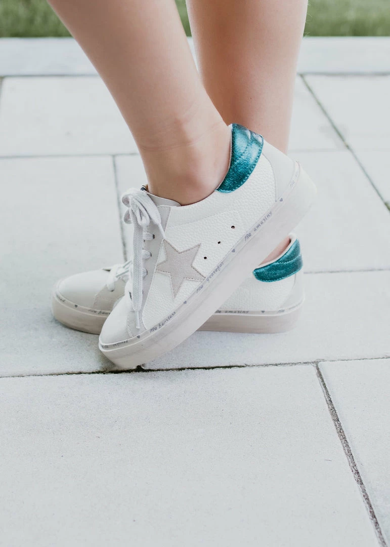 When you wish upon a star, your sneaker dreams come true! These retro-inspired beauties feature synthetic leather construction set atop a chunky, distressed sole. Styled with a star accent, a pearlescent side panel, and green metallic detail at the heel cap. Features inspirational messages (be yourself, be inspired, be fearless, be grateful) at the midsole. Pairs well with everything from shorts to dresses!