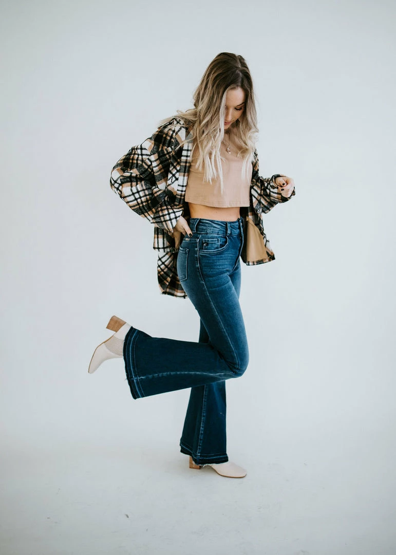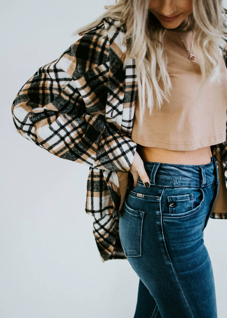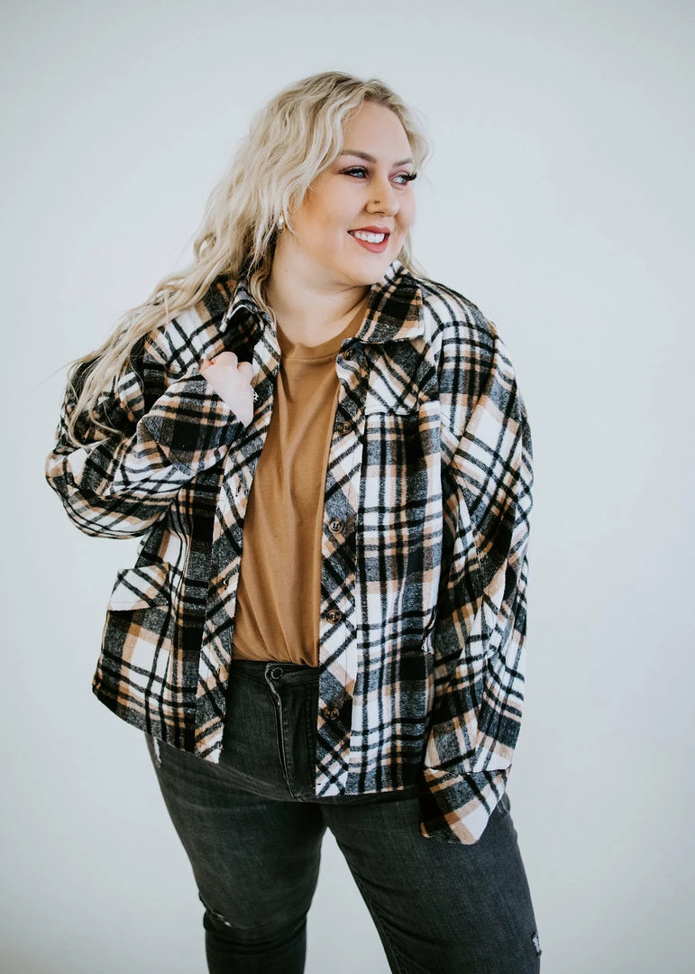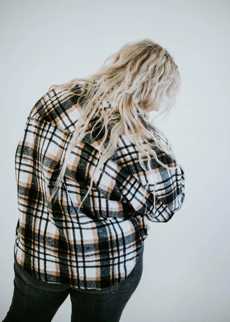 Brushed plaid fabric shapes the relaxed silhouette that pairs beautifully with a turtleneck and jeans. Features a collared neckline, two front pockets, and a rounded high-low hem. Fits oversized. Loghin is wearing a large and Baylee is wearing a small.