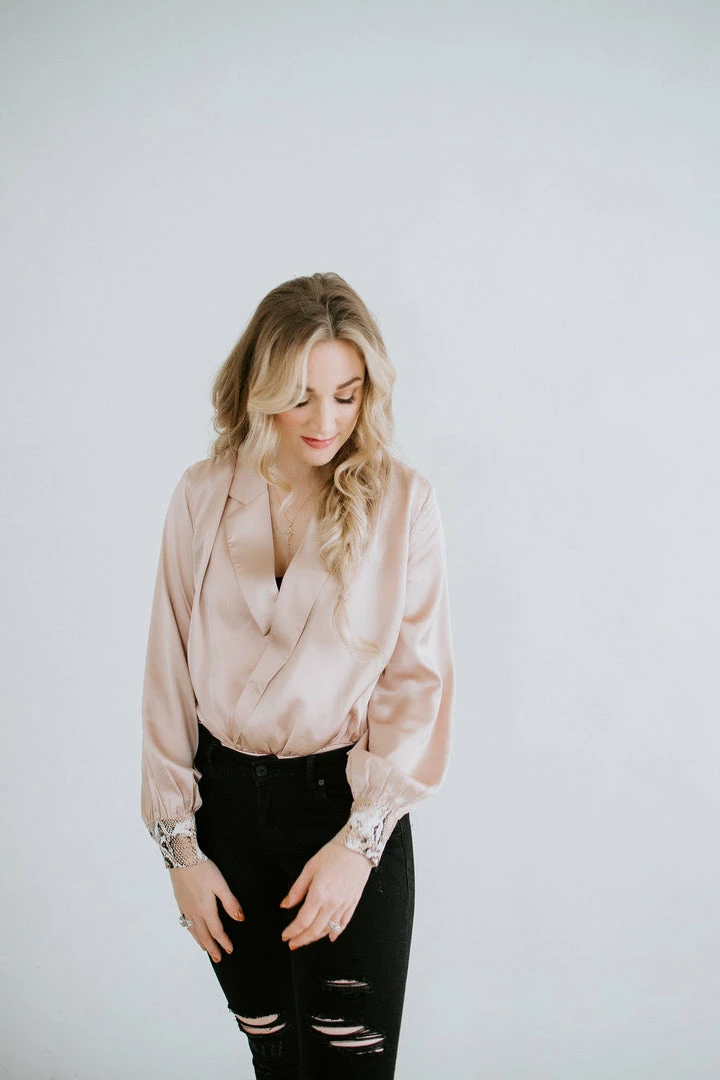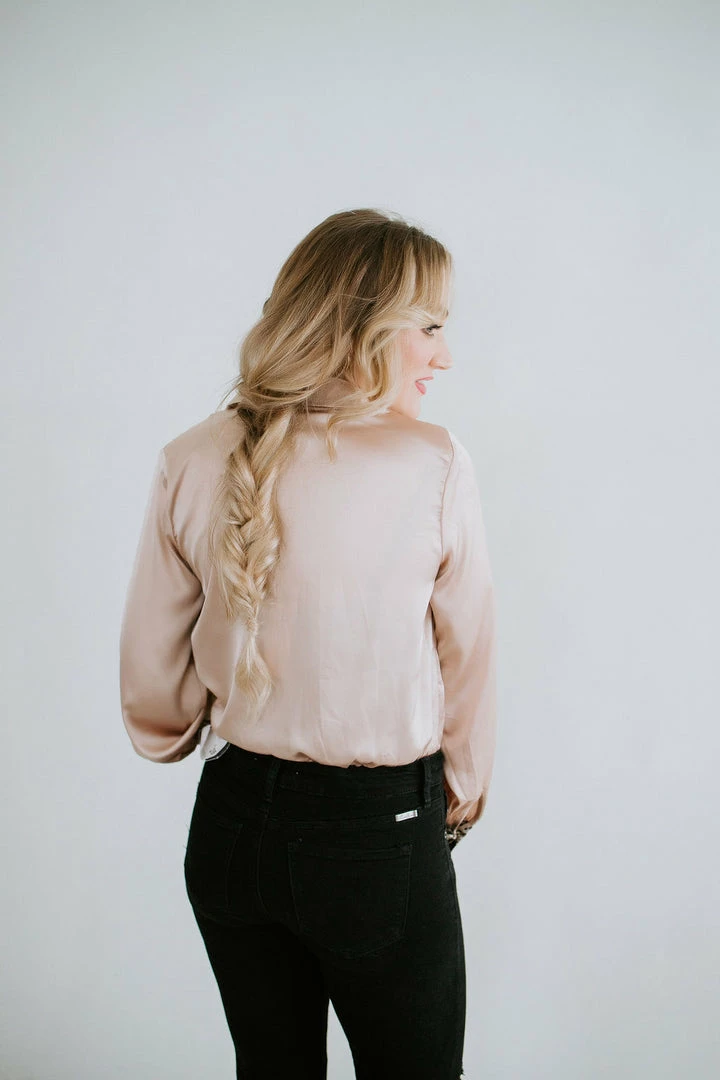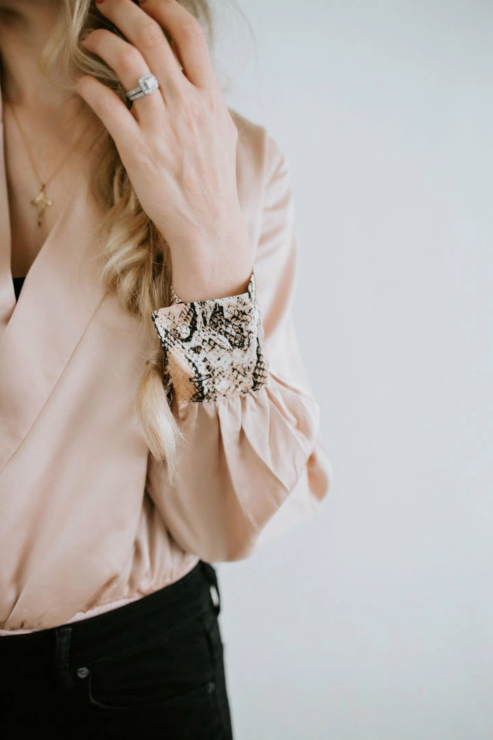 This is your moment to take the spotlight with the Lettie Satin Bodysuit! Sleek knit satin shapes a deep V-neckline, a snap button closure at the chest, and shoulder pads to keep that flattering fit. With a snakeskin pattern cuff for added texture and sass. Attached thong bottom with snap button closures. Leslie is wearing a small.