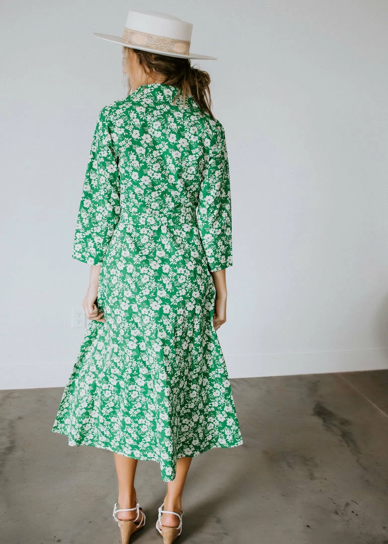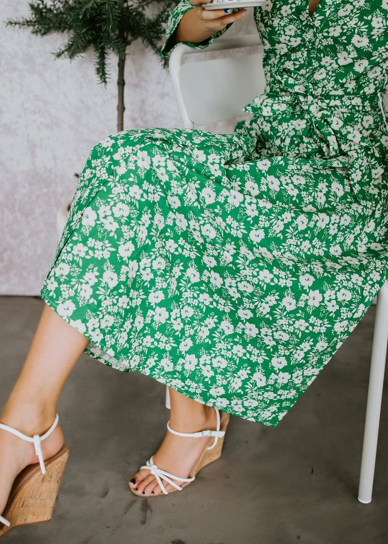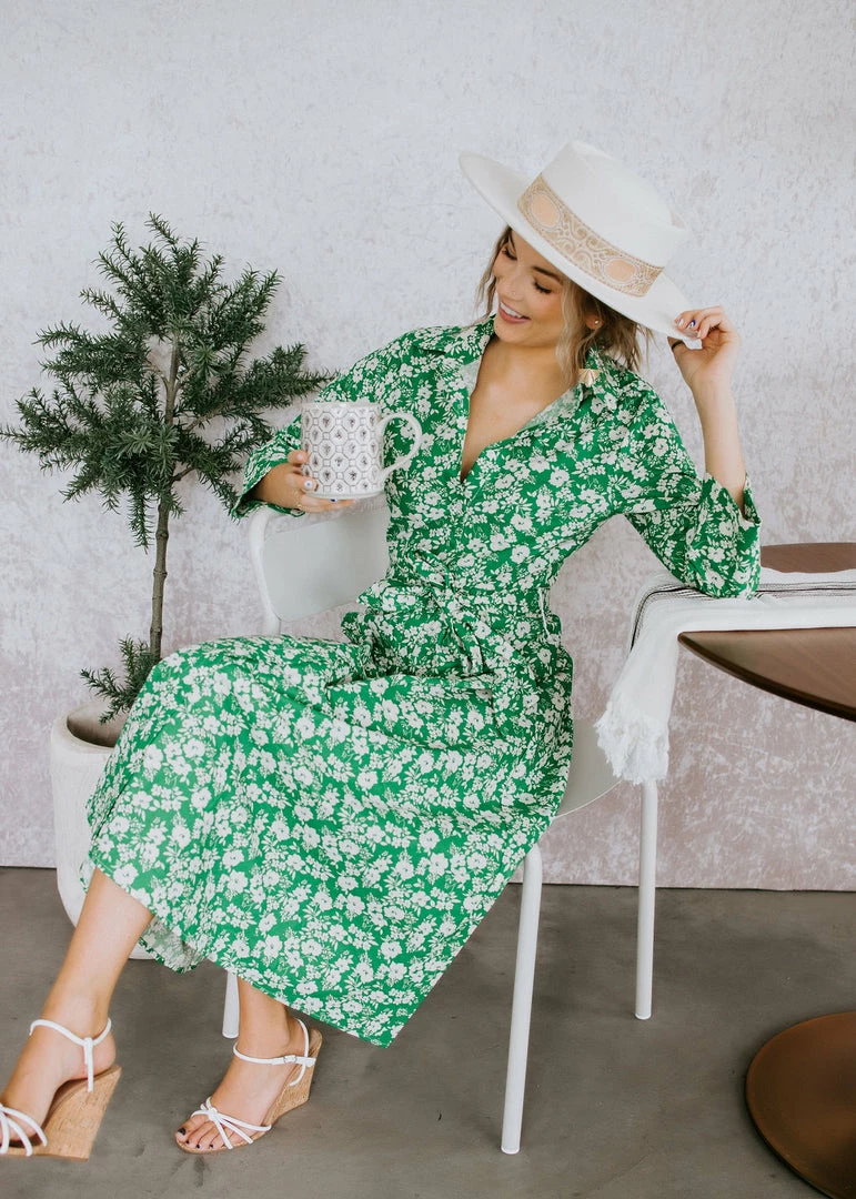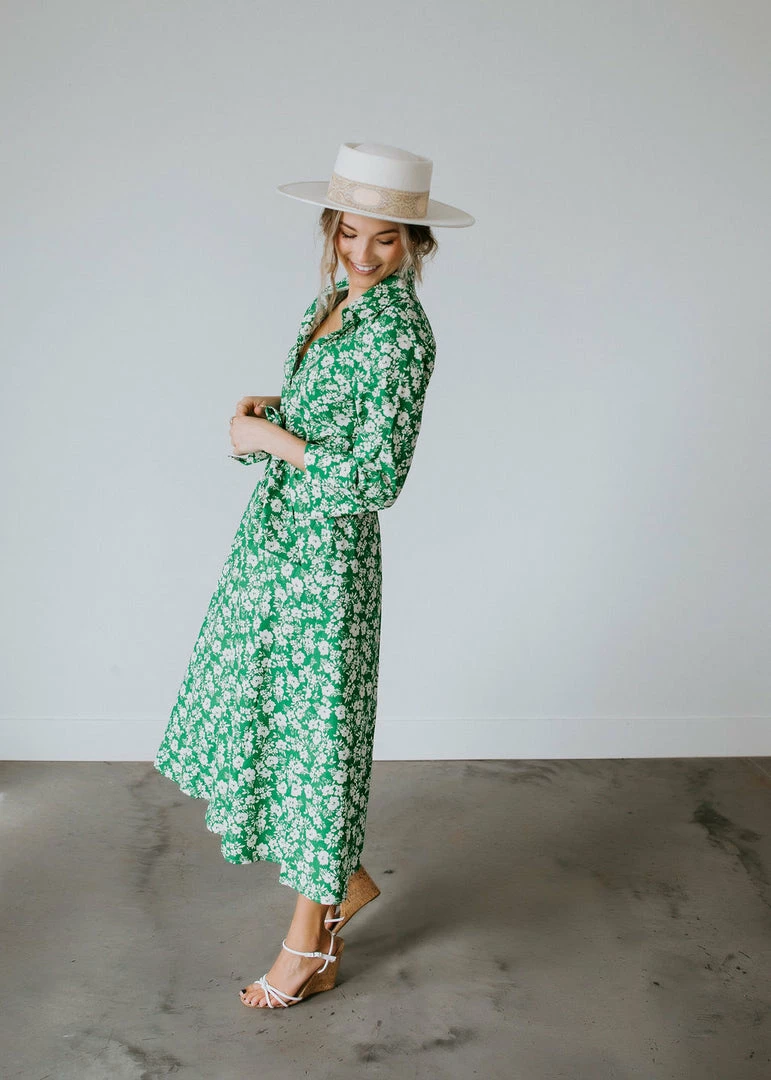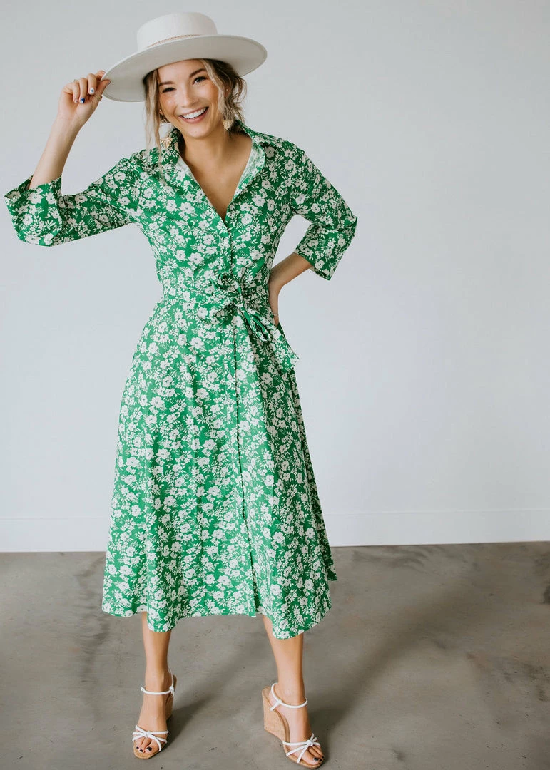 Add a breath of fresh air to your wardrobe with the Bright Side Button Down Midi Dress! Features a high, collared neckline, and straight sturdy cotton sleeves, complete with a button up front with floral print all-over. Tying waist (with internal ties) sits above a breezy wrap midi skirt. Baylee is wearing a small.