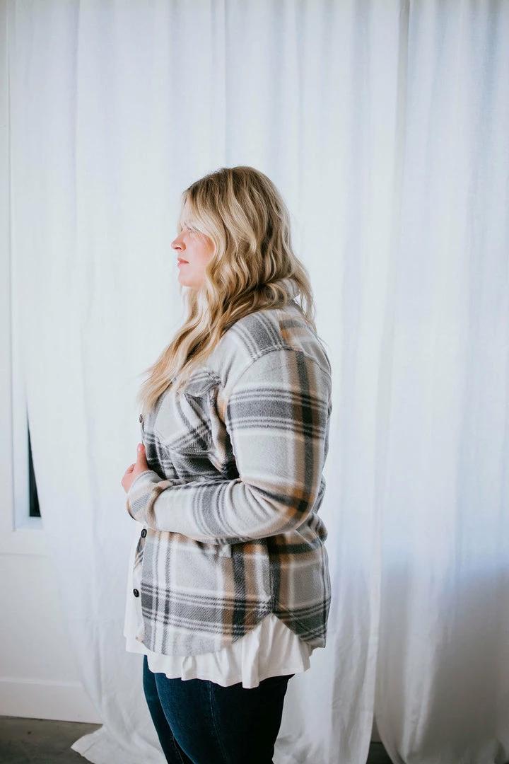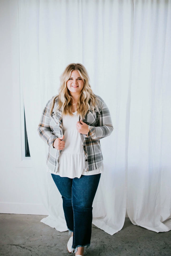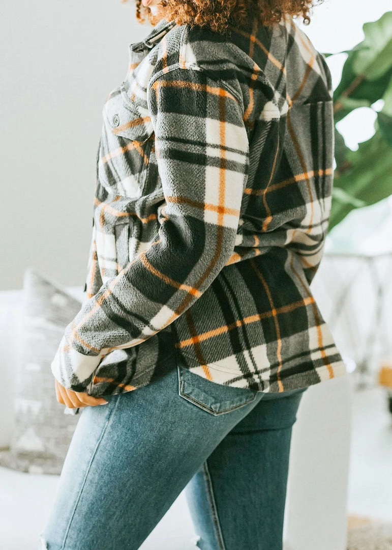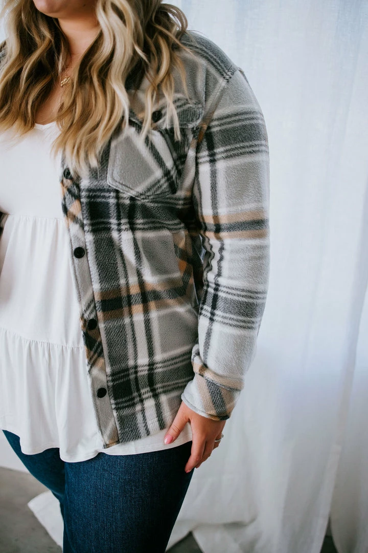 Cooler temps mean it’s time to break out your coziest plaids! This must-have shacket is the perfect option for staying stylish and comfortable this season. Made from ultra-cozy brushed fleece fabric with a collared neckline, dual front pockets, and button front closure. Long sleeves, button cuffs, and a shirttail hem complete the look. Hannah and Loghin are wearing a size large. Cathyliana is wearing a size small.