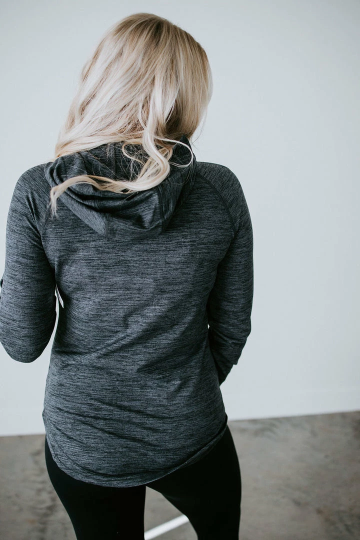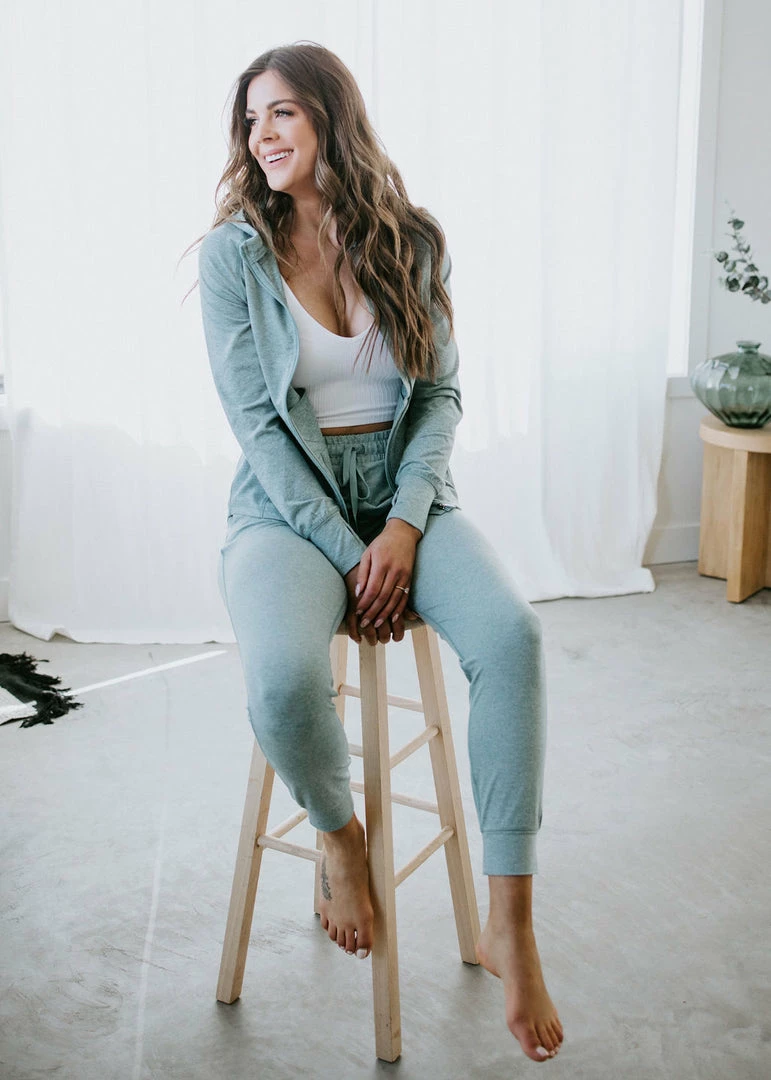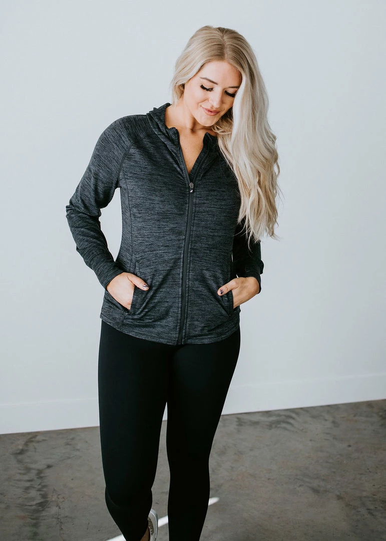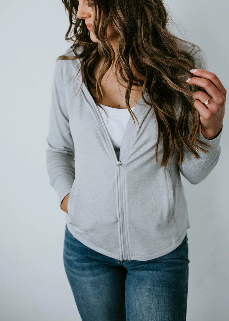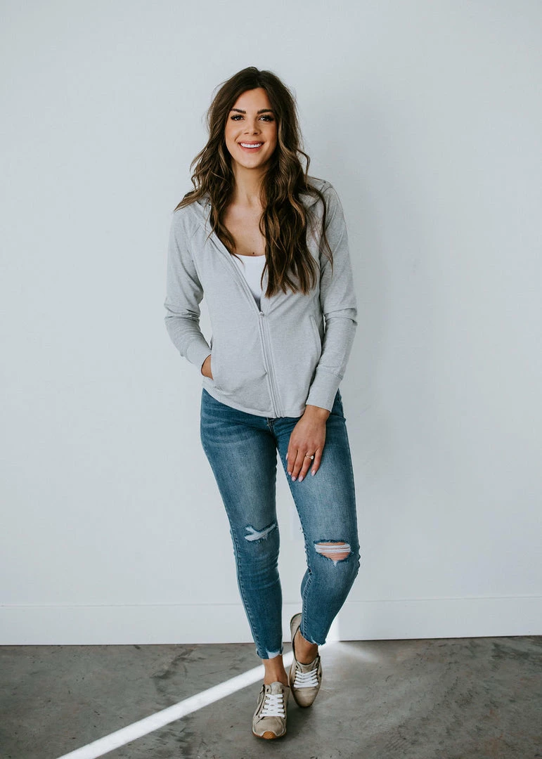This solid zip-front hoodie is a great go-to for easy, all-day styling. A simple, fitted silhouette features a hooded neckline, and zip front closure, with side pockets for on-the-go essentials. A casual, athleisure style you can wear every day. Pair with the matching Lax But Not Least Jogger for a sporty fit. Kara is wearing a small and Kaylor is wearing a medium.