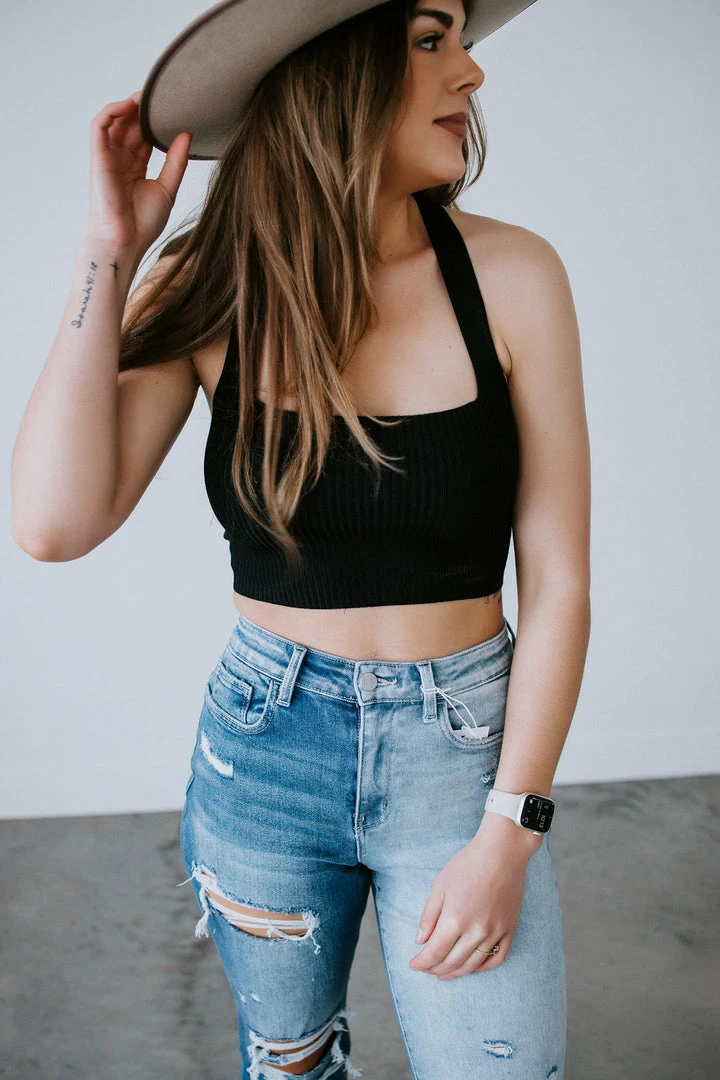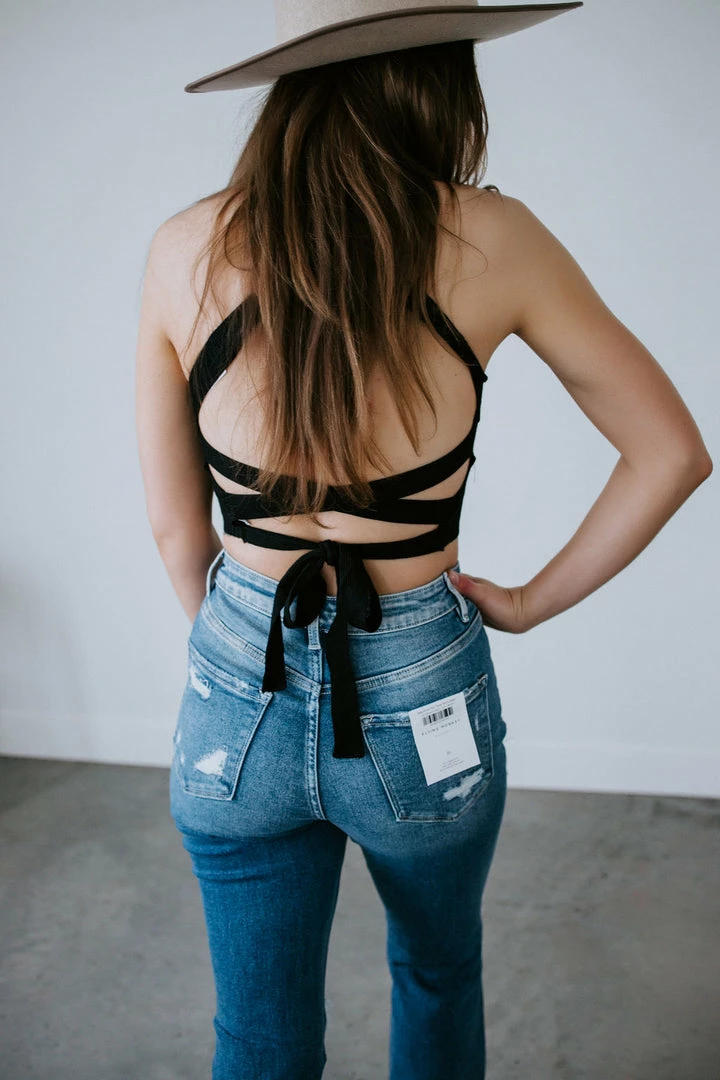 You’re stepping into trend-setting territory when you’re sporting this tank! Ribbed knit shapes the pull-on design with a square neckline, fitted bodice, and cropped hem. Styled with a tie detail and straps that criss-cross in the back. Pair with jeans for an alluring look! Kara is wearing a small.