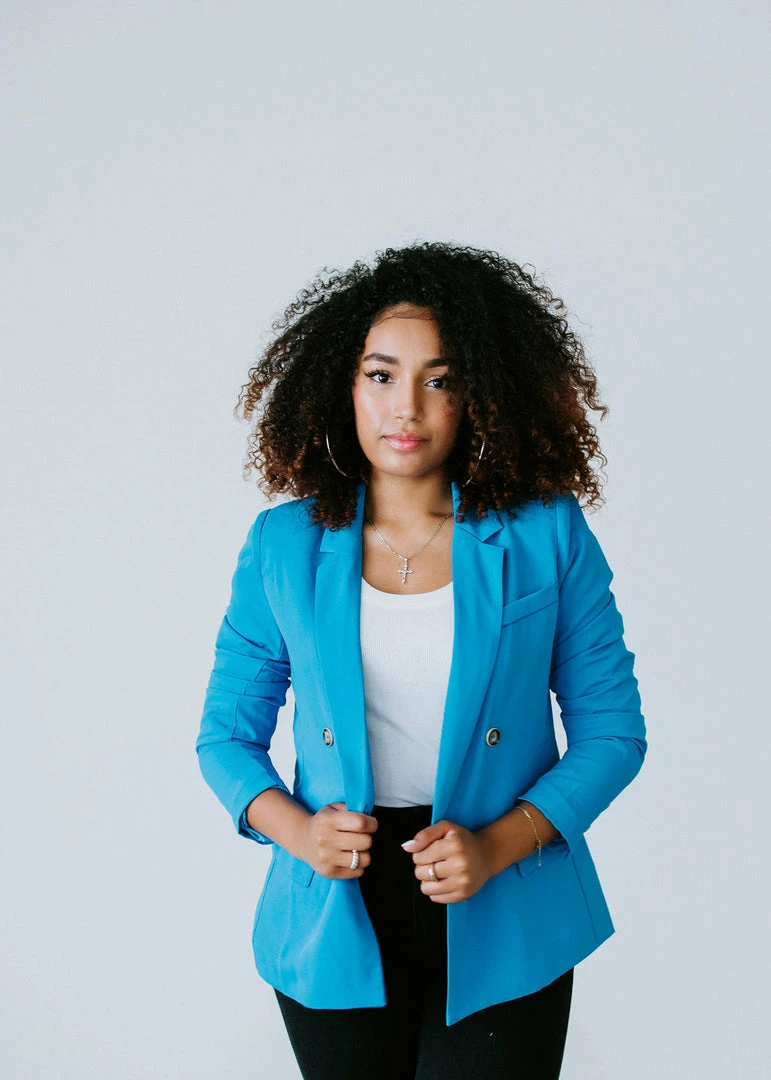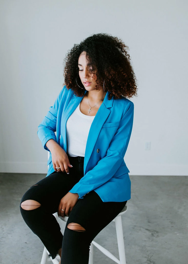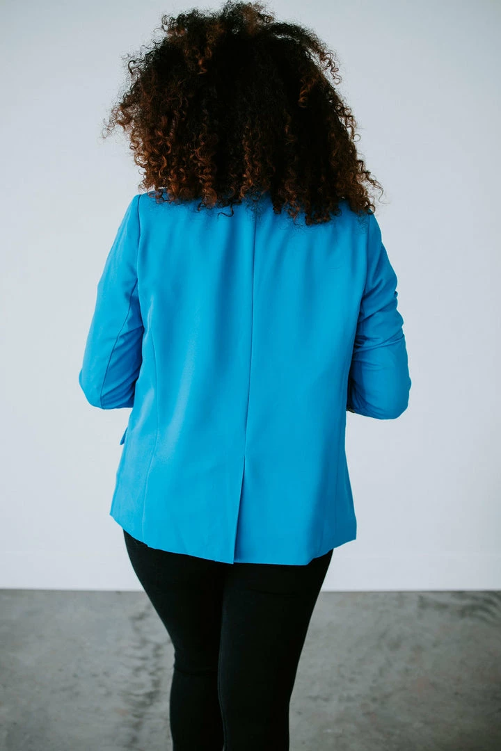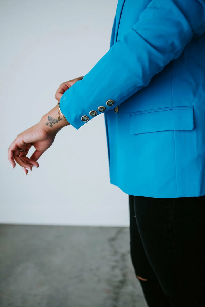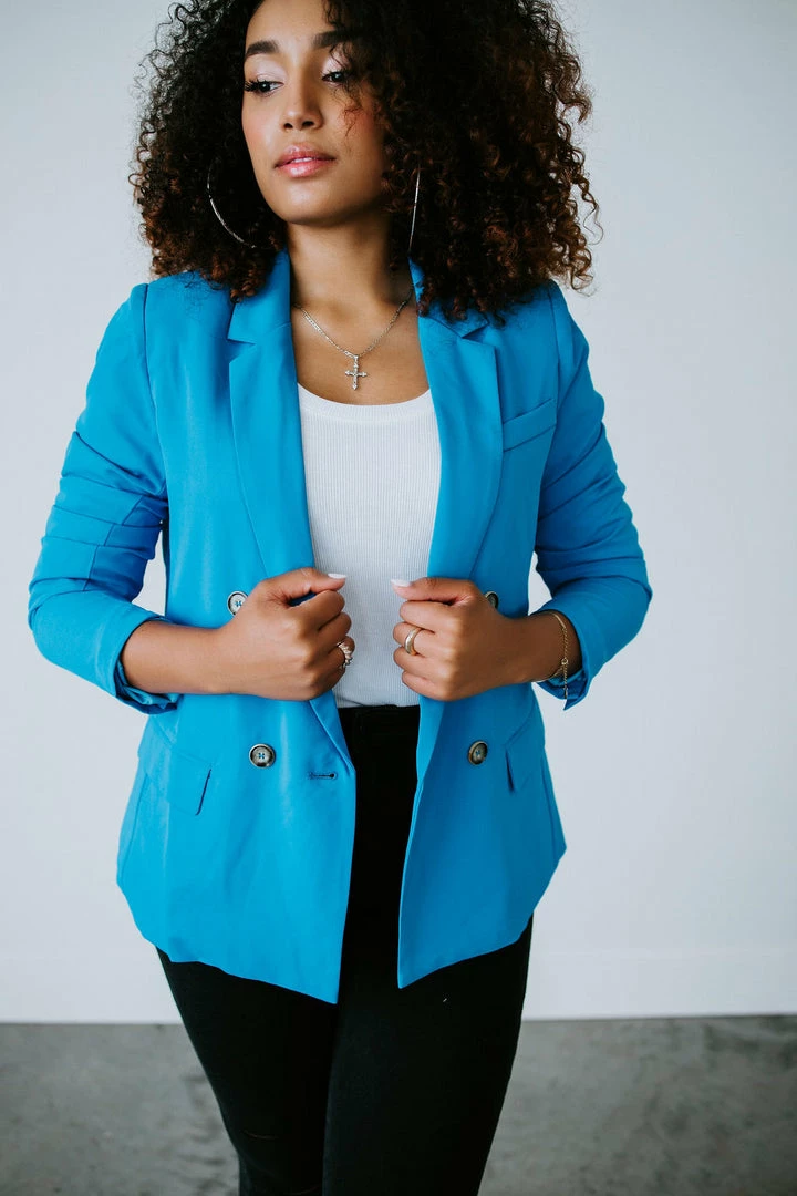 Perfect your style game with the Play It Right Blazer. Features a notched lapel, shoulder pads, and a double-breasted front. With flap pockets, a back vent, and decorative buttons at the cuffs, it delivers an always-polished look. Wear it to work or out with friends – such a versatile layering piece for summer! Lined. Cathyliana is wearing a small.