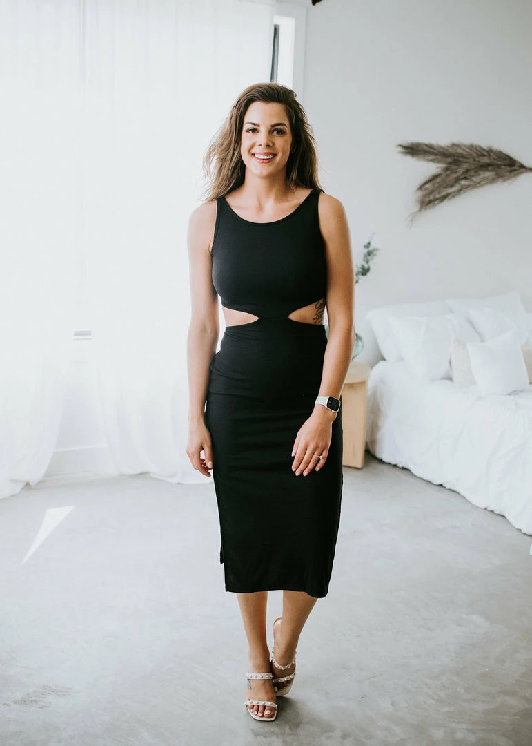 Fit to perfection, this curve-hugging dress will wow any crowd. Features side cutouts, a rounded neckline, and stretchy ribbed knit fabric. Throw on heels to make an instant impression. Kara is wearing a small.